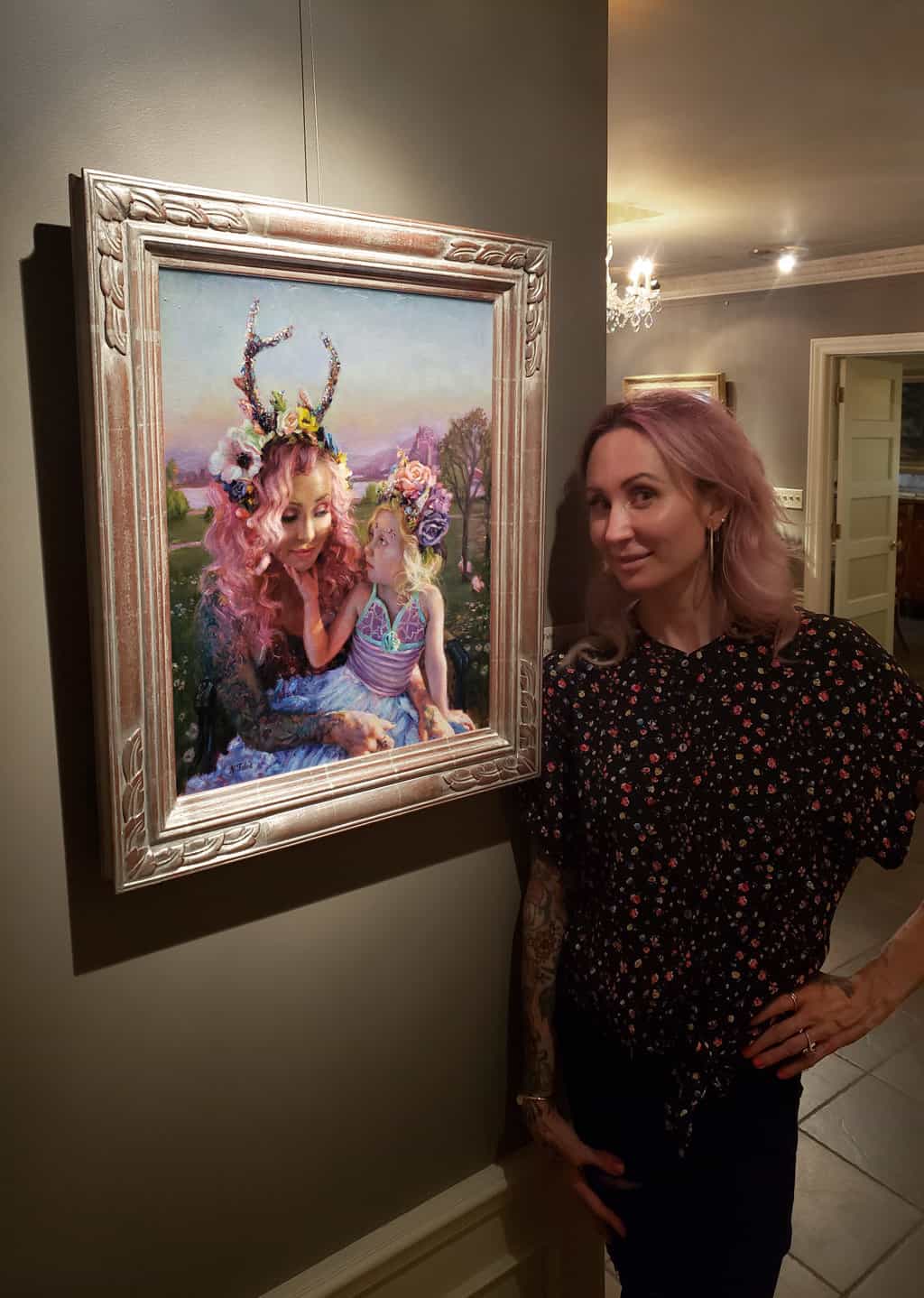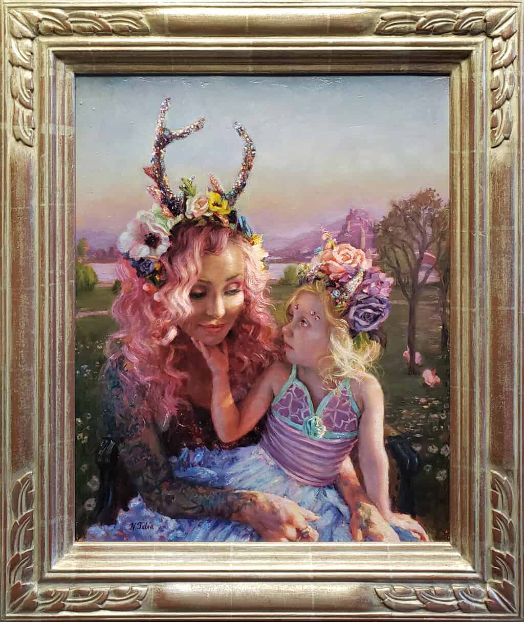 “My painting, Mother and Child, is a depiction of my daughter and I, inspired by whimsical themes we both enjoy. Studying Pre-Raphaelite paintings, Mother and Child evokes rich Roman Catholic iconography. Poland has this imagery everywhere, as it is home to Our Lady of Czensztochowa. As I am Polish, I draw heavy affection for this imagery. While creating this work I kept this Agatha Christie quote in mind: