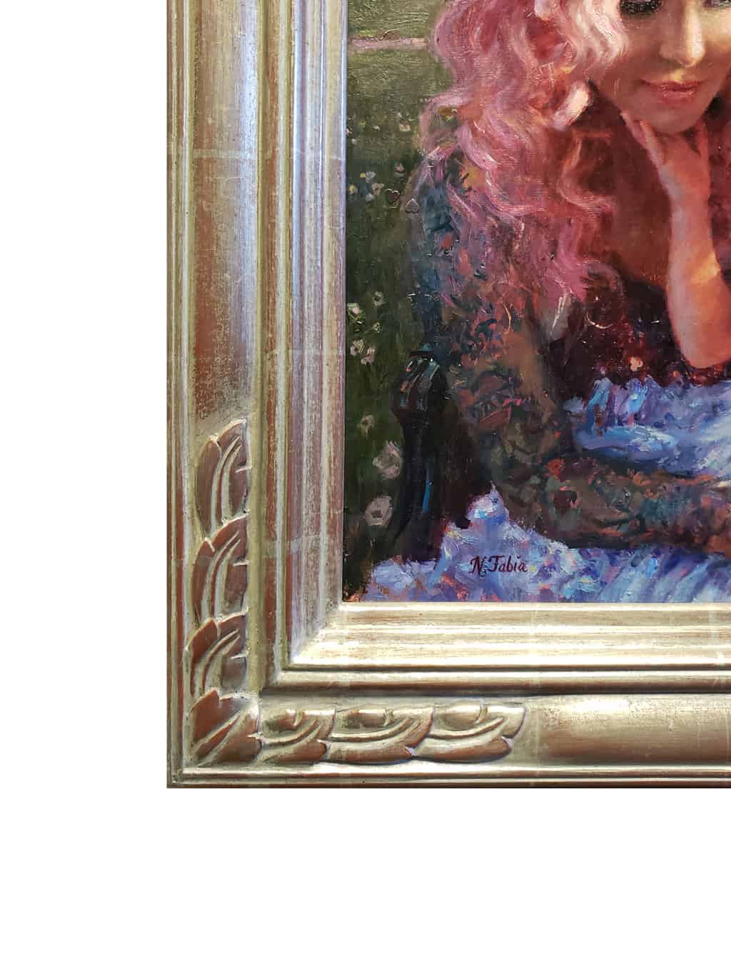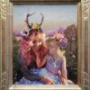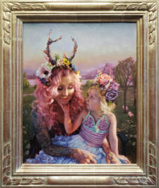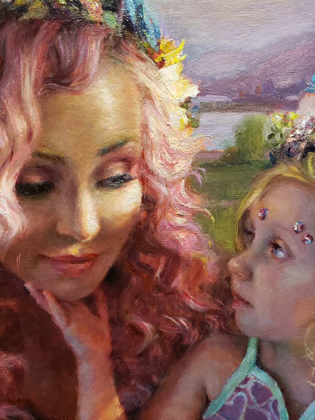 In this painting I’ve chosen to portray us outdoors in a dreamlike setting, using vivid colors, lighting and environment. I’ve applied gold and pearlescent paint in the foundation layers which peek through at times. In choosing a pose—her hands touching my face, I hope the viewer sees the love and bond that we share.”
