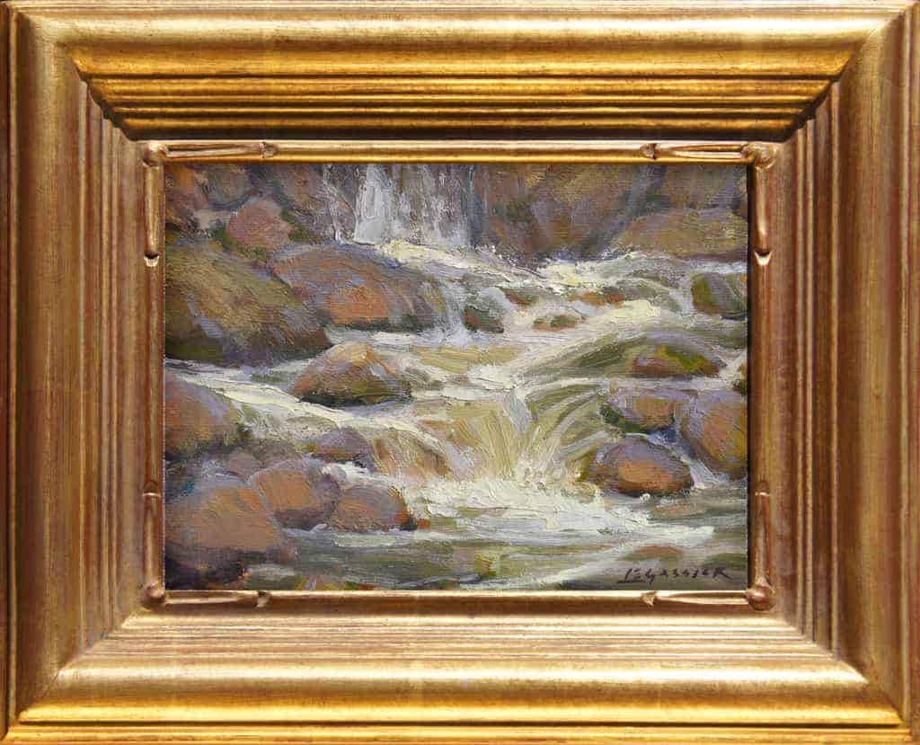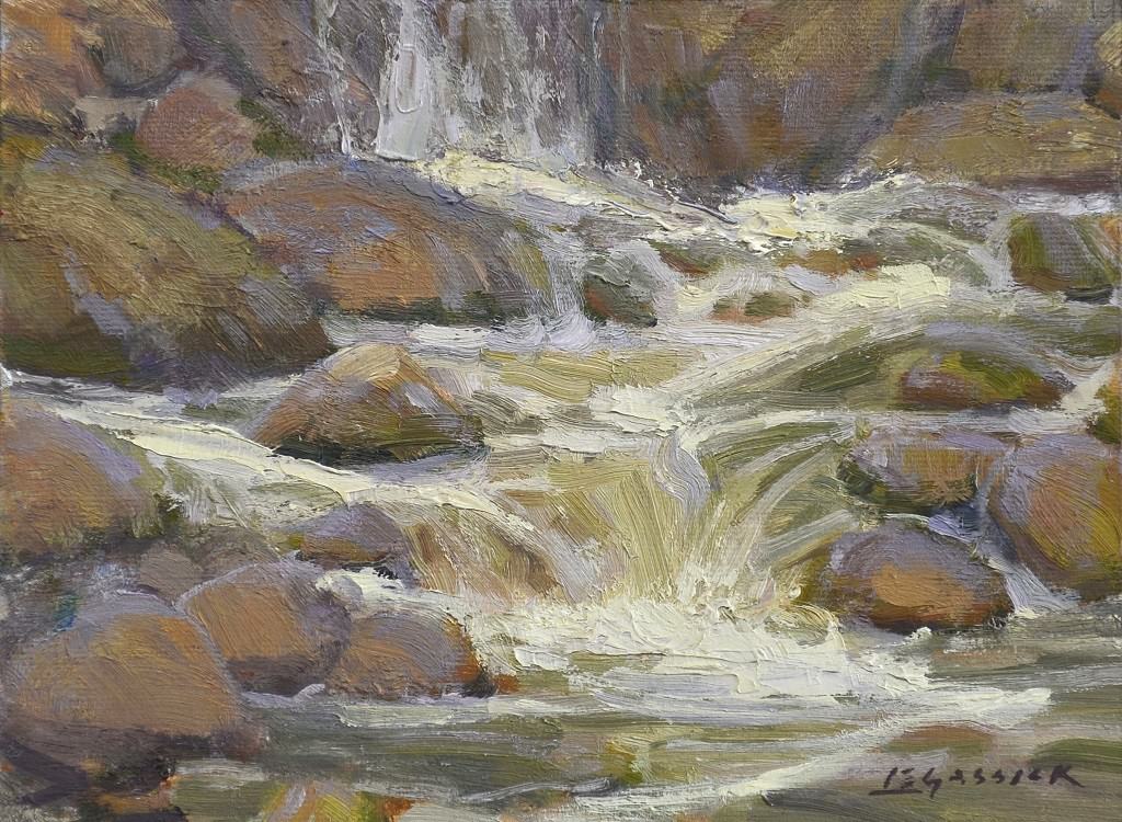 “Streams have always interested me as a subject-- the colors through the water fascinate me, not to mention they are usually very pleasant places to hang out for a few hours. In this piece, I was trying to catch the flow and cascade of the water over the rocks in this little stream in Washoe Valley, Nevada, and while painting it realized how lovely the water sounded-- that it wasn’t just visually stimulating-- but other senses came into play while painting, too; hence the title!”