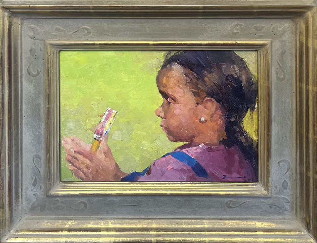 “For centuries, Native American tribes have used rattle drums in powwows, ceremonies, and rituals. These instruments have become symbols of music, dance, medicine, and spirituality in Native American culture. This painting captures a young girl joyfully playing the rattle drum, reflecting the deep cultural significance of this tradition.”