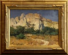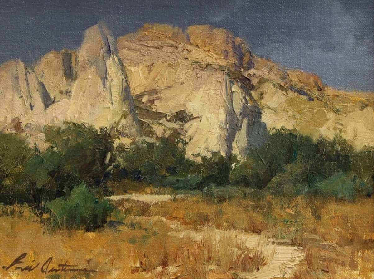 Artist Statement ''Tuffa stone cliffs, juniper and oak brush collect in the drainages in the ranching country near Kirkland, Arizona. Dark skies and late afternoon sun peeking underneath the clouds light up this rugged landscape affording the painter wonderful contrasts of color temperature.''