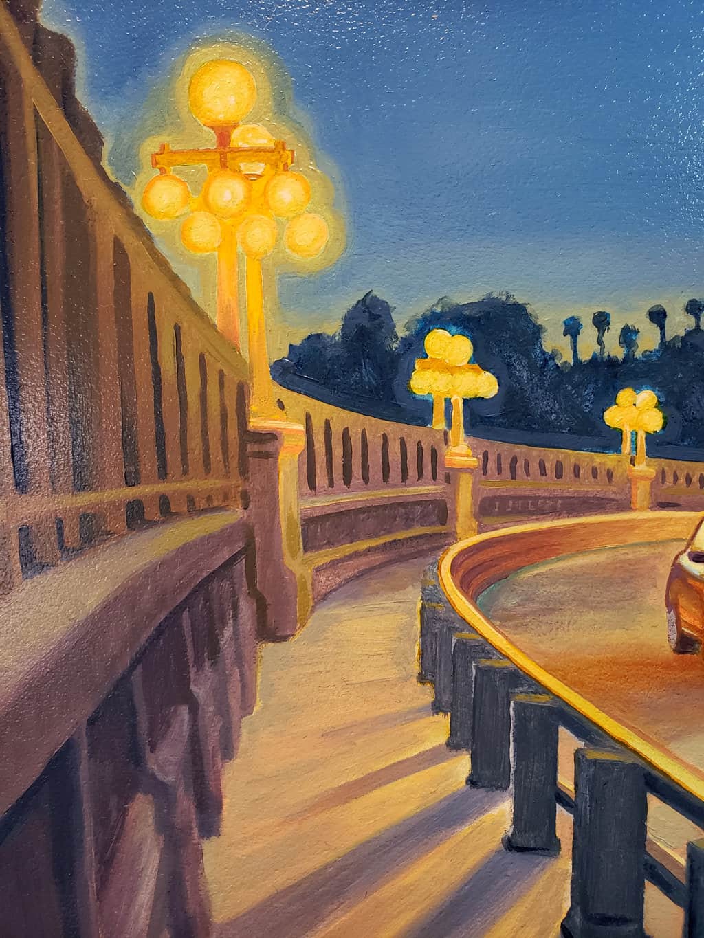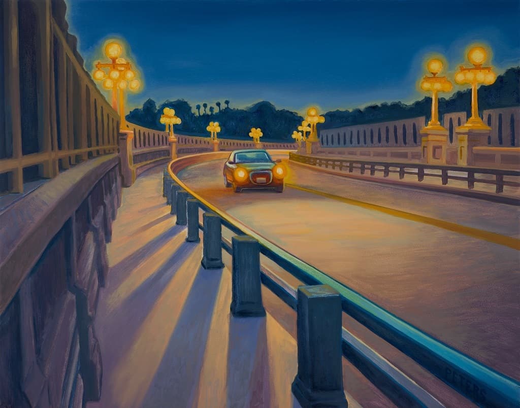 "Everywhere I travel, no matter where in the world, I am always collecting images of freeways, overpasses, bridges, tunnels, and infrastructure. They act as arteries for the distribution of goods and services we are sustained by, but these things also represent something else for me that inspire my creative urges. Infrastructure has an imposed conscientious order, a kind of grid thrown on top of the original natural environment. This "man-made landscape" I often choose to depict is usually seen from the sidewalk or behind the windshield of my car, so I drive with my camera close by at all times. These subjects I gravitate toward allude to my own thoughts and feelings and make me want to tell a visual story. Even if at first I just sense this as the feeling I get from driving over or under a bridge, or through a tunnel. It becomes evident to me as I work on a painting and I can connect my emotions to the work and it's meaning is deciphered for me often during my process. This is very important, that I feel connected to my work in this way. These infrastructure paintings I have included in this ALFA exhibition are akin to my earliest paintings from 20 years ago. Over time, I have continued to explore this subject matter that still uncovers a mystery for me. The massive concrete forms of these heavy, solid, unmoving things are like the ancient architecture of the Greeks and Romans that inspire awe. They represent for me something about the process of repetition in a commute, moving along on a journey, and well mapped roads for discovery into the otherwise unknown".