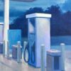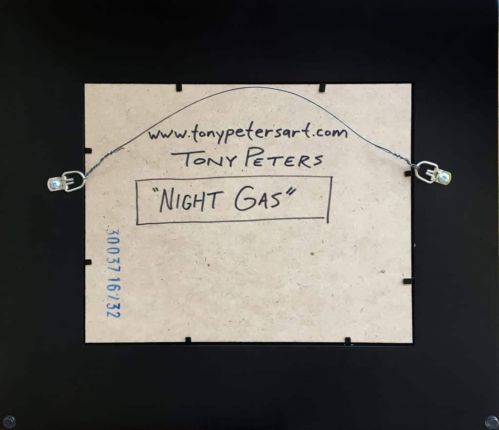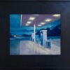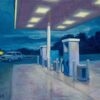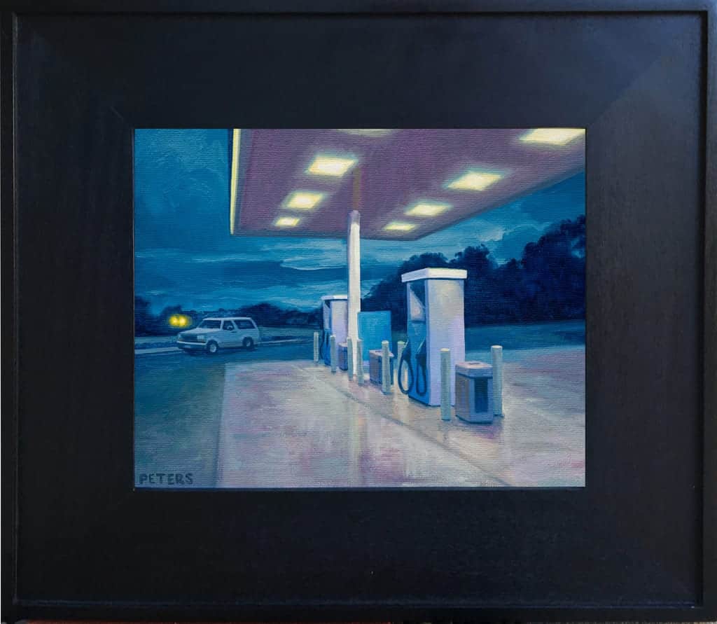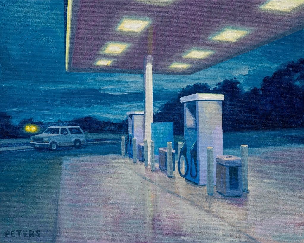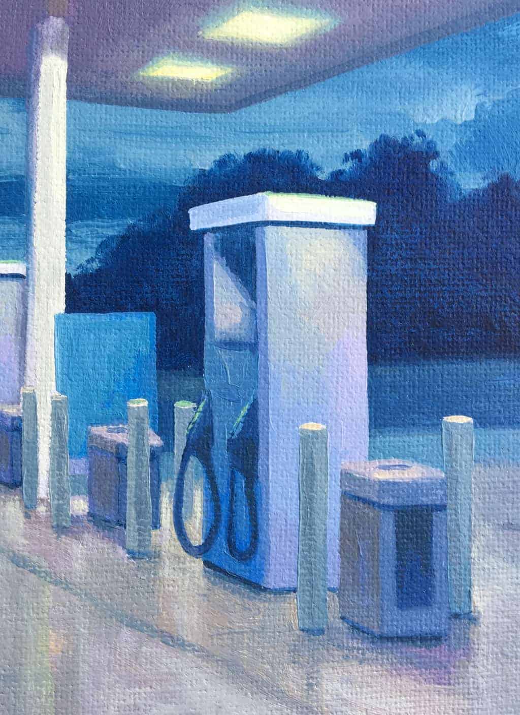 "Night Gas and Evening Route are both from a road trip I took by myself last year. Driving from Seattle to San Francisco, I took the Pacific Coast Highway 101 for the trip down. My destination was the Pierre Bonnard exhibit at the Legion of Honor. I sketched and painted plein air every day, driving a little, and then stopping whenever something caught my eye. I find the evening light in the Pacific Northwest to be rich and interesting with its deep blues and night colors that linger a bit longer as summer approaches. As I continued on my road trip, my chosen views became less about pretty vistas and rocky seascapes, and more about my interest in the road itself. Thinking about present-moment awareness as I drove, nearly every mile of road could have justified another attempt at making a painting from what I saw. My state of mind was so submerged in art-making and the ever-present 'now.' I felt a sense of purpose, the road and cars on it acting as a metaphor. Headlights illuminating only what's in front of them."