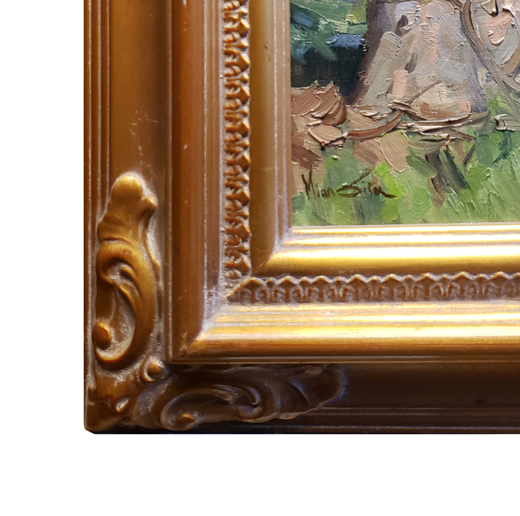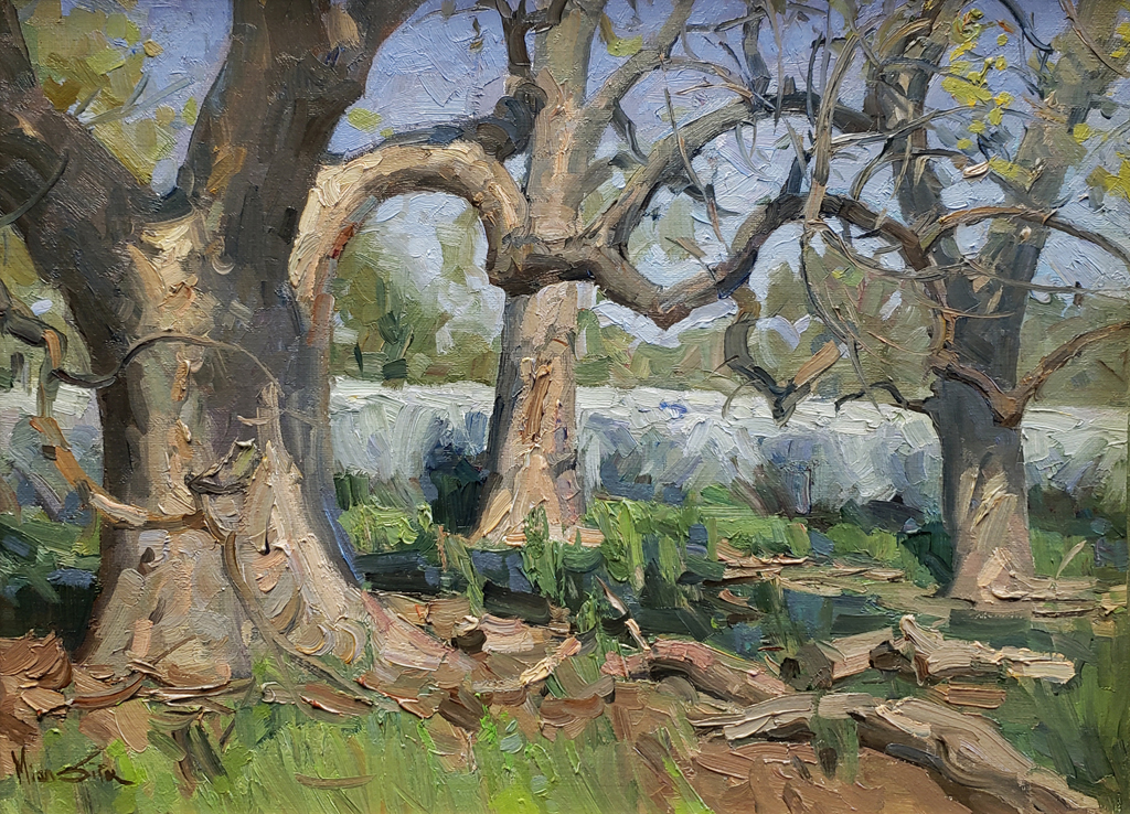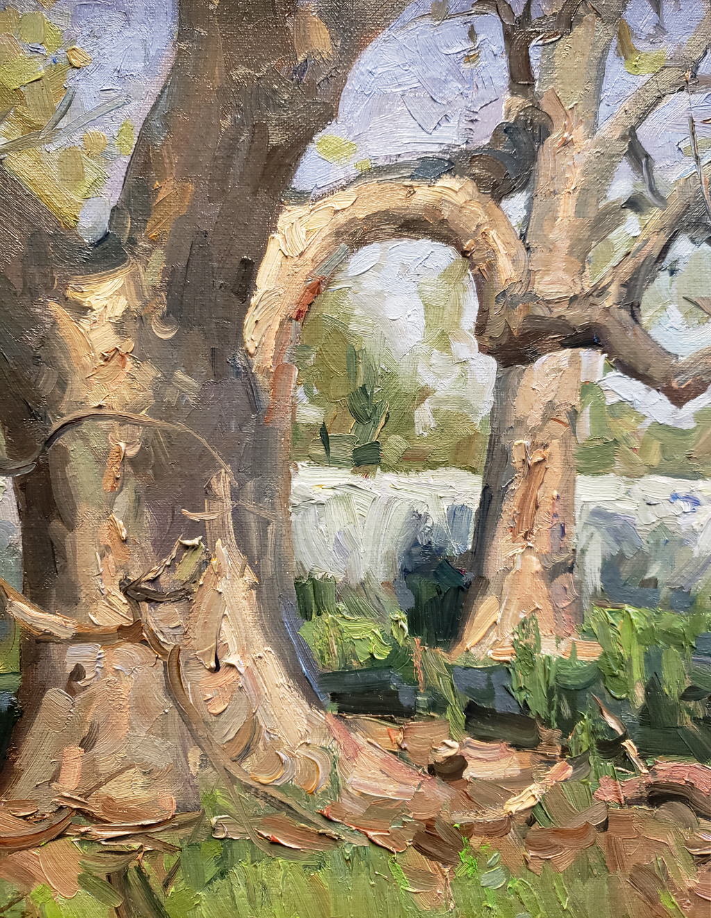 “The painting was created during a plein air painting trip organized by the California Art Club in Tejon Ranch. There are many one-hundred-year-old oak trees in on the ranch. I particularly love the feeling that the leaves and branches are dancing in the sunshine.”