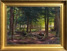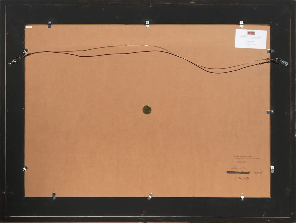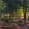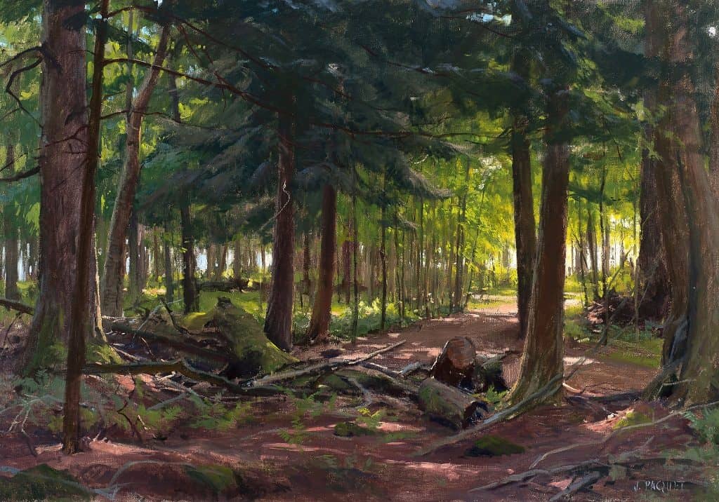 "Both my large field paintings, 'Ojibwe Sunrise' and 'Splintered Hemlock," were created on Madeline Island in Wisconsin over a one-week period and just 20 feet from each other. This particular area is abundant with hemlock and was once Ojibwe tribal land and continues to hold a strong spiritual atmosphere. 'Ojibwe Sunrise' was painted with the eastern morning sun blasting through the trees and reflecting off the lake. Despite the complexity of painting large works en plein air in a forest interior, as well as the scourge of mosquitoes and ticks, it was a peaceful and magical experience."