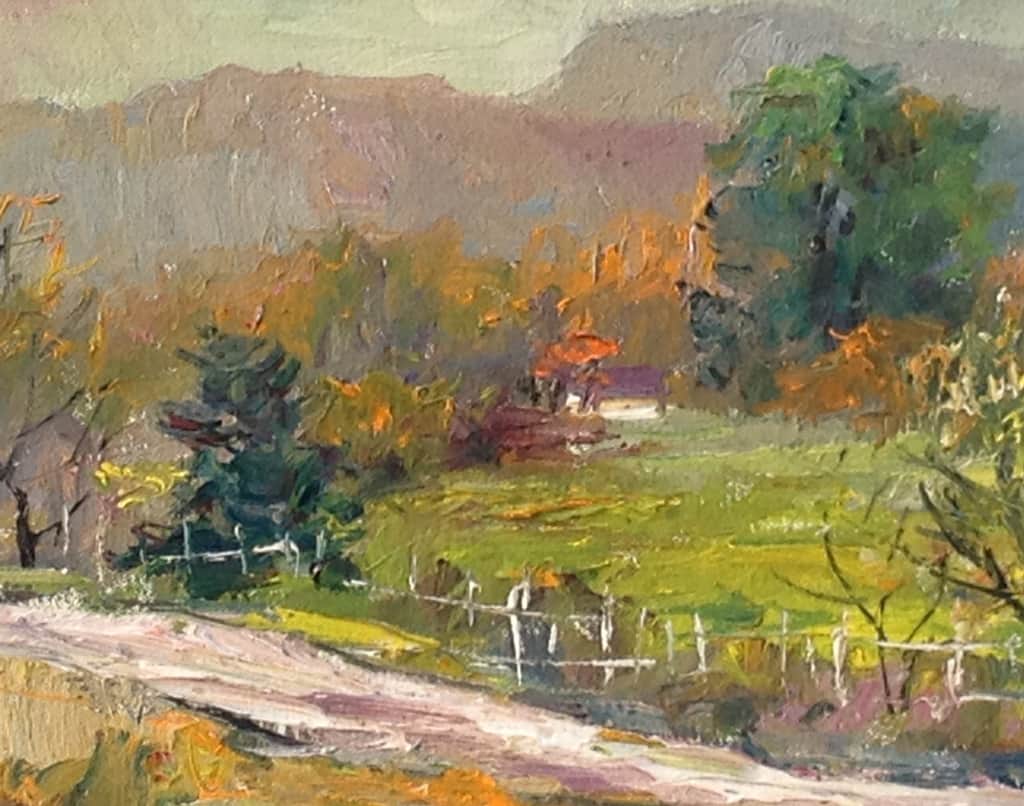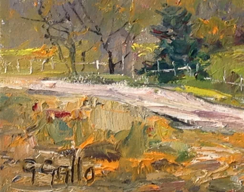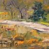 Las Virgenes Canyon, located in the West Hills area of the Santa Monica Mountains, is known for its rolling hills, valley oaks, and expanse of pristine California land. Gallo captures a joyful energy with his variation of brushstrokes, which add texture and depth to the landscape. The autumnal colors seen while traveling along the old access road suggest an approaching change of season.