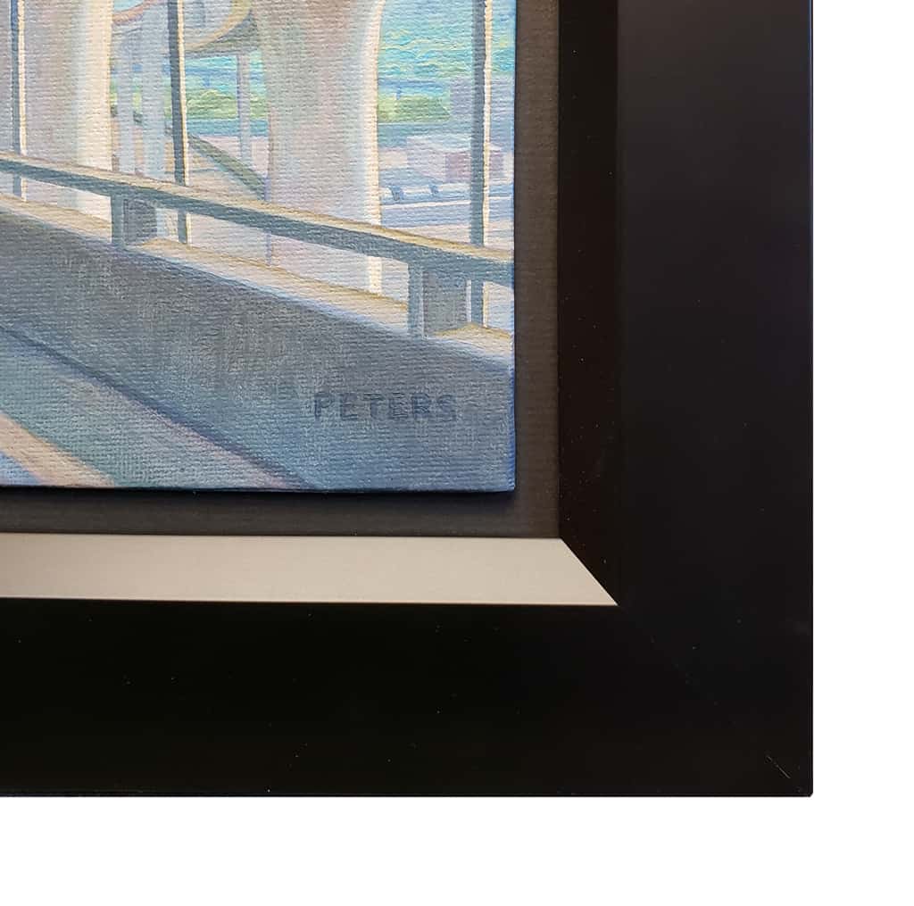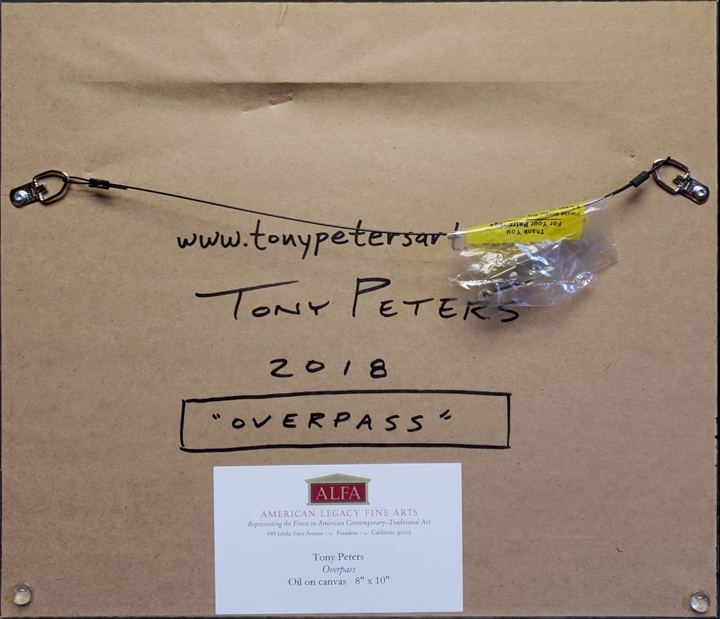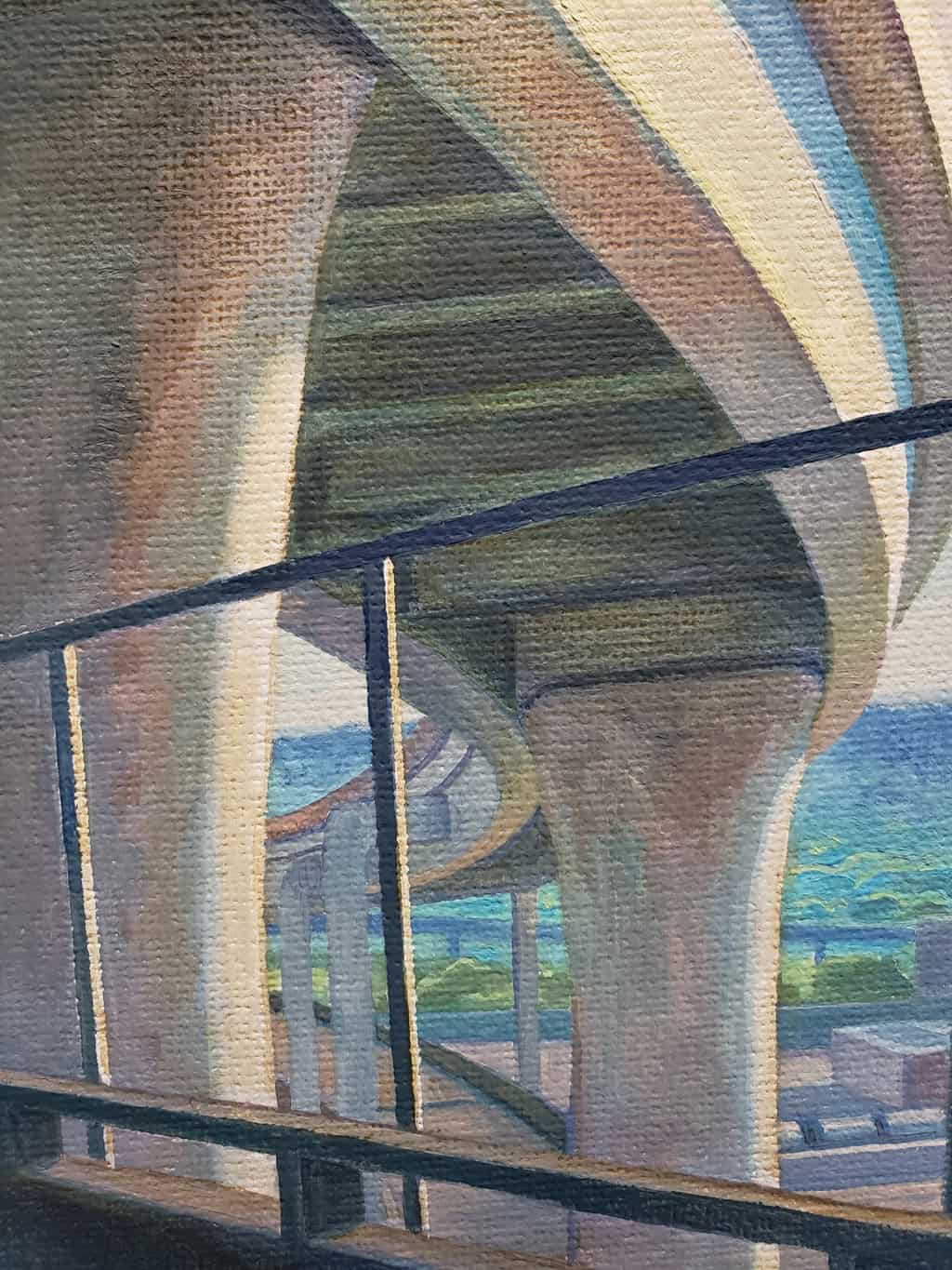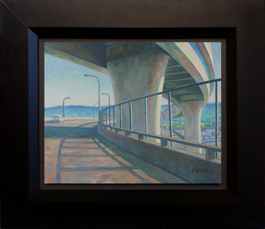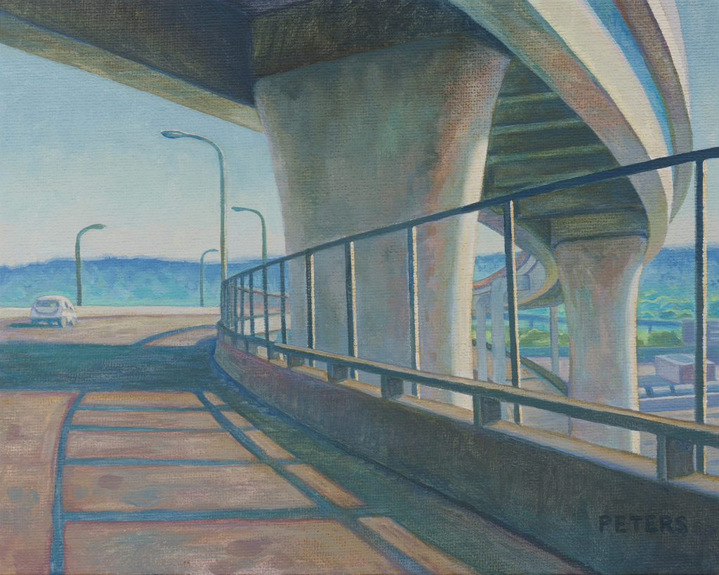 "Everywhere I travel, no matter where in the world, I am always collecting images of freeways, overpasses, bridges, tunnels, and infrastructure. They act as arteries for the distribution of goods and services we are sustained by, but these things also represent something else for me that inspire my creative urges. Infrastructure has an imposed conscientious order, a kind of grid thrown on top of the original natural environment. This "man-made landscape" I often choose to depict is usually seen from the sidewalk or behind the windshield of my car, so I drive with my camera close by at all times. These subjects I gravitate toward allude to my own thoughts and feelings and make me want to tell a visual story. Even if at first I just sense this as the feeling I get from driving over or under a bridge, or through a tunnel. It becomes evident to me as I work on a painting and I can connect my emotions to the work and it's meaning is deciphered for me often during my process. This is very important, that I feel connected to my work in this way. These infrastructure paintings I have included in this ALFA exhibition are akin to my earliest paintings from 20 years ago. Over time, I have continued to explore this subject matter that still uncovers a mystery for me. The massive concrete forms of these heavy, solid, unmoving things are like the ancient architecture of the Greeks and Romans that inspire awe. They represent for me something about the process of repetition in a commute, moving along on a journey, and well mapped roads for discovery into the otherwise unknown".