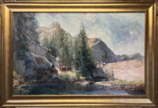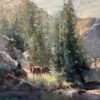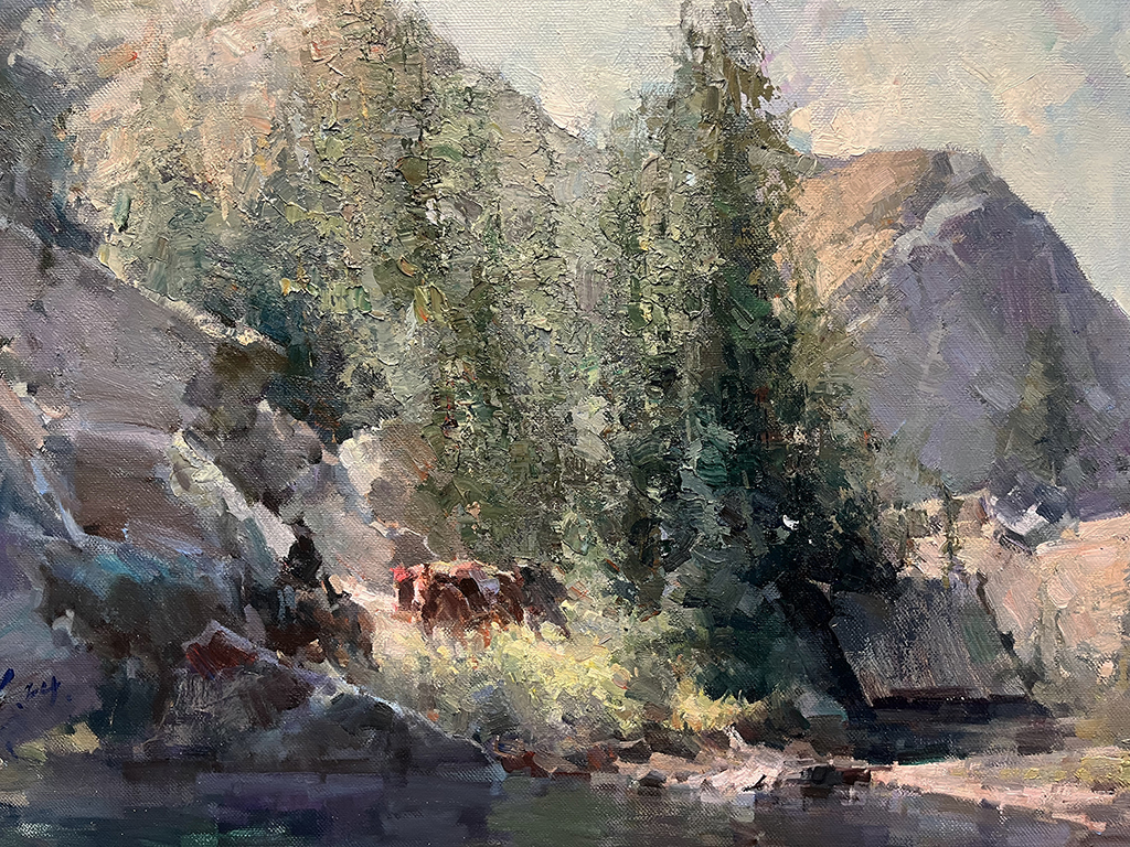 “This painting depicts delivery cowboys riding through a serene and picturesque mountain forest. The harmonious blend of fresh air and sunlight surrounds the scene, creating a tranquil atmosphere that celebrates the natural beauty of the landscape.”