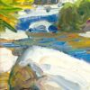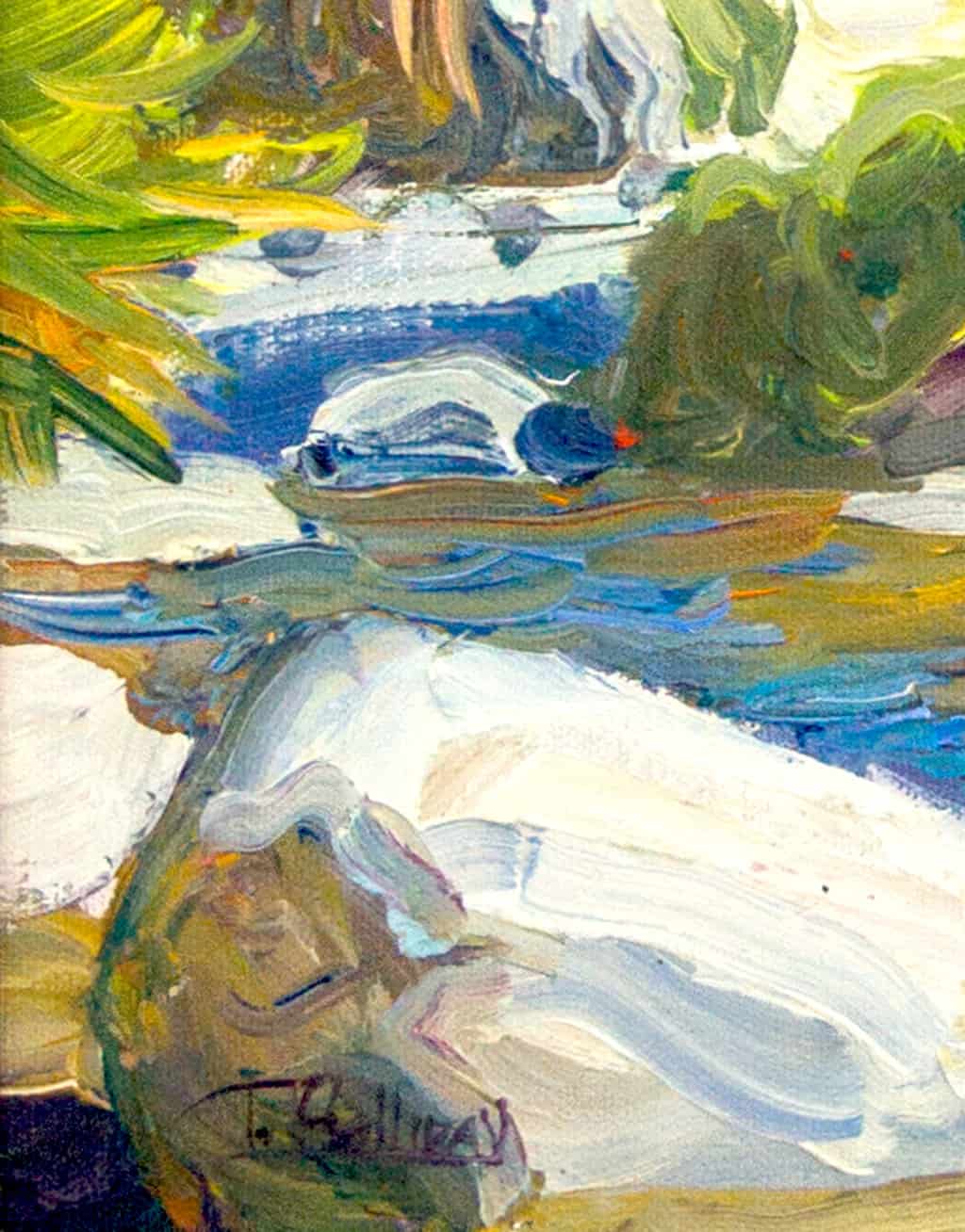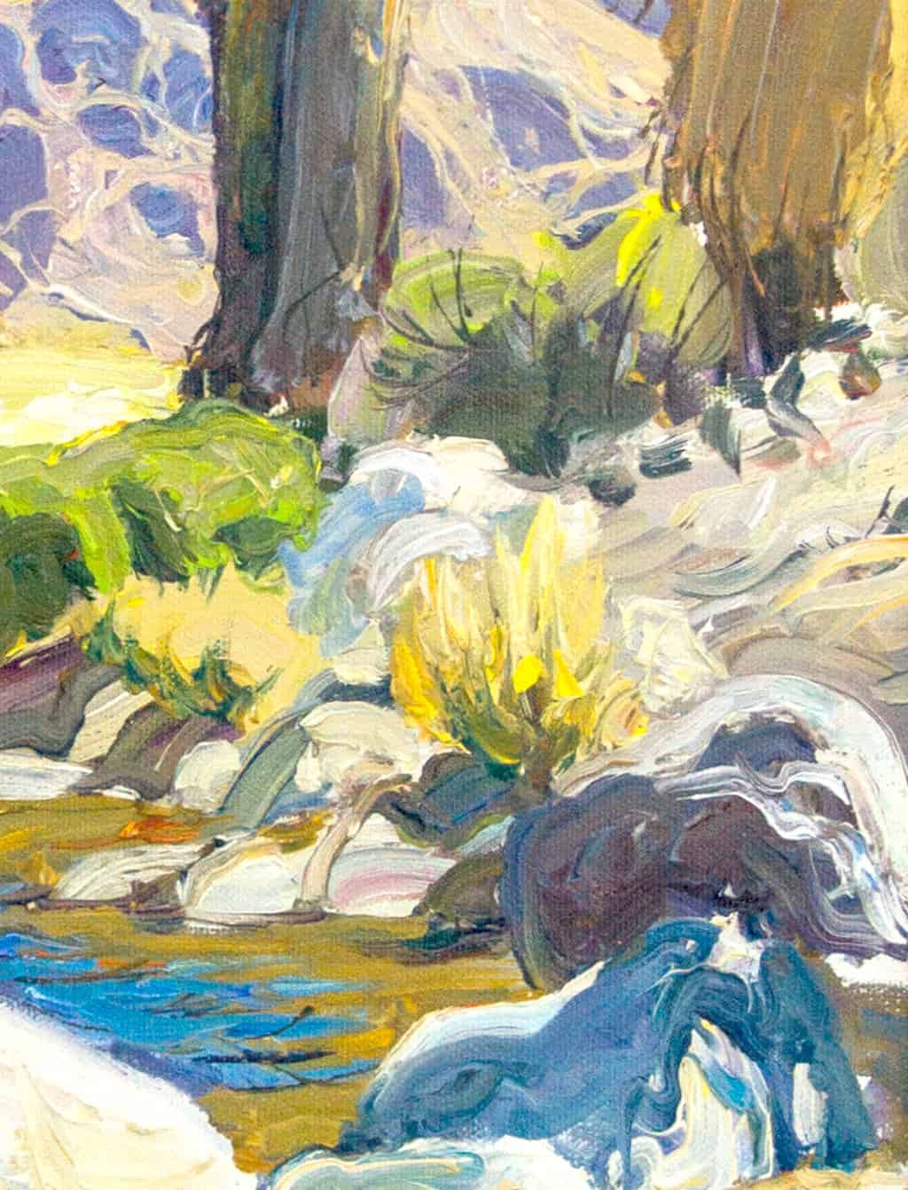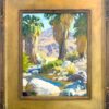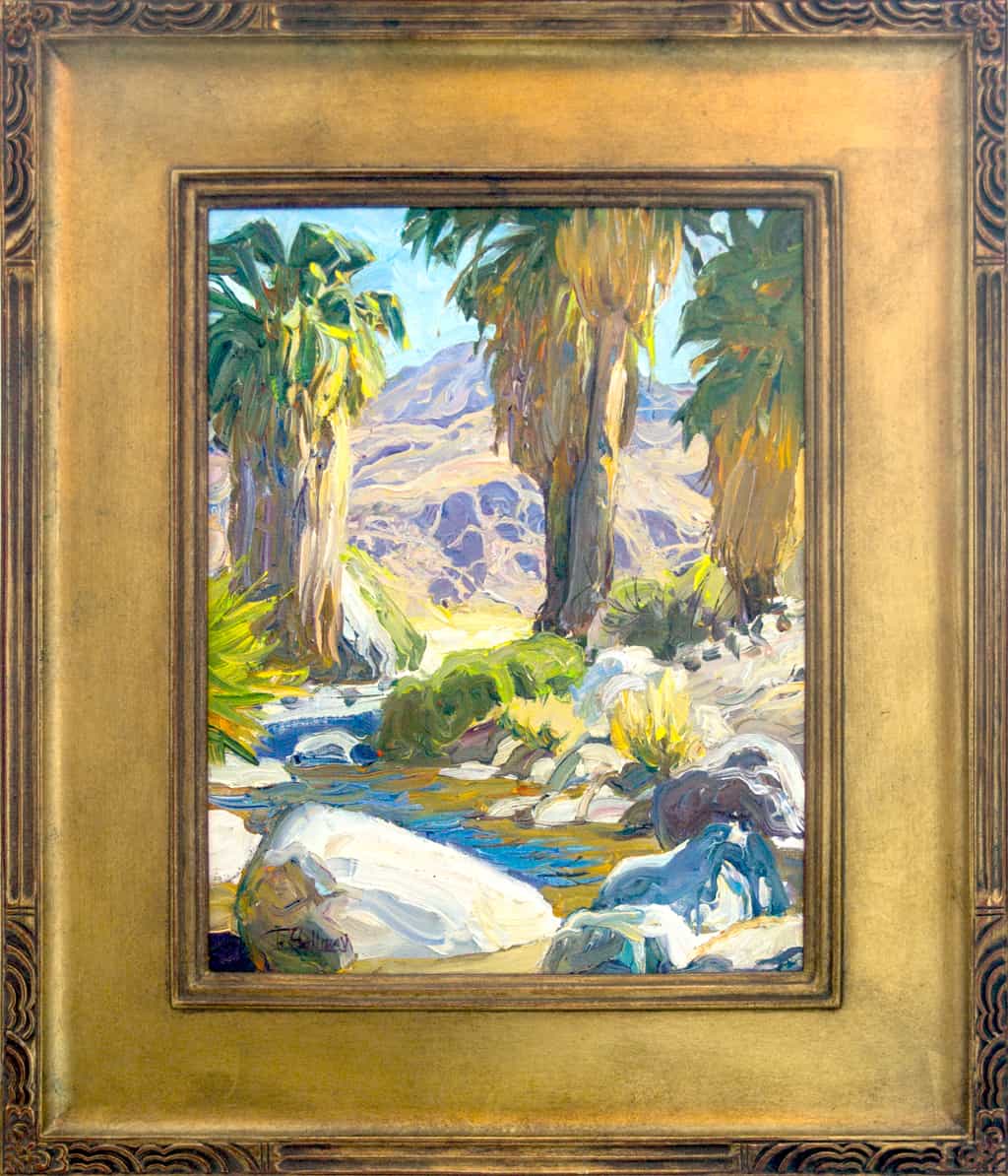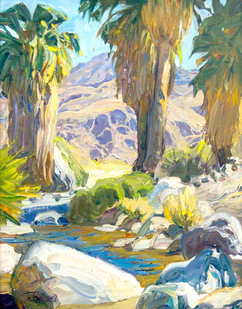 Painted en plein air, the scene depicts a natural creek in Palm Springs that includes date palms and granite boulders.