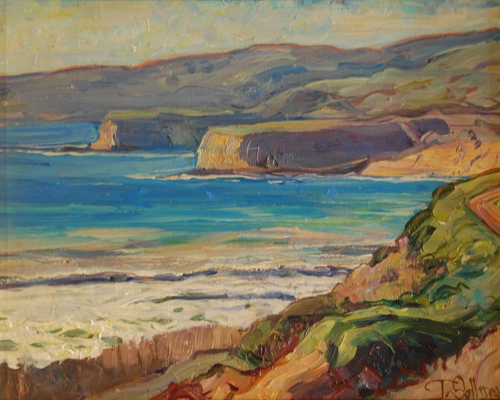 As the sun illuminates the Palos Verdes Cliffs, the clear blue waves of the Pacific Ocean gently wash upon the shore. The strength of the delineated edges on the right side of the scene allow viewers to imagine themselves standing atop the cliff, taking in nature’s splendor.