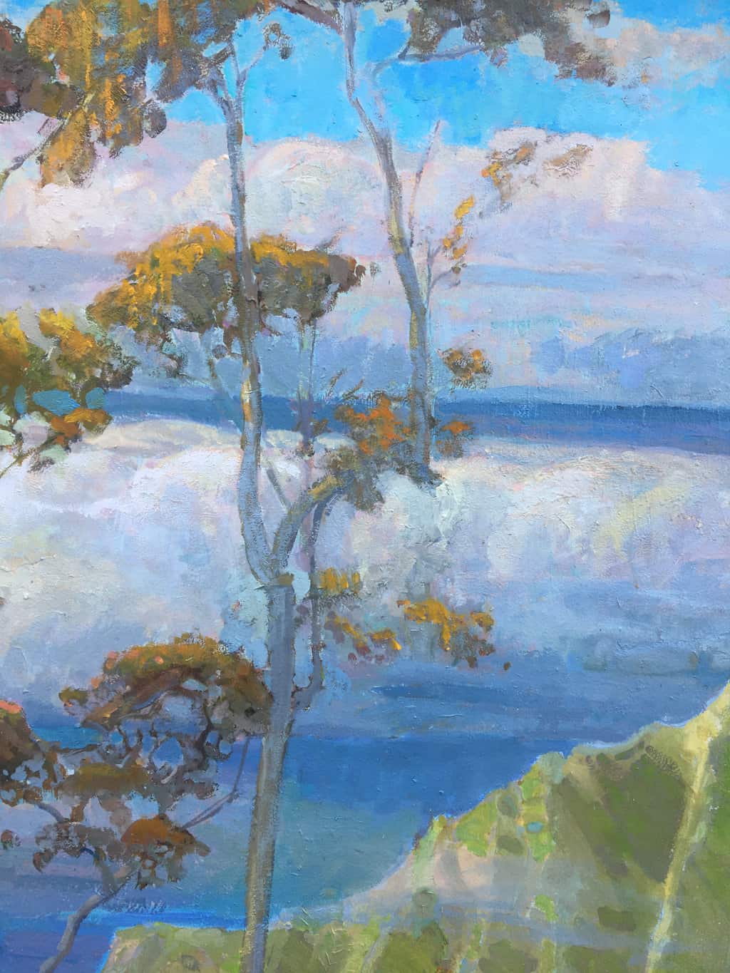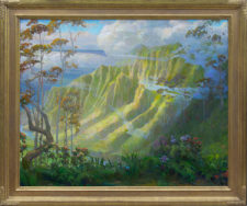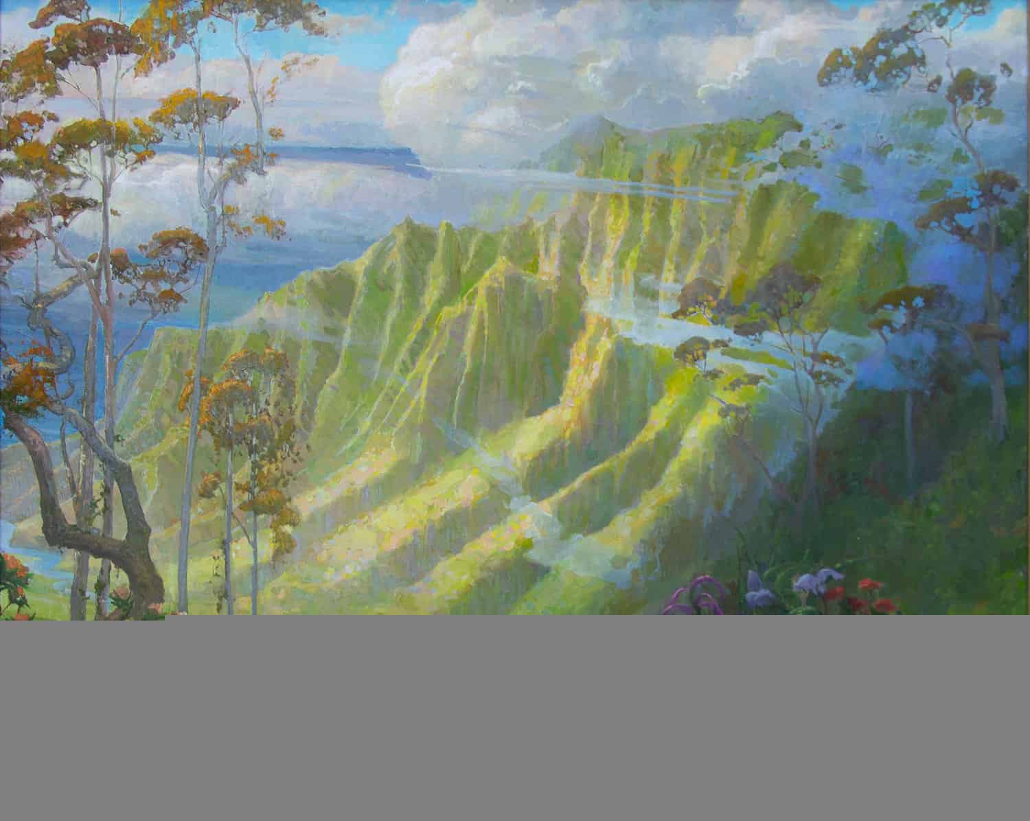 "Painting in Hawaii is always a challenge because the weather and atmospheric conditions are constantly changing. This scene of the Kalalau Lookout had it been painted five minutes earlier would have been completely enshrouded in fog. When the clouds parted it felt like a magical curtain unfolded and I had been transported to prehistoric times. The majestic view overwhelmed me, and I knew that I was compelled to paint this, the most pristine and most isolated valley in all of the Hawaiian archipelago."
