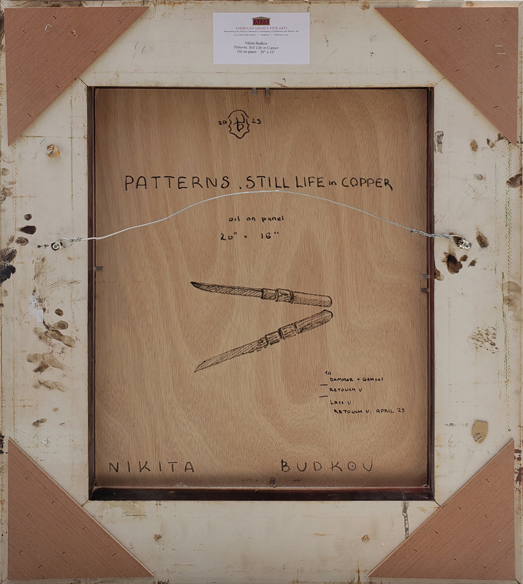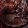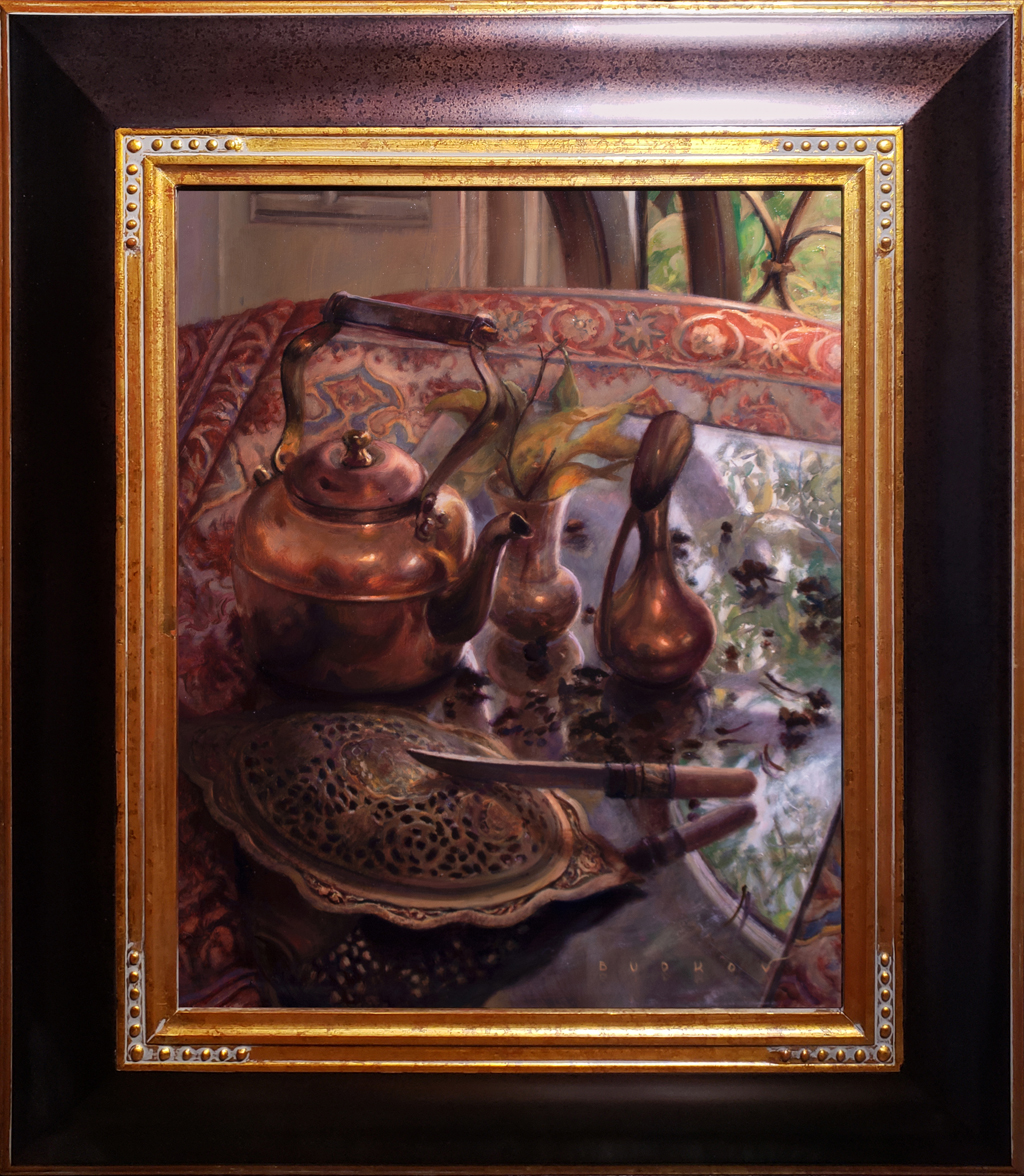 “As an artist, I am fascinated with reflections. I love painting still water with the reflecting sky while I also find portraits with mirrors symbolic. Th intent of this painting was to create something fascinating, yet simple, with different items projected in daylight. Th idea to place things on a mirror was extremely tempting and it proved to look intriguing with the window to outside practically reflected right on a table, underneath the copper and brass teapot, decorative plate, vases, and sprinkles of anise.”