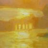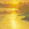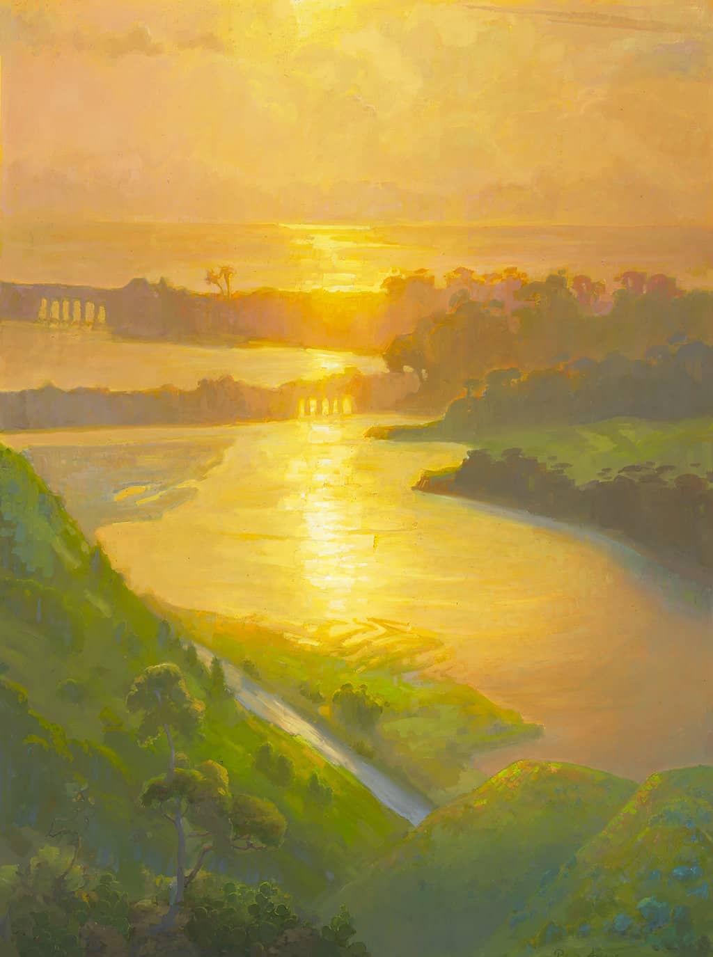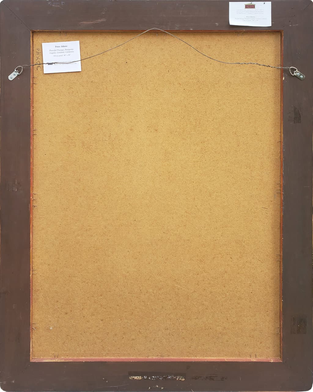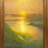 Peter Adams' flare for combining real places with dreamlike visions is exemplified in this plein air oil painting depicting the sun setting over the Pacific Ocean in Carlsbad, San Diego. Using a fusion of warm tones and high-key color notes, Adams creates a sublime scene with gorgeous brilliance and calming qualities.