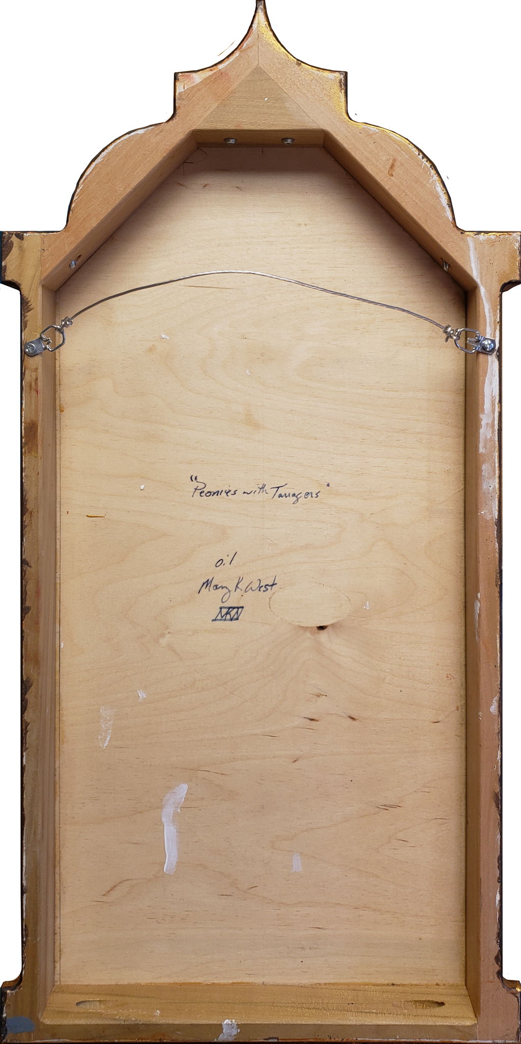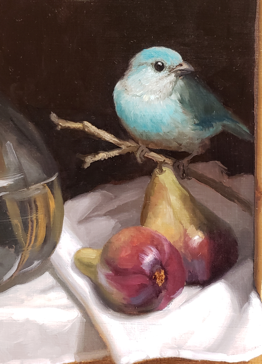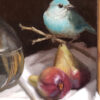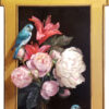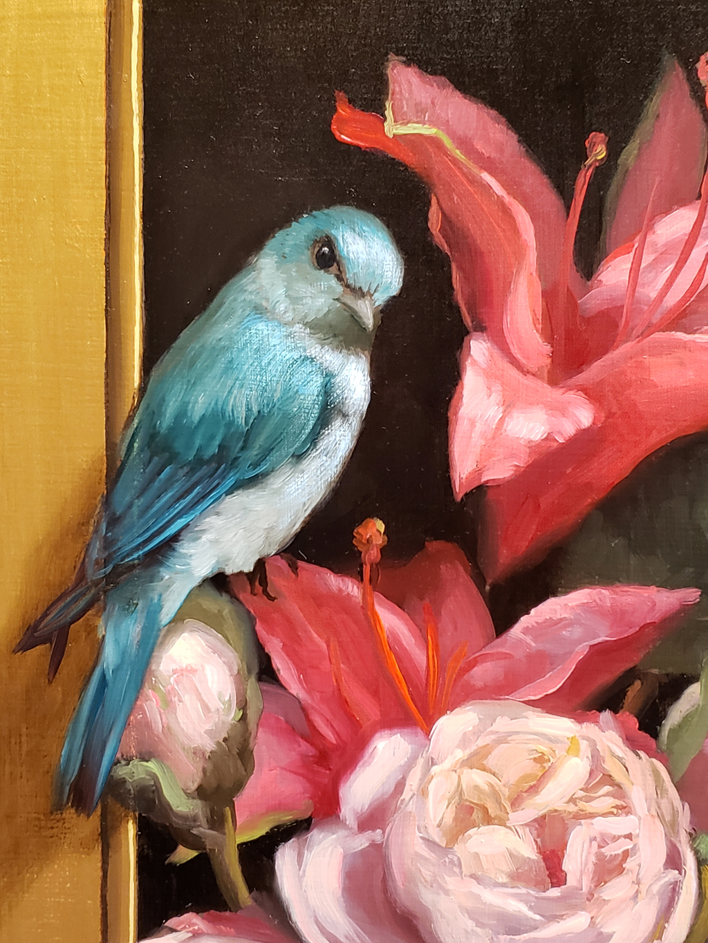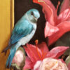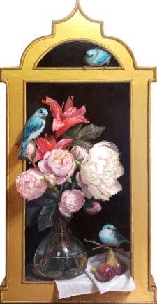 “I enjoy portraying the natural character of birds, while placing them in unusual settings. In this painting, the South American Blue-Grey Tanagers, whose natural habitat lies east of the Andes, are seen here playfully perched. One is atop the frame looking inward, another sits on the stems of an arrangement of pink peonies and star gaze lilies, and the third is resting on a pair of figs. They are not in a cage, but freely flying about, although set in a niche as precious objets d’arts. The composition of the trio of birds allows the viewer to see the scene from every angle, and the complementary pink and blue colors make the overall subject pleasing and tender.”
