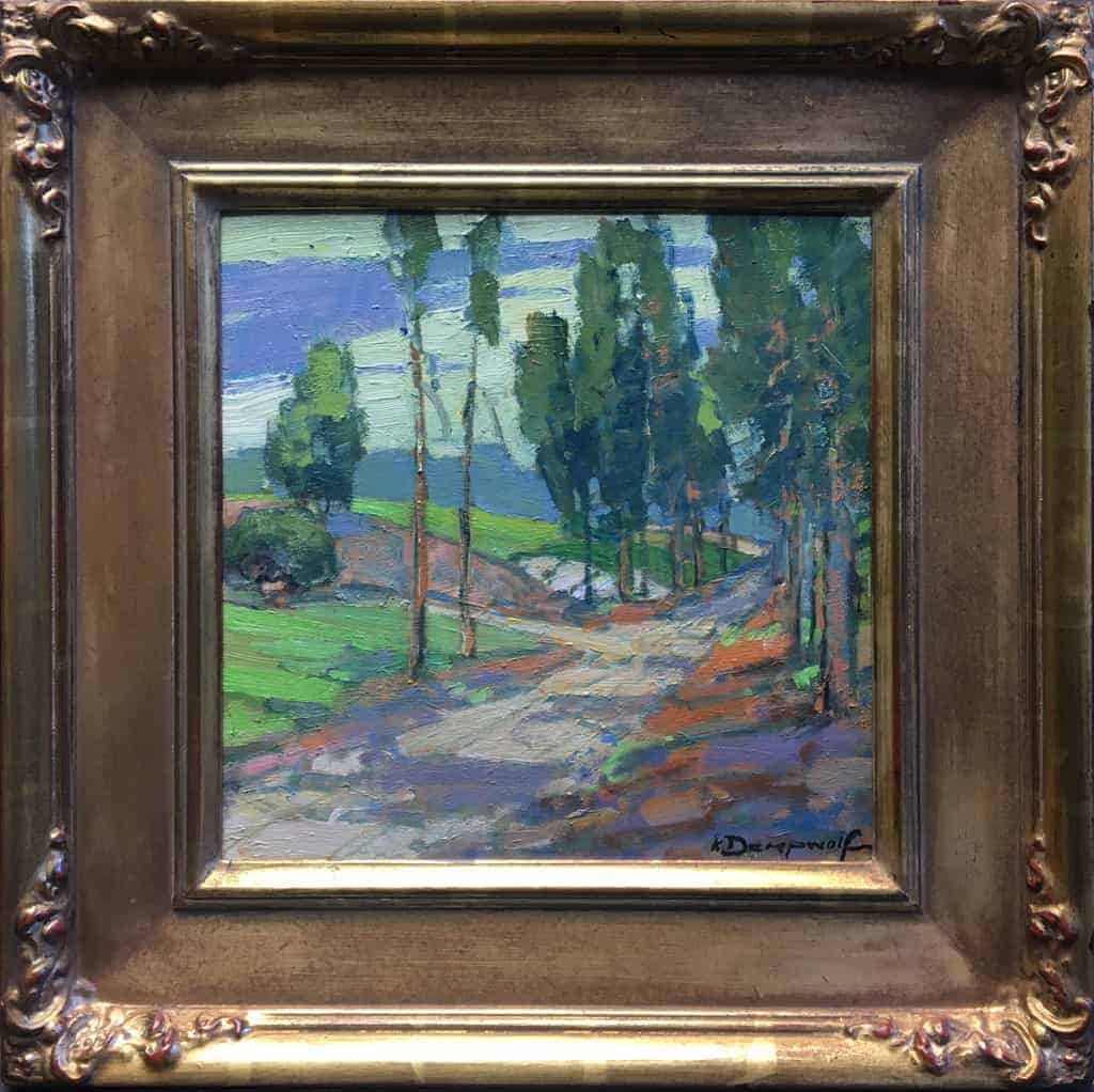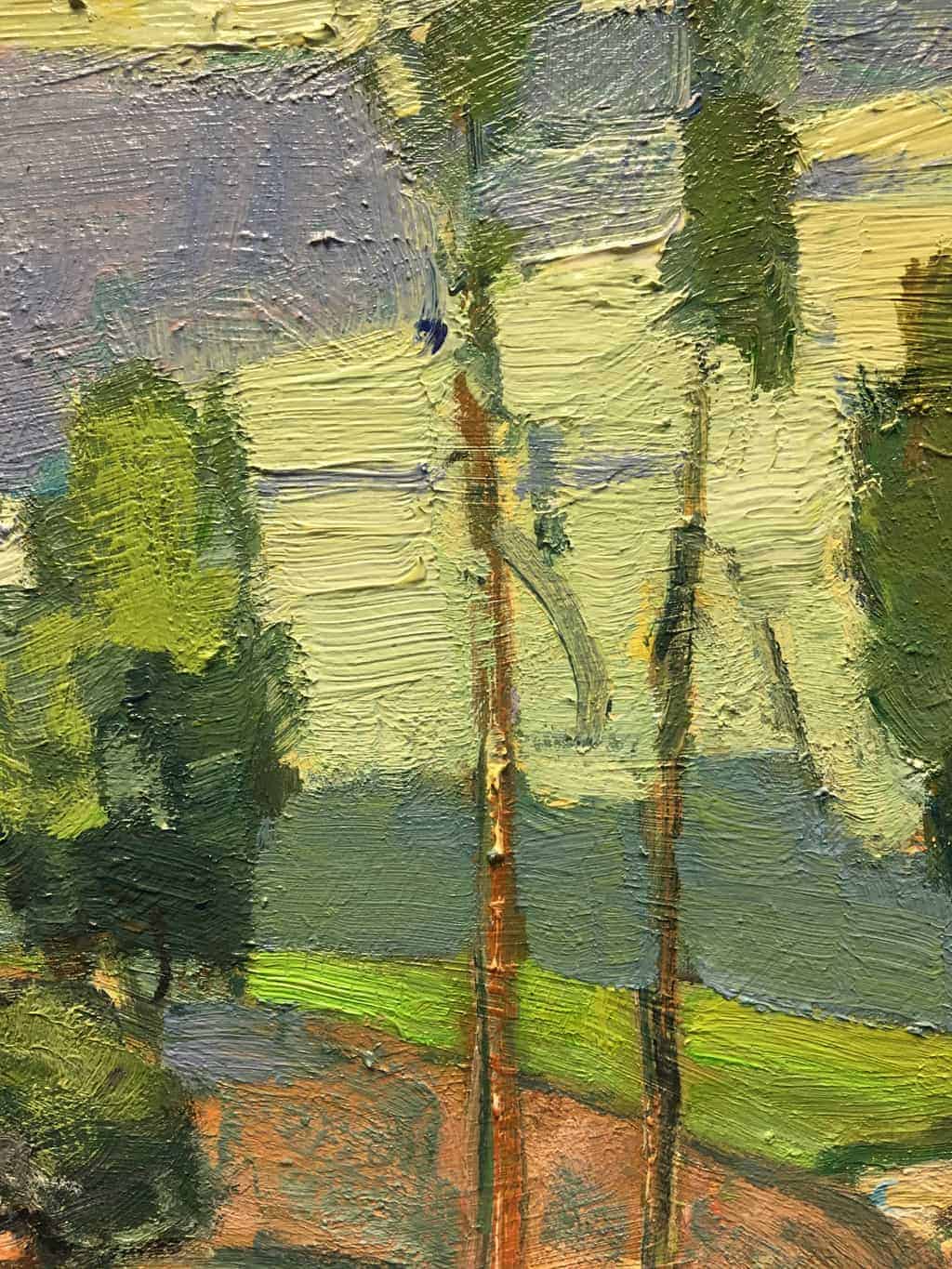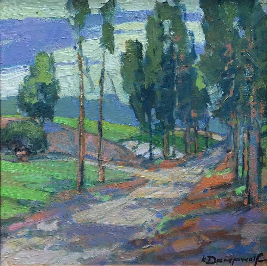 "Not many of my fellow artists decided to paint here, most seemed to congregate near the sycamore grove where I ended up a few days later. I loved the road driving the eye into the vista, I was basically alone with my paints and the vista, and the wonderful combinations of cool greens and warm pine needles made for great color harmony."