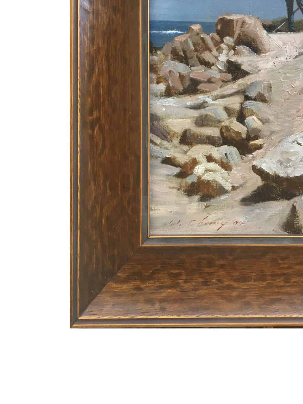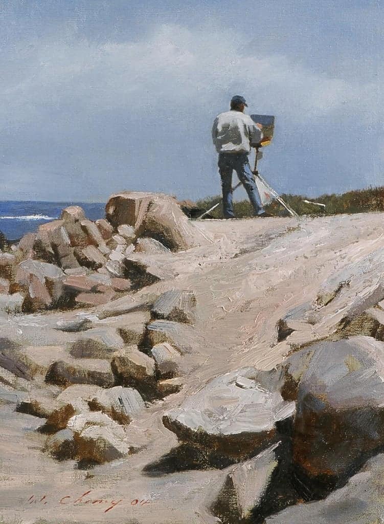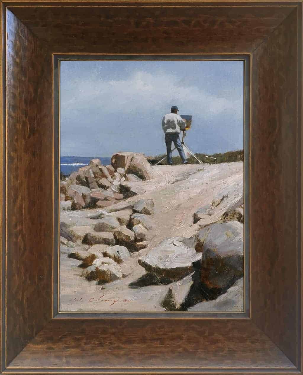 The scene was painted en plein air near Lovers Point Park in Pacific Grove and depicts a fellow plein air artist at work during the week of the Carmel Plein Air Festival when artists converge on the Monterey Peninsula to capture California's magnificent coastal views.