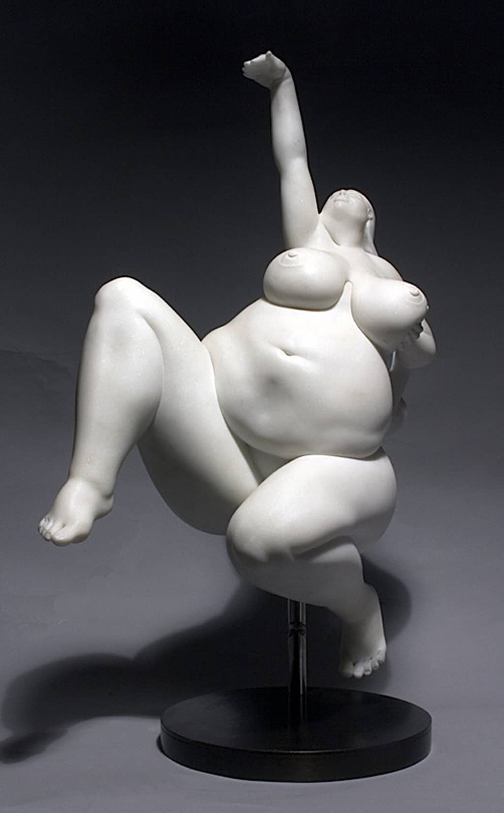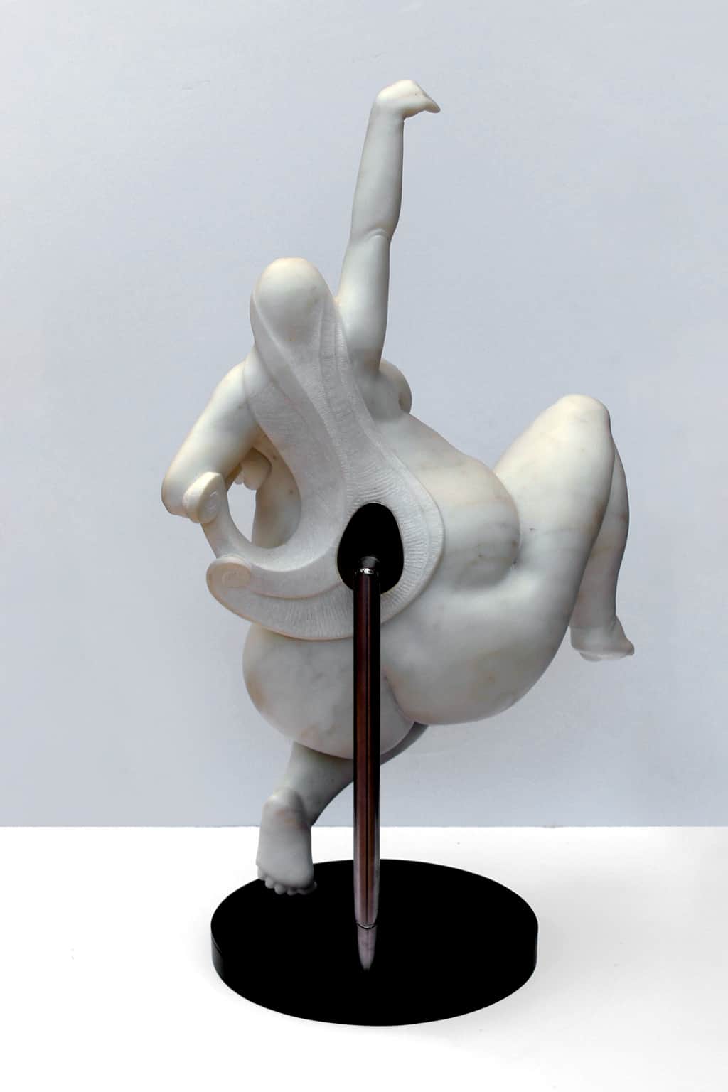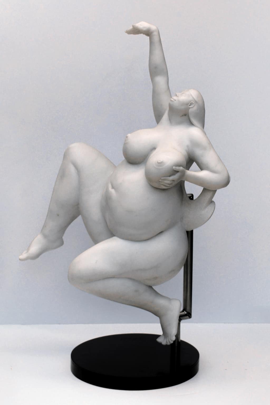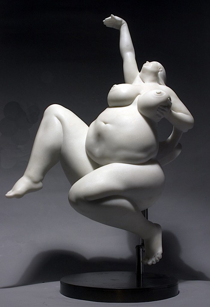 Bácsi captures a sense of free spirit in the female form. This uniquely composed sculpture, hand-carved in Italian marble, accentuates the model’s voluptuousness and joyous attitude.
