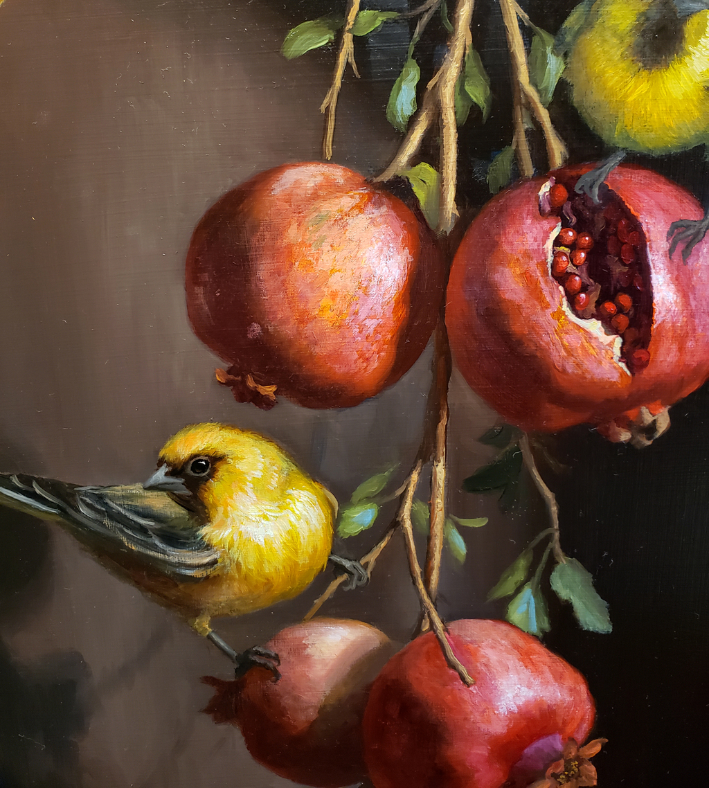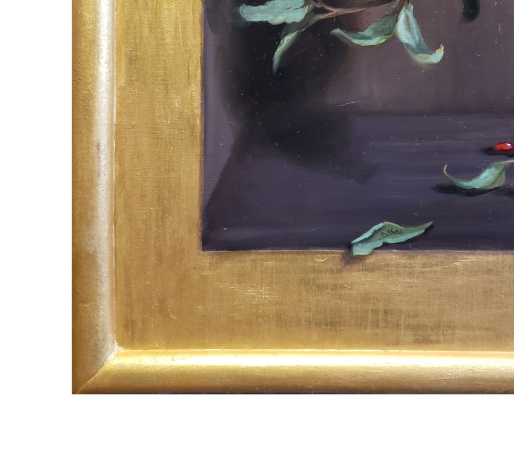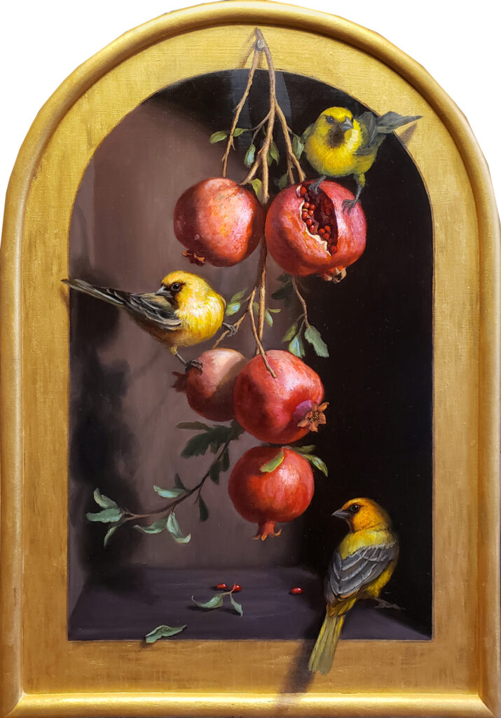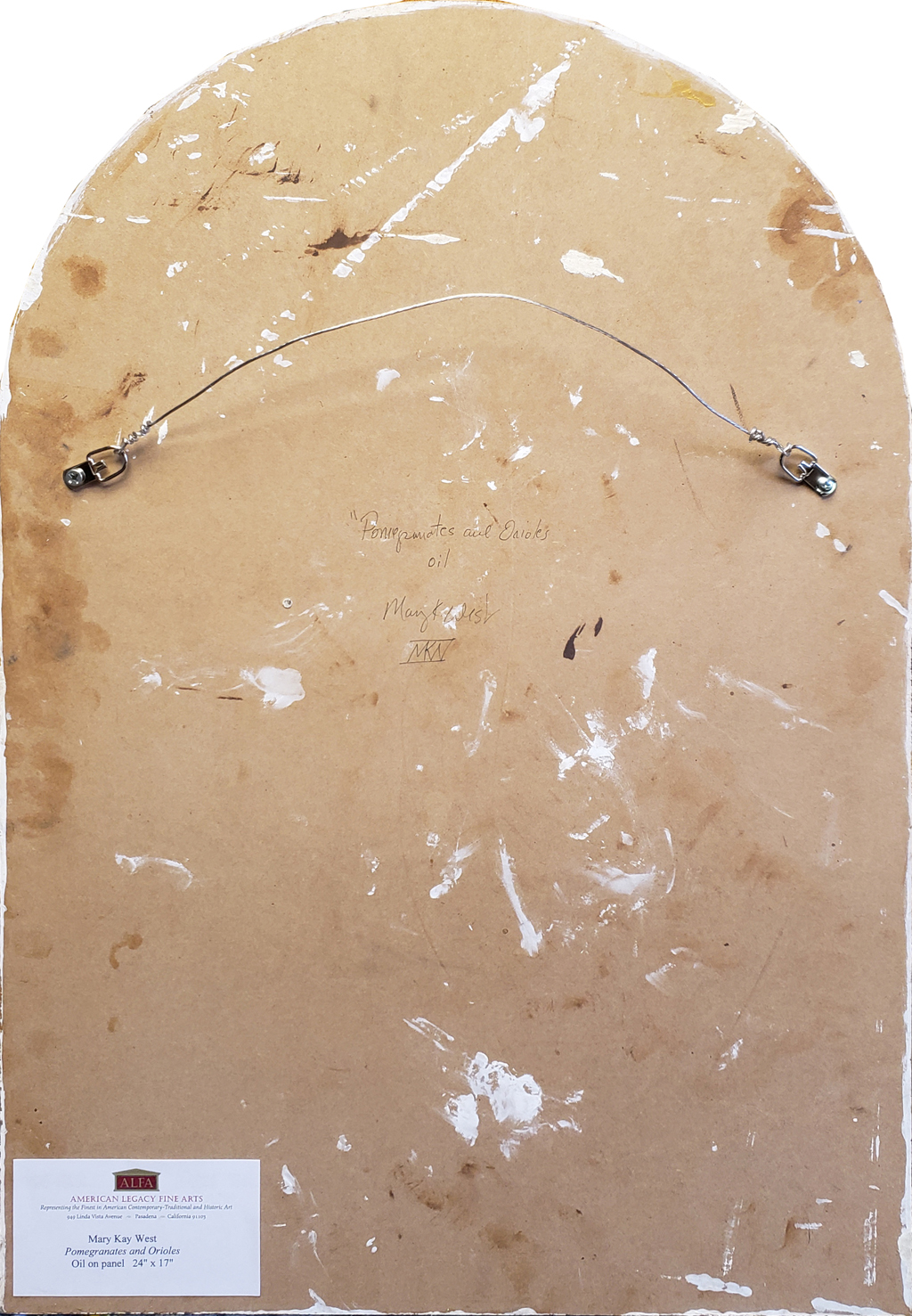 Mary Kay West Available Work Archives Biography Press and Publications View in Room Sizing is approximate. See specs for exact dimensions. Twitter Email Mary Kay WestPomegranates and OriolesOil on panel24" x 16.875", artwork24" x 16.875" x .625", framedContemporaryNot AvailableRequest More Information Provenance Acquired by American Legacy Fine Arts directly from the artist Description "Pomegranates hanging in a niche to dry are too hard to resist for this trio of orioles." —Mary Kay West Exhibited The Poetry of Still Life, American Legacy Fine Arts, Pasadena, California, April 22 – May 21, 2023 Need help? Call our ALFA specialists +1 626.577.7733 Available Artwork by Mary Kay West