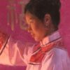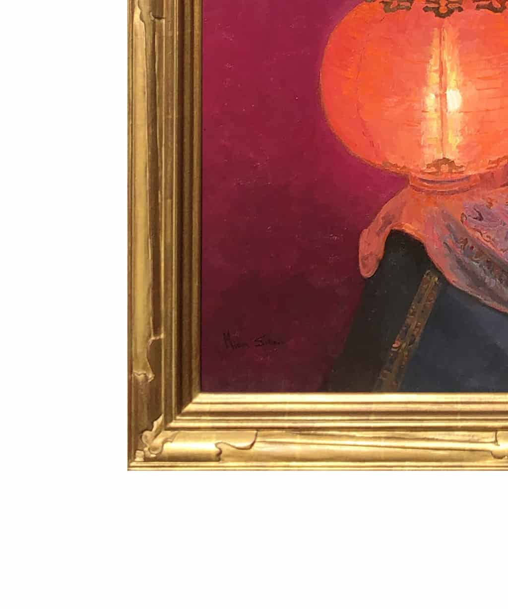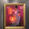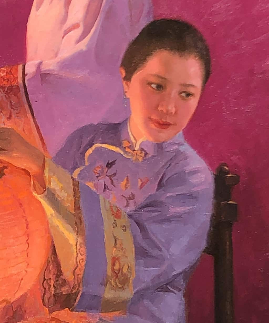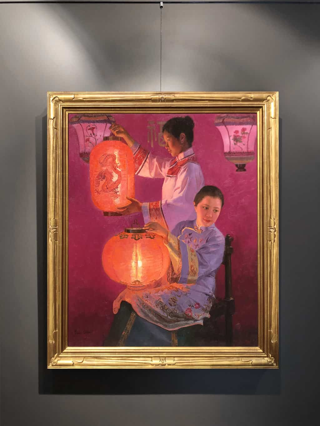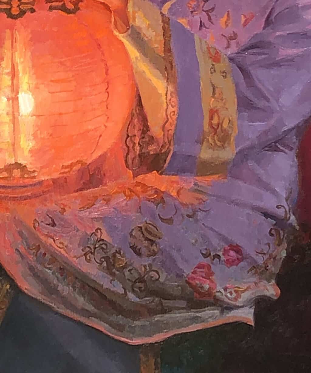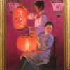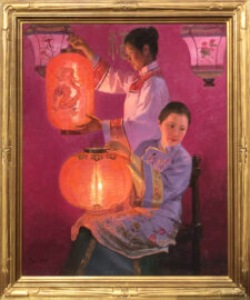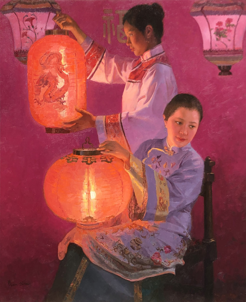 Description Charged with uplifting energy, this beautiful oil painting by Mian Situ is brilliantly executed and appears to emanate its own light. The arrangement of bright magenta, orange, and pink colors creates a sense of exuberance and airiness while the patch of blue anchors the composition. The scene is set in the contemporary west, in San Francisco during the Chinese Festival of the Autumn Moon in October. The young ladies are dressed in traditional silk embroidered tunics in honor of their ancestral culture. The glowing lanterns that will be displayed in celebration of an abundant harvest reflect off their faces and tunics, and bring to mind John Singer Sargent's famous painting Carnation, Lily, Lily, Rose.