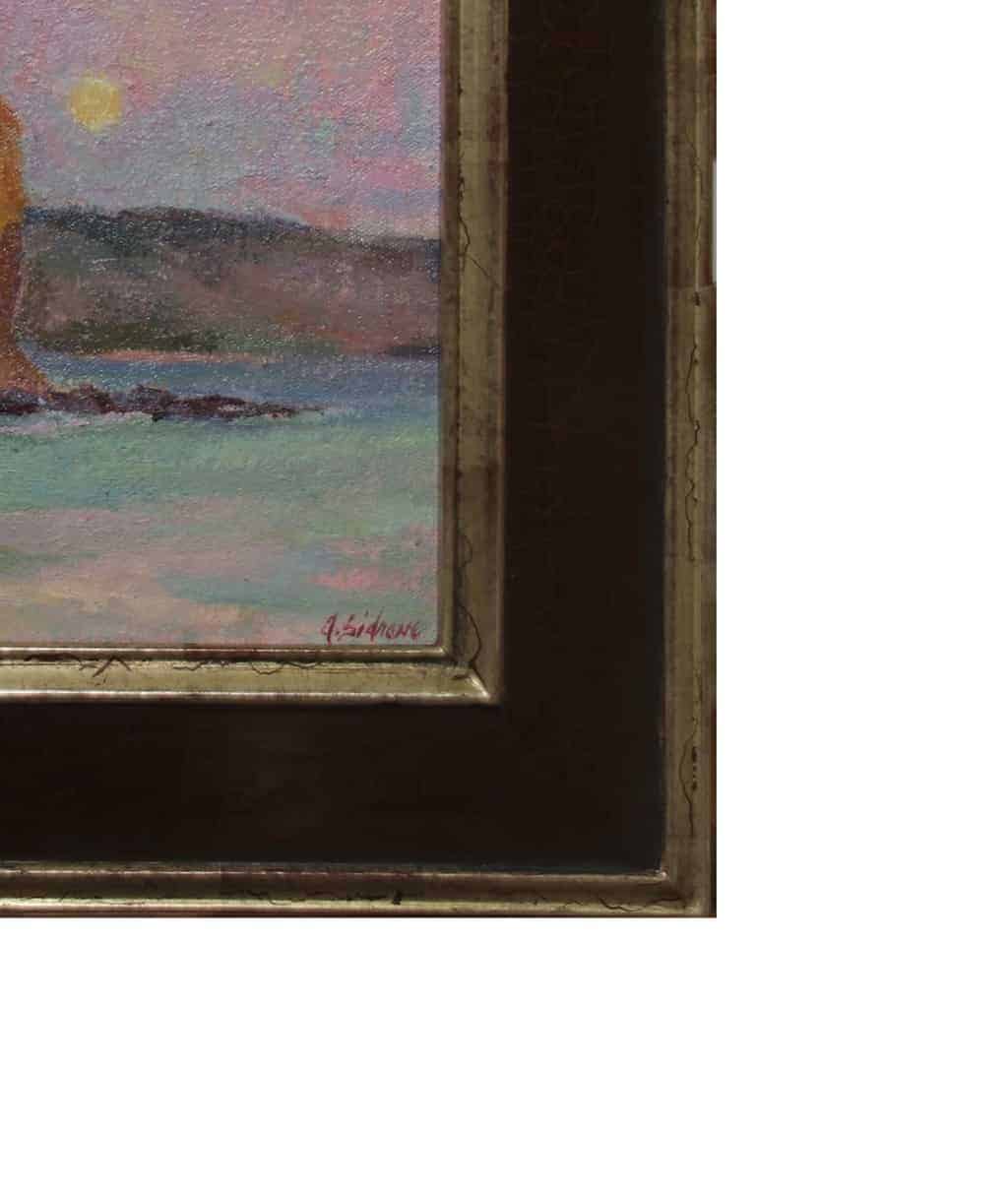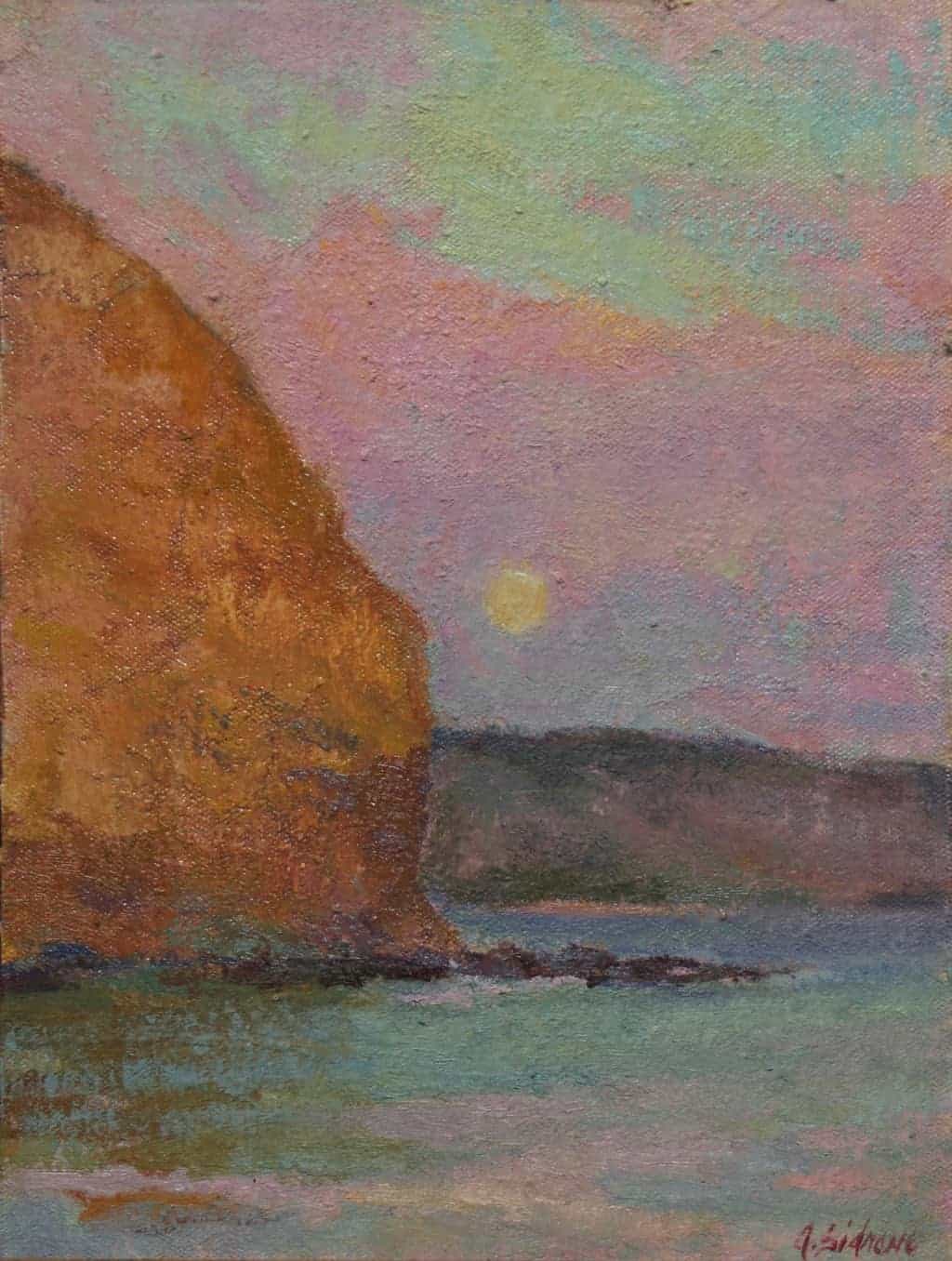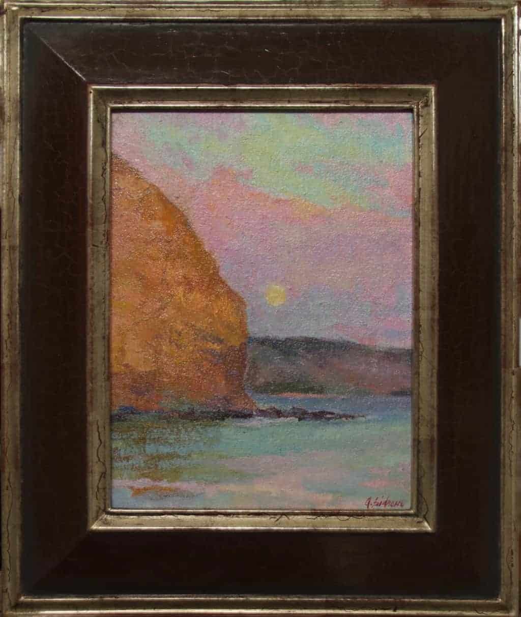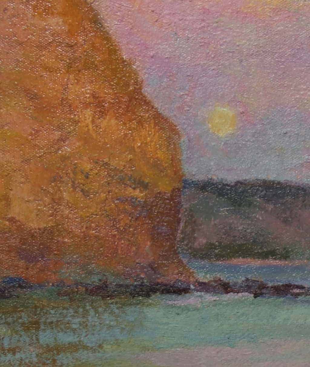 "Once a month, we have the opportunity to witness or partake in the moon rising as the sun is setting. In preparation for this moment, as an artist, I studied the area the prior day so that I would know the approximate location of where the occurrence would take place. On this day the moon rose up out of the coastal fog and the sun had set, leaving the sky awash with a pinkish glow. In this moment, one feels that all is in perfect balance and harmony."