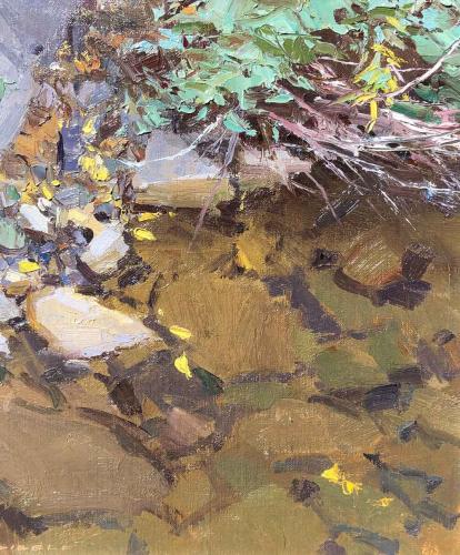 "This piece began as a class demo for a group of plein air students. I had chosen a location for the group to paint that really depended on sunshine but instead we were greeted by rain. But alas, the show must go on, and in looking for something to highlight I found this little quiet moment holding some beautiful treasure waiting to be discovered."