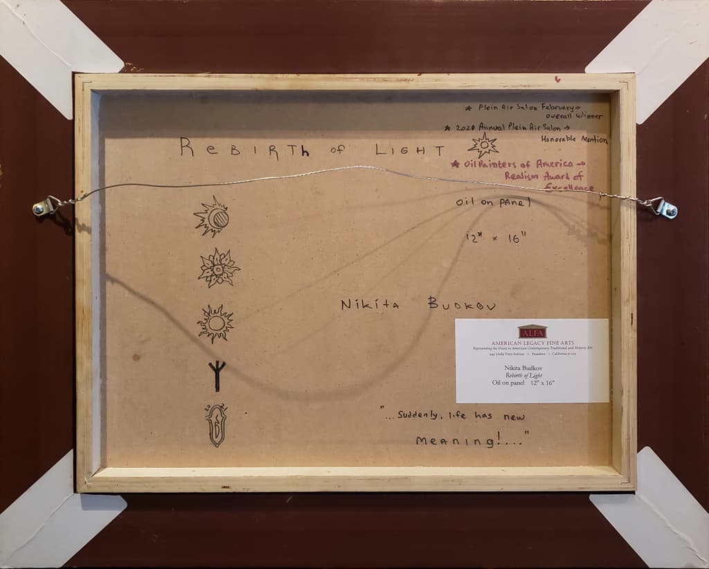 Nikita Budkov Available Work Archives Biography Press and Publications Commissions View in Room Sizing is approximate. See specs for exact dimensions. Watch Video Twitter Email Nikita BudkovRebirth of LightOil on panel12" x 16", artwork16.5" x 20.5" x 1.25", framedContemporaryNot AvailableOut of stock Request More Information Provenance Acquired by American Legacy Fine Arts directly from the artist Description The painting was created en plein air with the artist's wife as his chosen subject. Artist Statement ”The maiden is woken by the warming sun. She is like nature herself, born again after a long and cold winter." —Nikita Budkov Exhibited "Spring Artist Showcase: Nikita Budkov" City of Fontana, April 5 - May 27, 2022 Oil Painter's of America's 2021 Western Regional Exhibition, October 15 - November 27, 2021 California Art Club's "Renewal and Rebirth", March 7 - June 1, 2021 Awards 2021 Oil Painters of America's 2021 Western Regional Exhibition Realism Award of Excellence 2021 Annual Plein Air Salon Honorable Mention Award 2021 Plein Air Salon February Overall Winner Need help? Call our ALFA specialists +1 626.577.7733 Available Artwork by Nikita Budkov