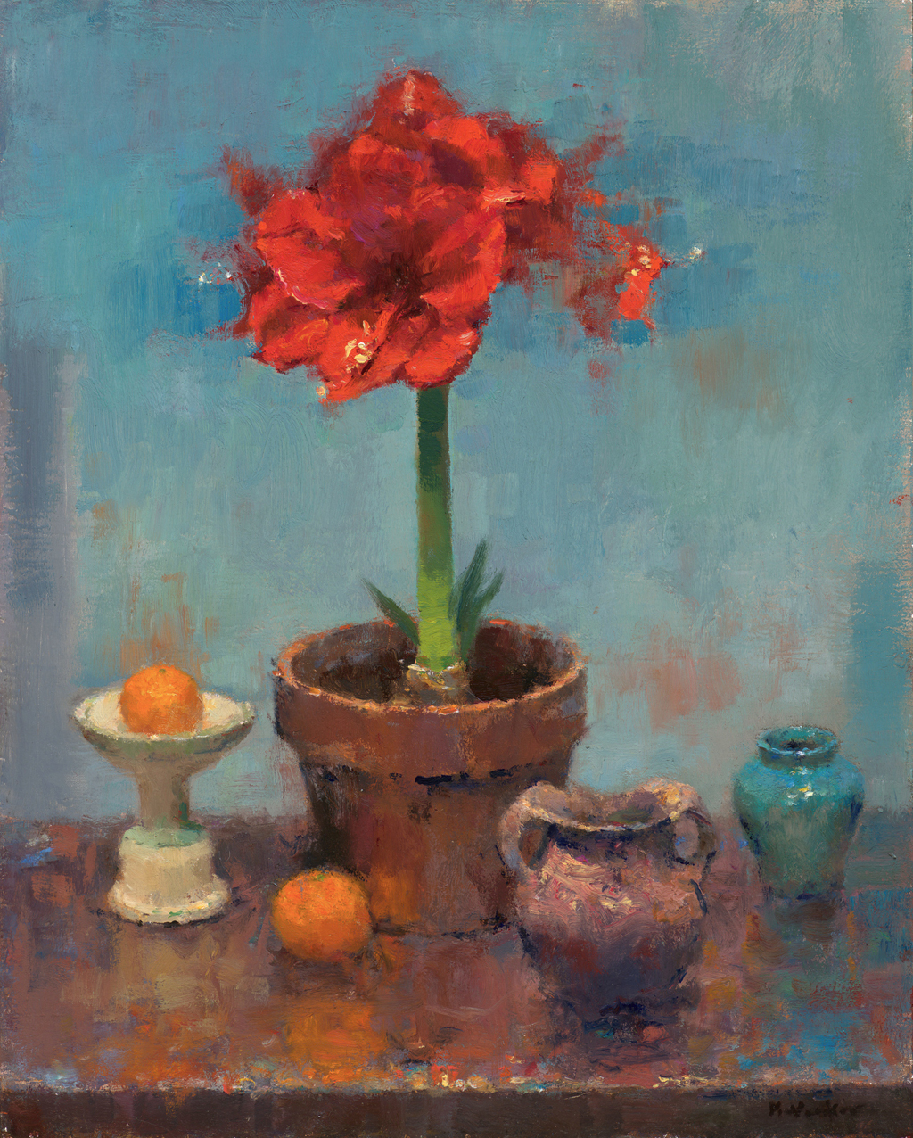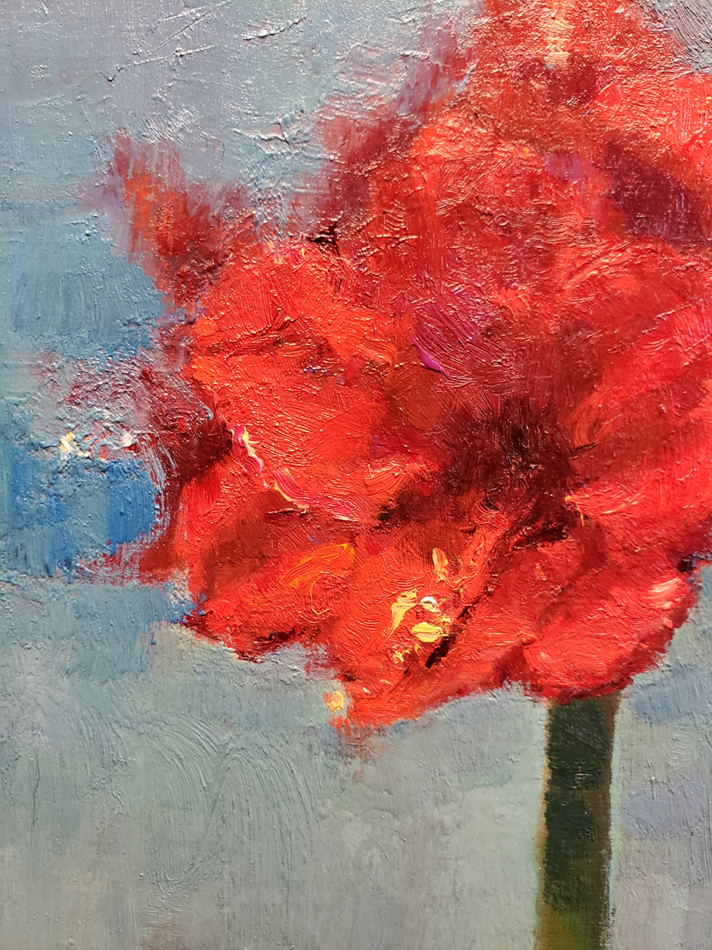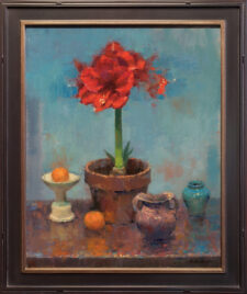“This painting really transformed as I painted. My focus was the amaryllis and then the objects on the table as support. I painted everything as I saw it, with some shifting of the fruit to find the right balance. As I lived with the work, I realized it needed something more.