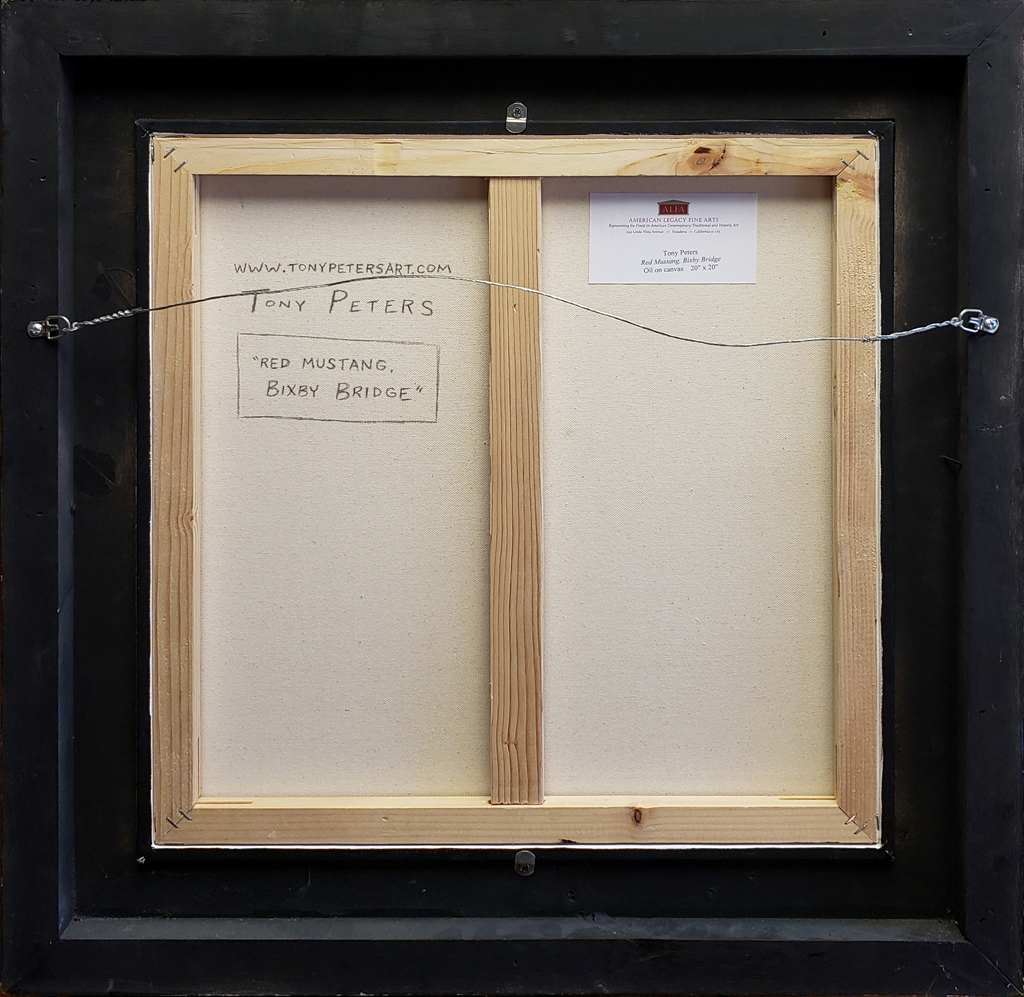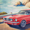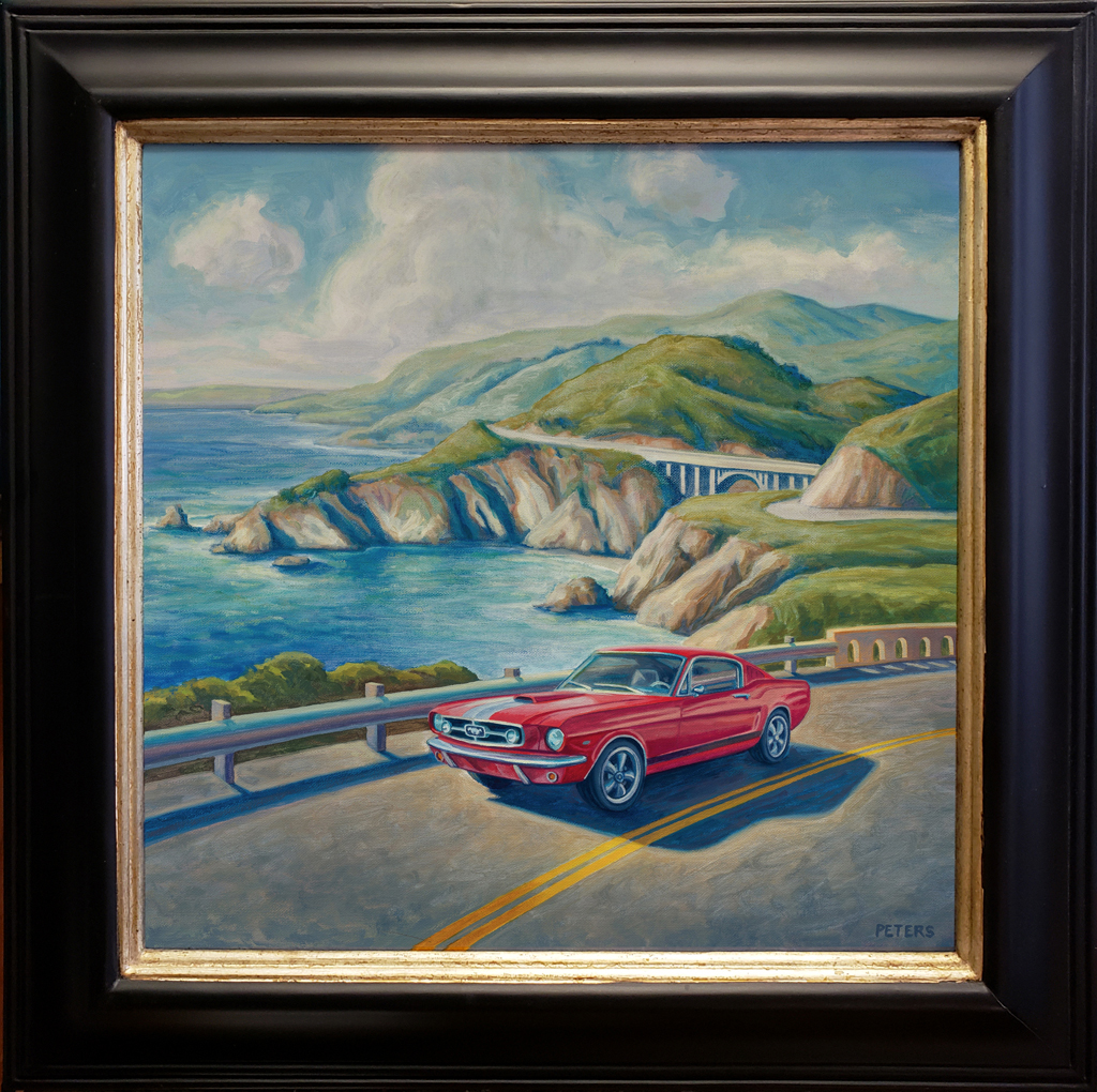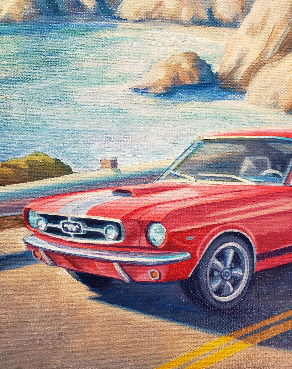 “This painting was inspired by my overwhelming desire to escape Seattle and return home to Southern California. I have driven the Coast Highway a few times en route between the Pacific Northwest and San Diego, always in search of potential subjects for my art, while at the same time avoiding the seeming Zombie Apocalypse to be found along the 5 Freeway. For me, the classic red Mustang is a kind of symbol for simple freedom on the open road. In a way, the setting could be seen as rather timeless, taking place anytime since the mid-1960s. While I am on a long driving trip, I like to imagine myself in this timeless state, unplugged from distractions like my phone, submerged instead in a meditative silence.”