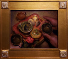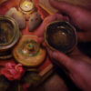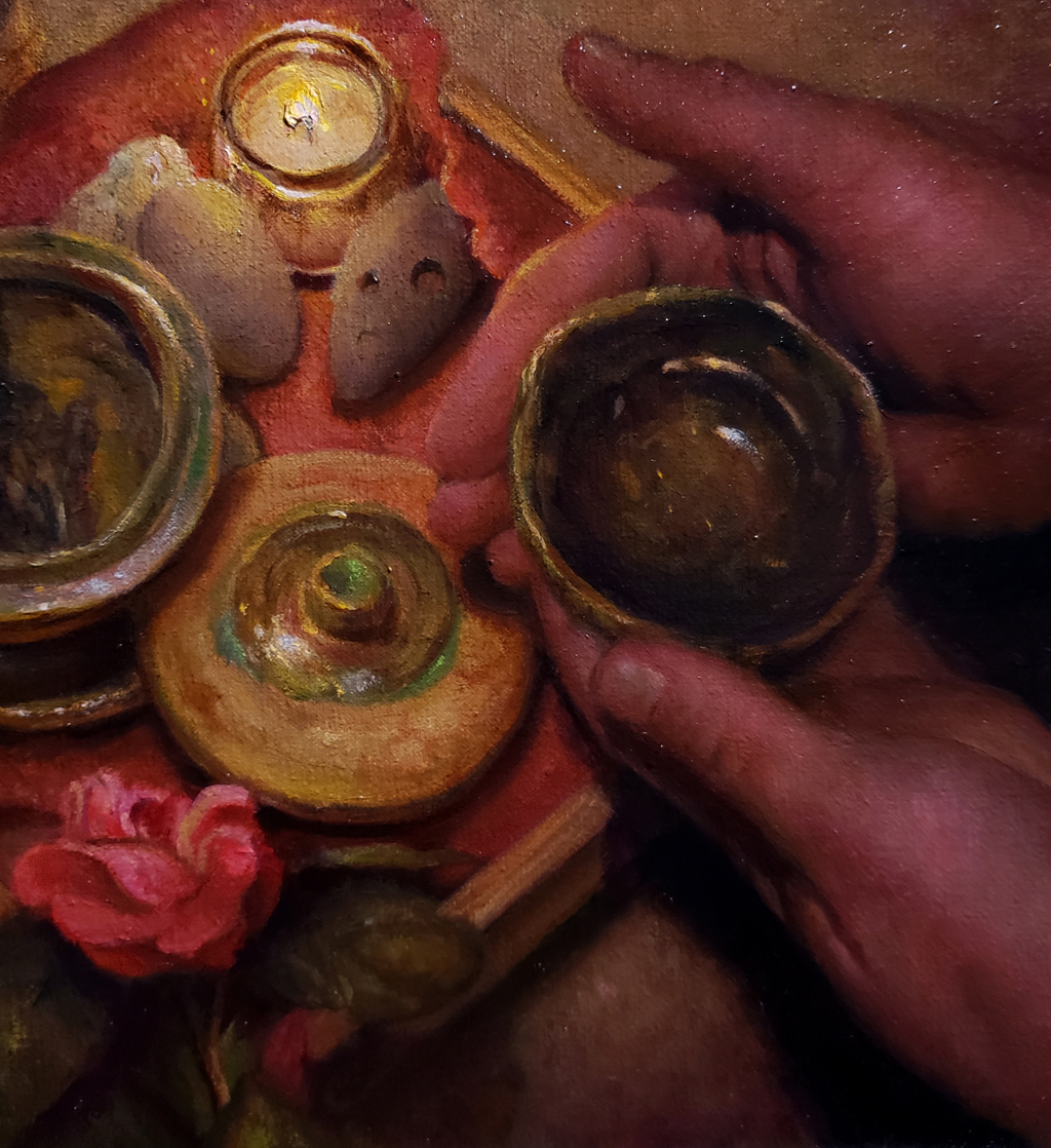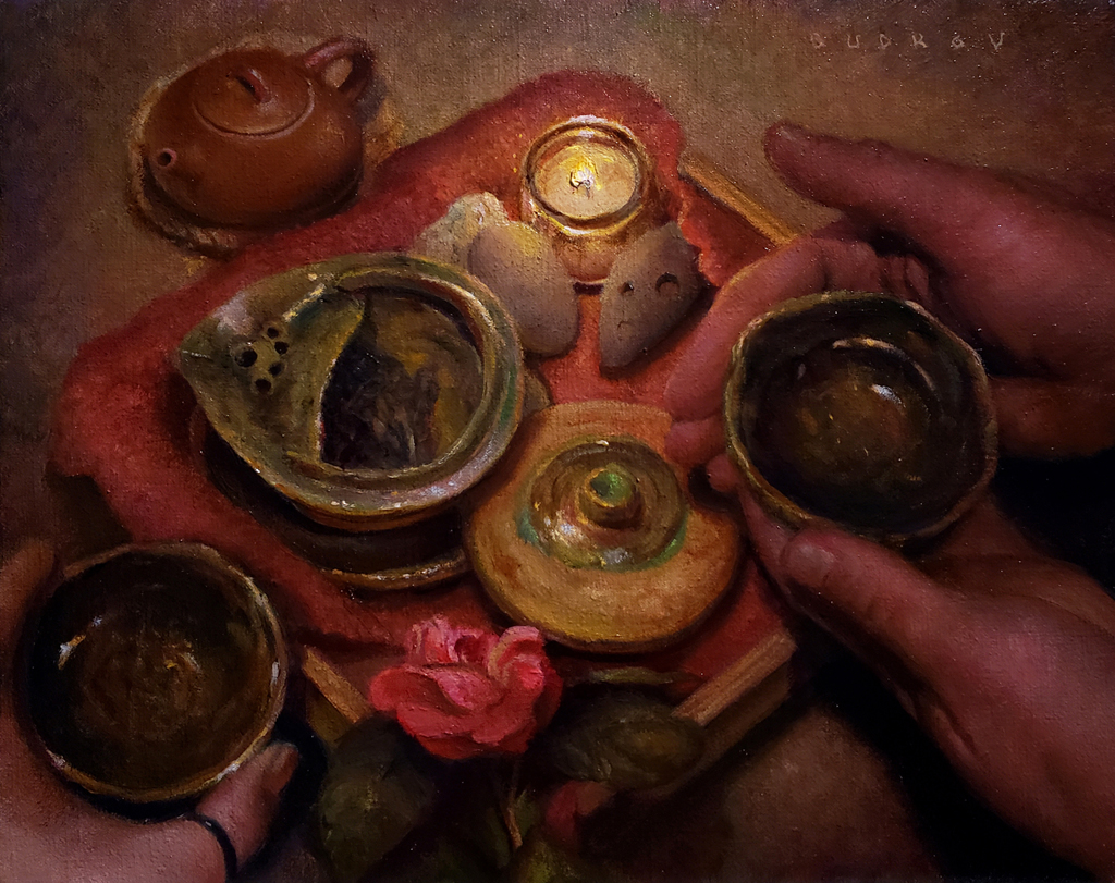 “My beloved wife is a big ambassador of everything about traditional Chinese tea and she quite amplified my interest in the drink too. We like to have cozy tea ceremonies together in the afternoons. and that is exactly what I painted here—our hands holding cups with fancy pu’er. Ceremonial tea stones and a candle lit on a tea tray are there to set the right mood.”