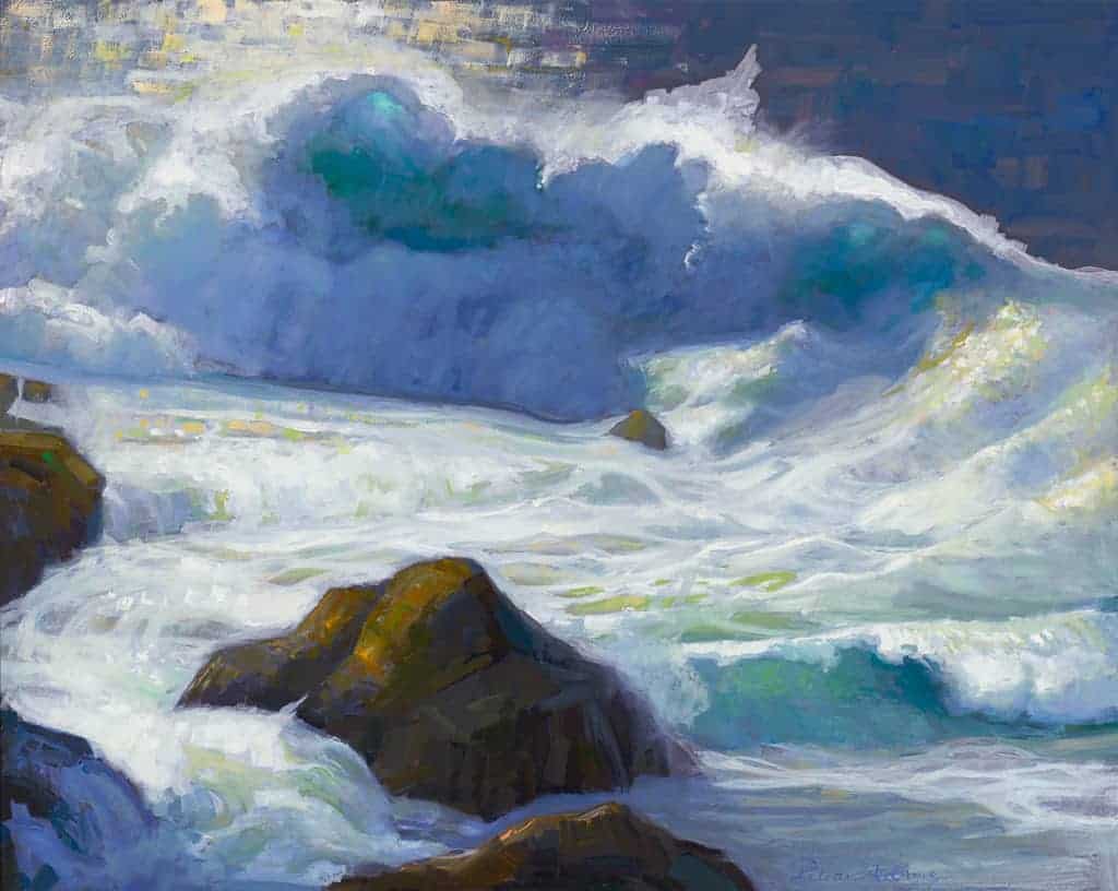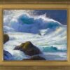 Artist's Statement “In Northern California, the surf is often wild, powerful, and unpredictable. Swells generated by severe storms may come from the southwest and from the northwest simultaneously, and combine to form mammoth waves of extreme force. The sea surrounding these massive breakers actually acts like a white seething cauldron of foam. Yet, even in the midst of churning turmoil, there are areas of peace and tranquility. I am awed by the power of nature and humbled by it. To view and paint these breaking waves from a safe location was a thrilling experience.”