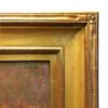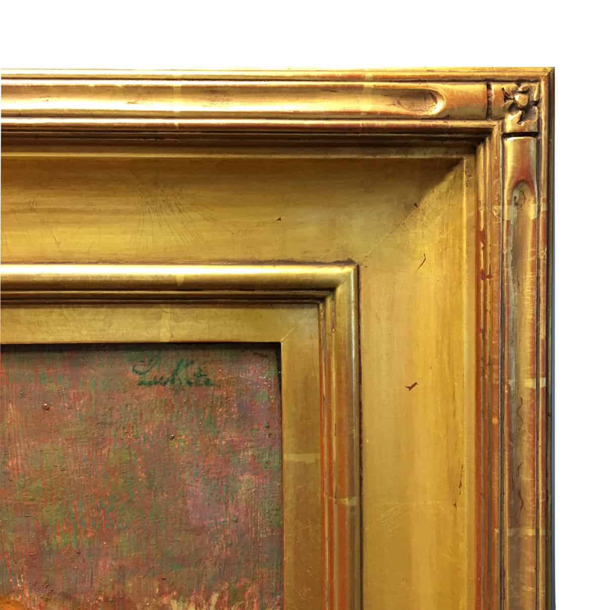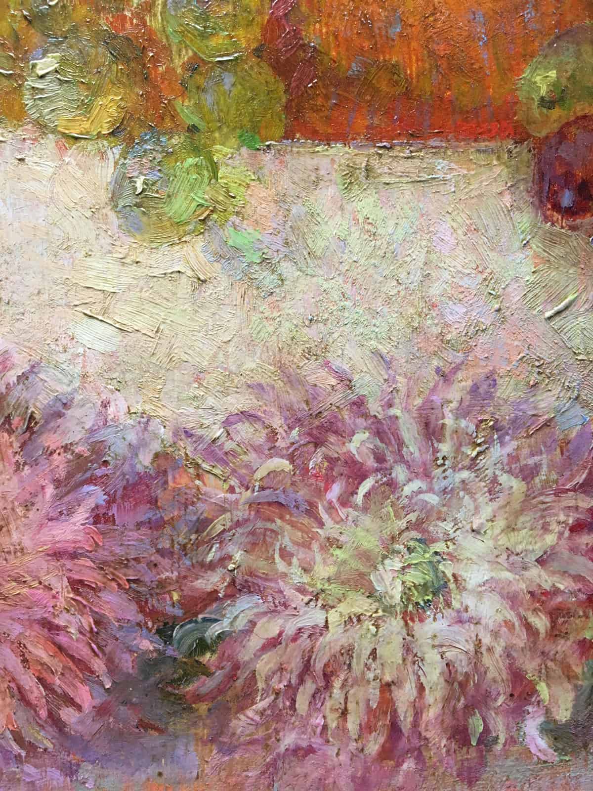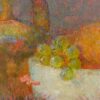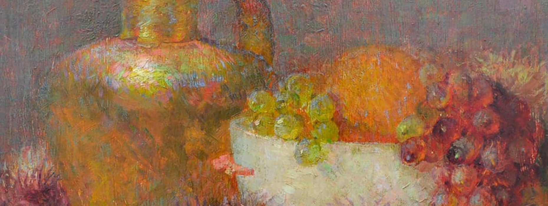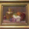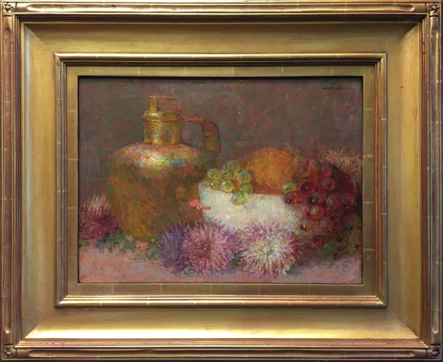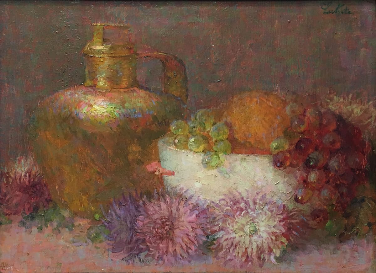Applying subtle qualities of color and light, Theodore Lukits created a poetic ambiance in this Depression-era oil painting depicting a rural harvest still life. The scene shows a white ceramic bowl containing perfectly ripe oranges and clusters of firm green and red grapes. At the apex of the skewed pyramid-shaped composition is a copper jug perhaps filled with cold milk. The freshly cut chrysanthemums decorate the table and complement a simple afternoon treat reminiscent of Southern California agriculture in the 1930s.