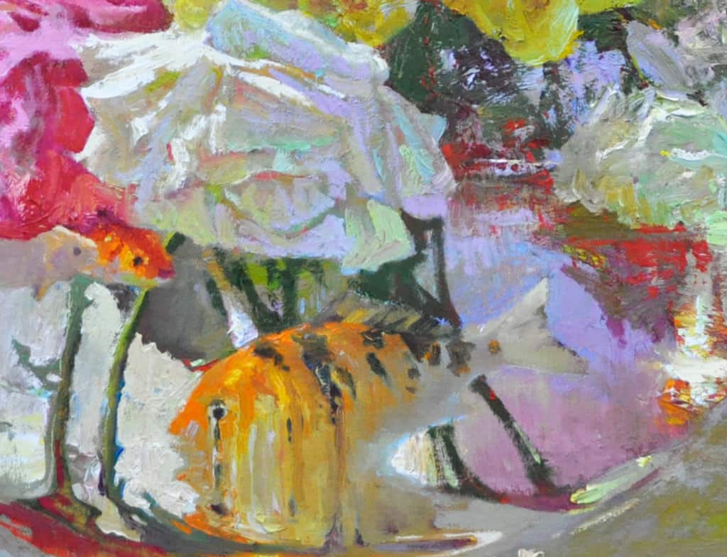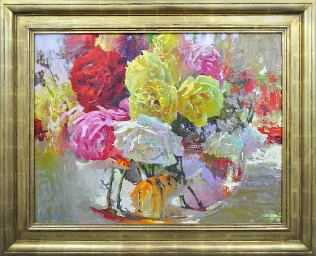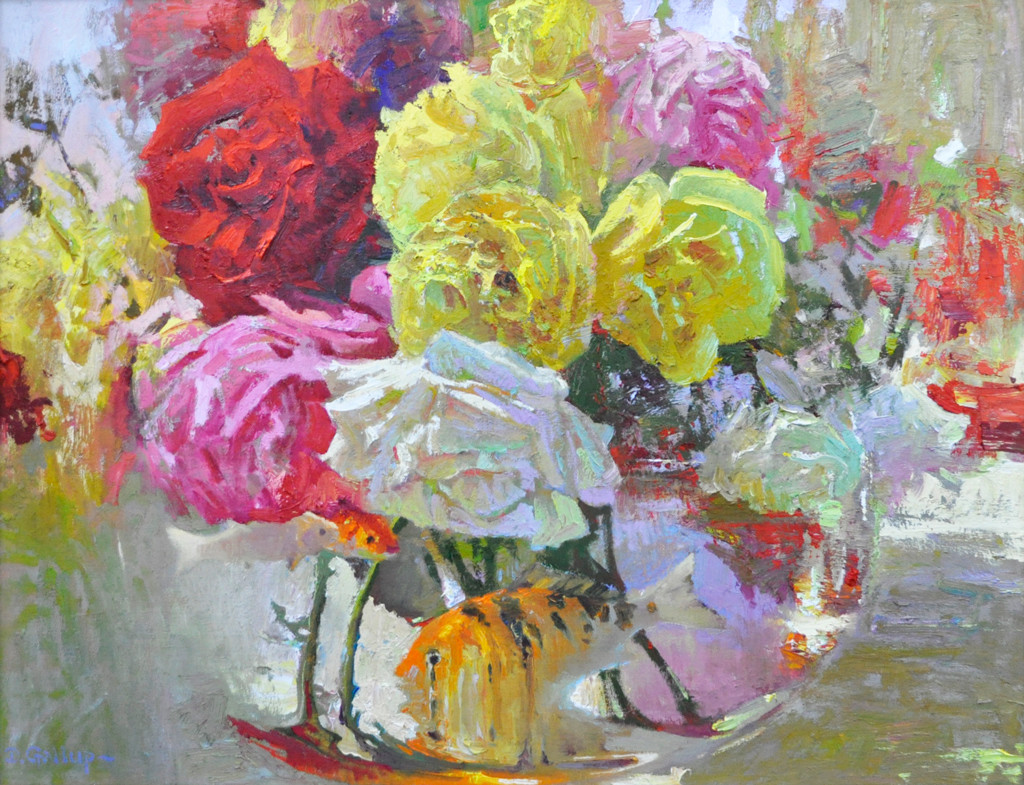 “I have two favorite subjects: fish, and flowers. Only rarely are these two subjects found together in nature, so this painting took a bit of staging. It is my goal to both lose the subject in paint and simultaneously present it in an honest and convincing way. Thereby as space and motion let the scene fall in and out of focus then, color, shape, and value become the subject, thereby losing themselves into the confines of representation, only to find themselves important again in a whole new way.”