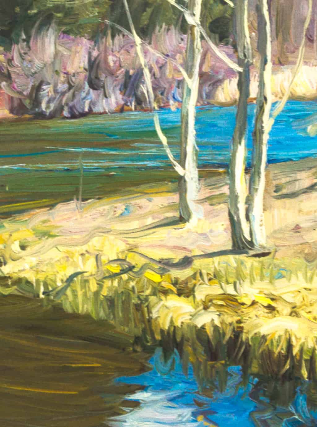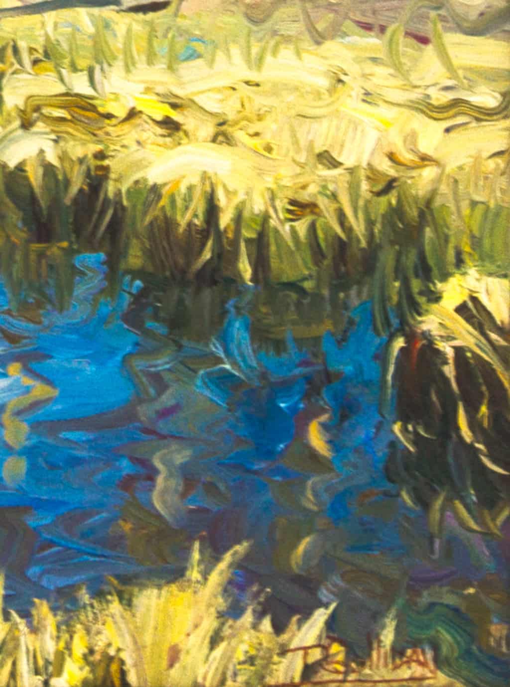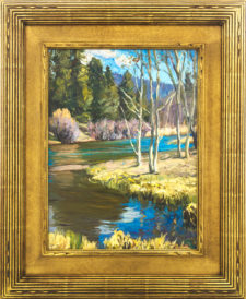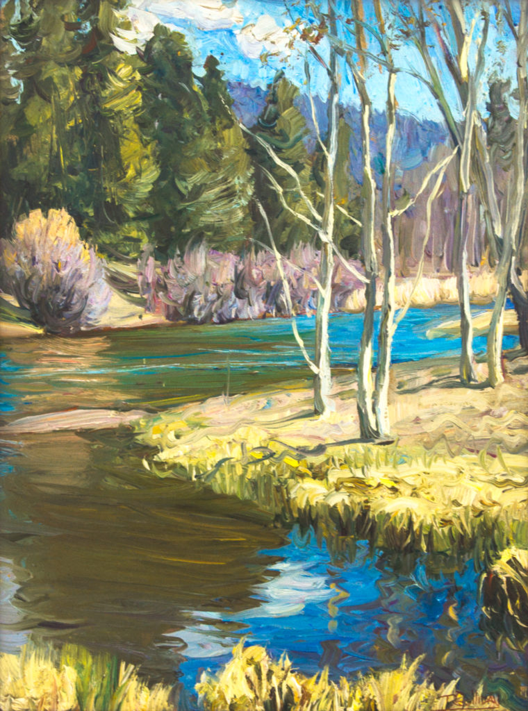 Description "Running Waters" is a plein air painting done in Taos, New Mexico. Solliday depicts the Rio Peublo de Taos, a tributary of the Rio Grande, as flowing abundantly after the winter thaw. The sky is clearing, the stately pine trees have survived the cold winter, and the marshy grass will soon be green again.