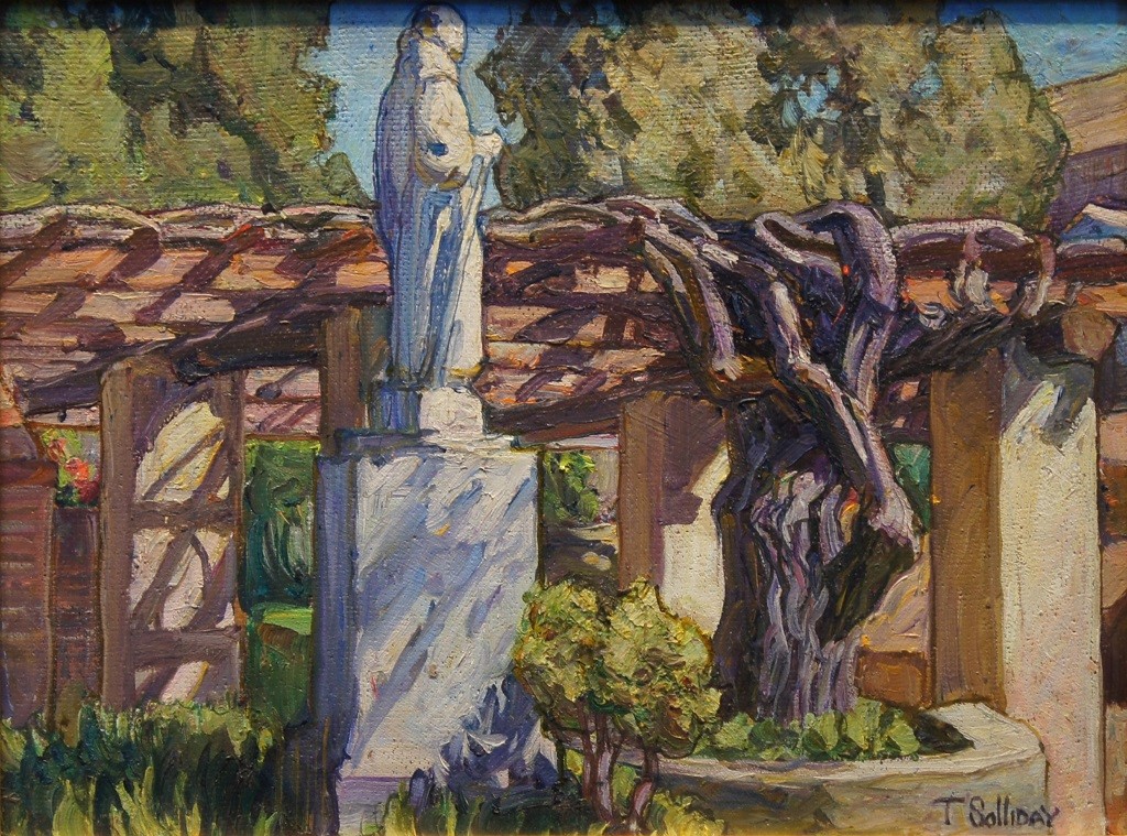 Tim Solliday's San Gabriel Mission depicts a breezy courtyard with lush greenery. This contemplative painting invites the viewers to lean closer and imagine themselves taking a stroll around the picturesque mission.