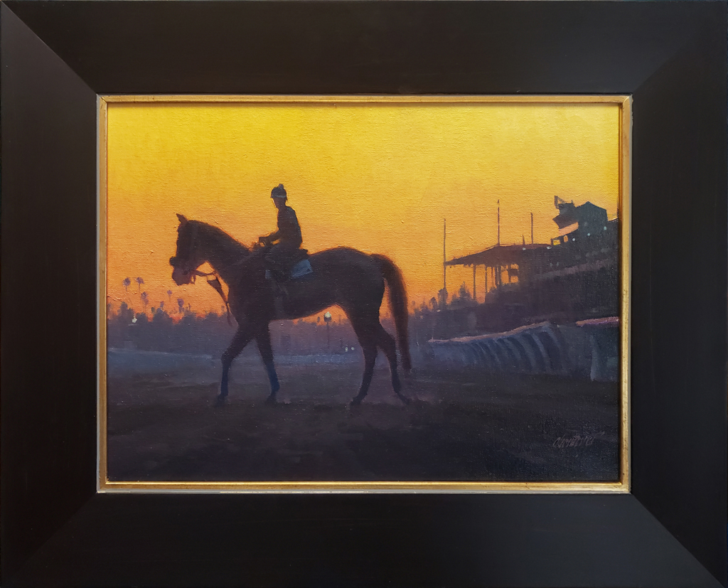 "Before dawn at Santa Anita Racetrack is a very busy and active time. The horses are out early for their training runs and I was fortunate to experience this activity from right down on the track. I was struck by the beauty of the horses and grandstands silhouetted against the glow of the impending sunrise. "