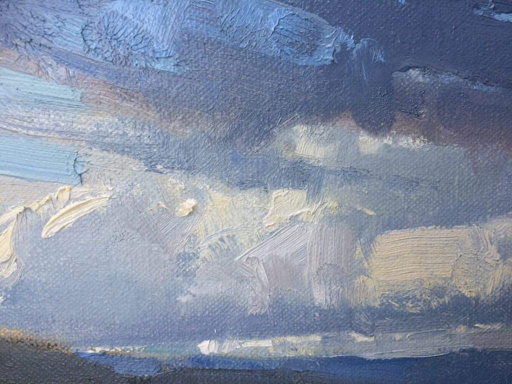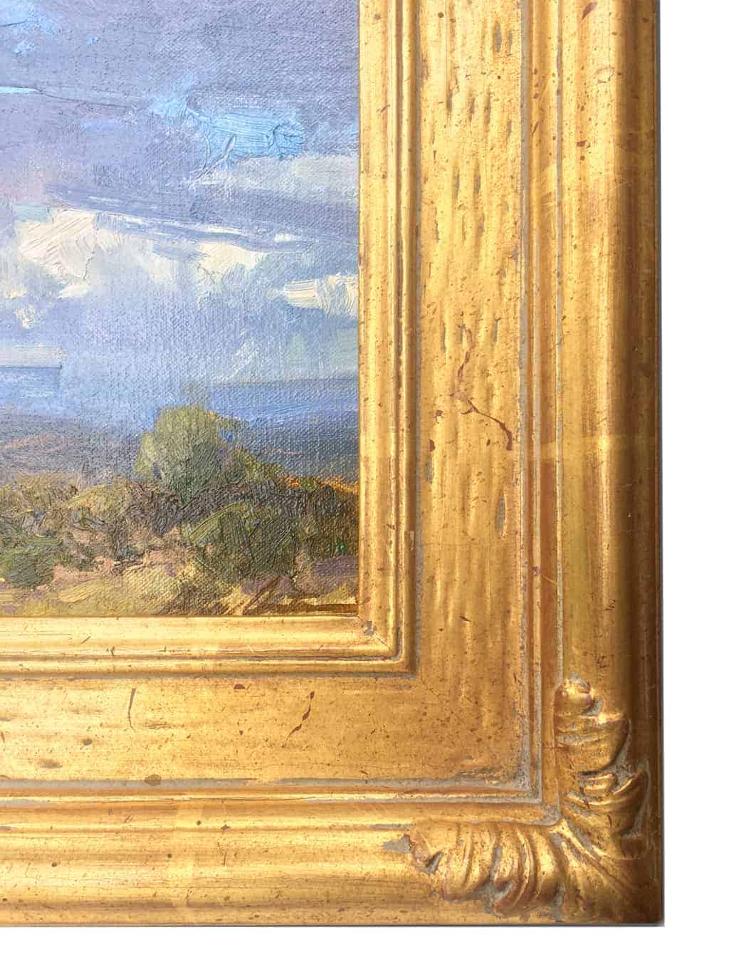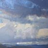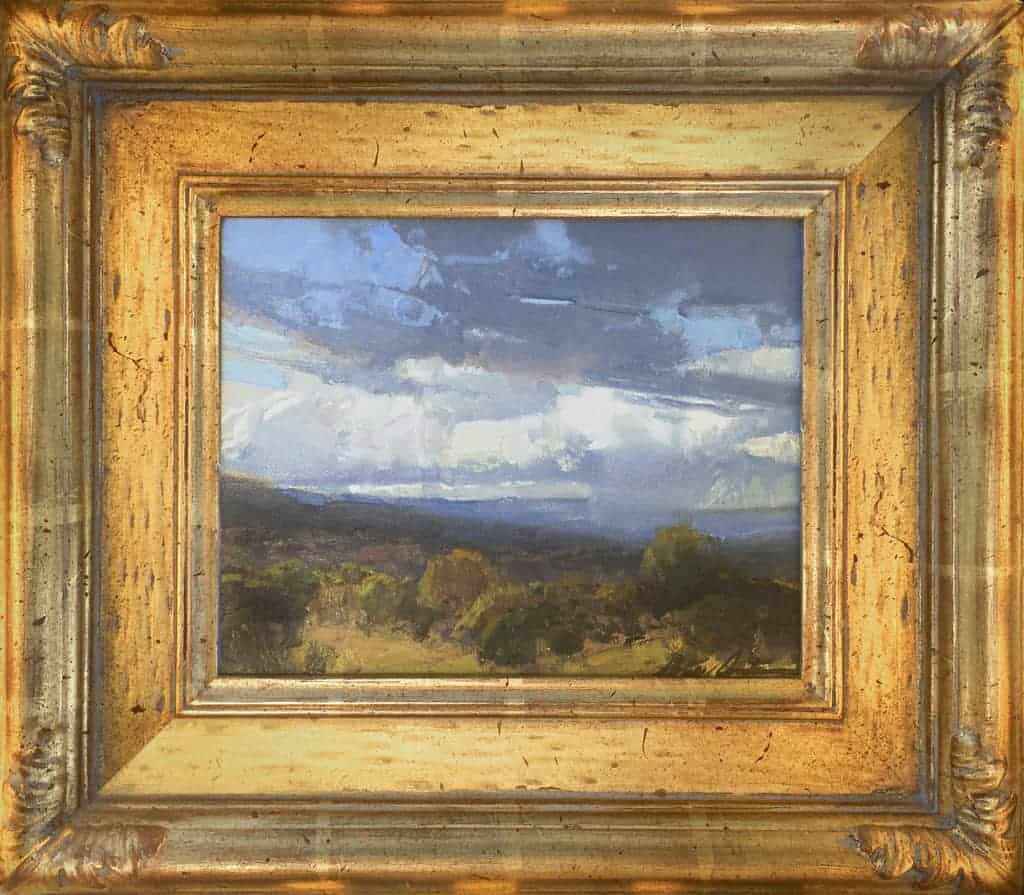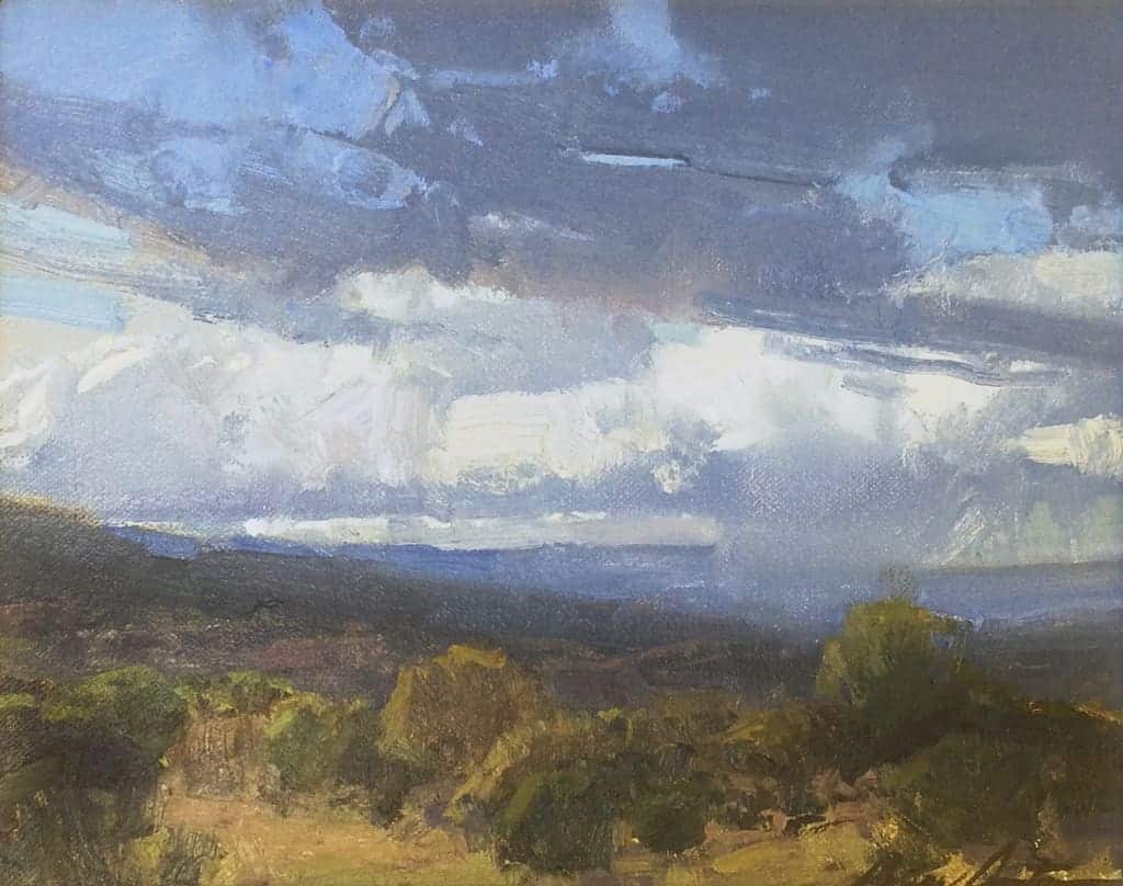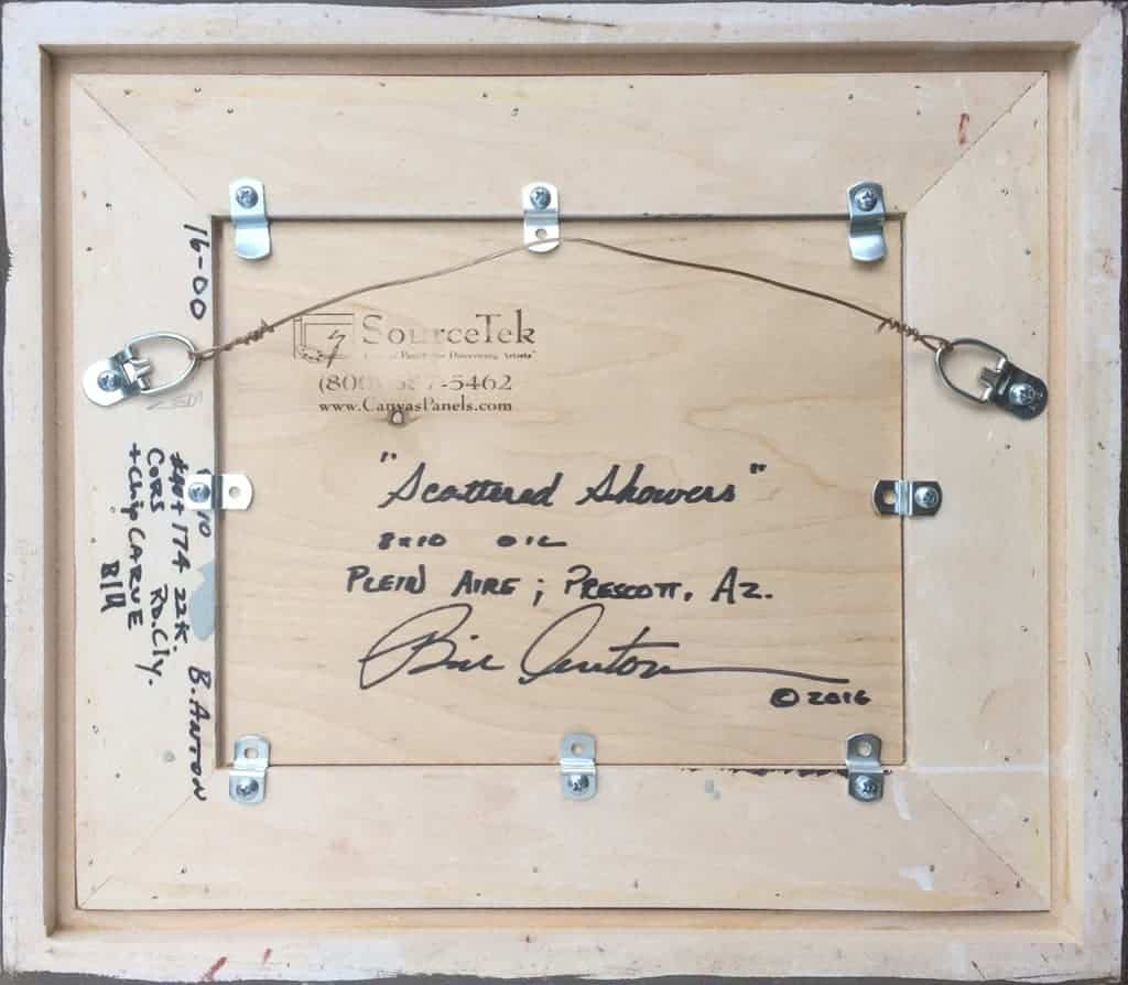 Artist Statement "Scattered Showers was painted on location on my property in Williamson Valley one fragrant spring afternoon. The view from my barn overlooks miles of rugged, cow country sprinkled with juniper, pinyon and live-oak . The mountain mahogany and cliff rose bloom fresh green while the live oaks turn a fall-like amber in the late afternoon sun. Spring rain bathes distant Juniper Mesa, likely some of the last moisture it will see until the summer monsoon arrives."