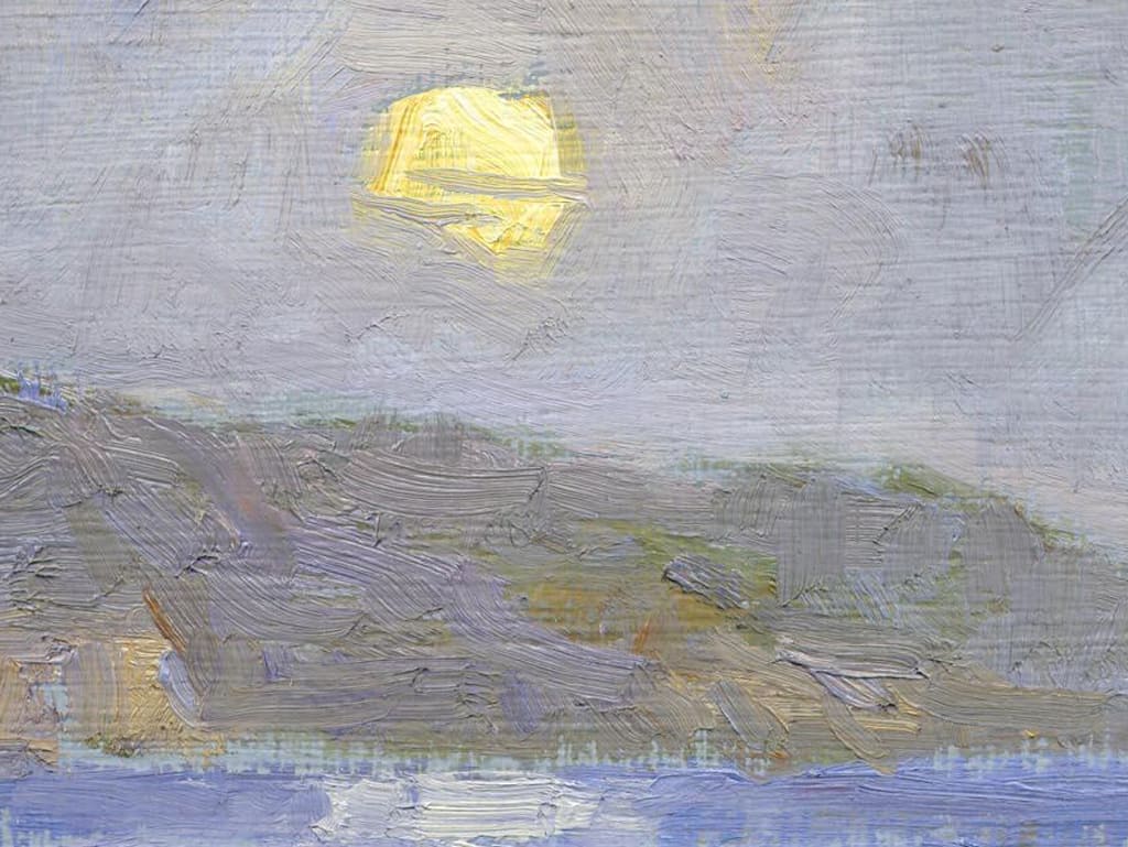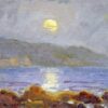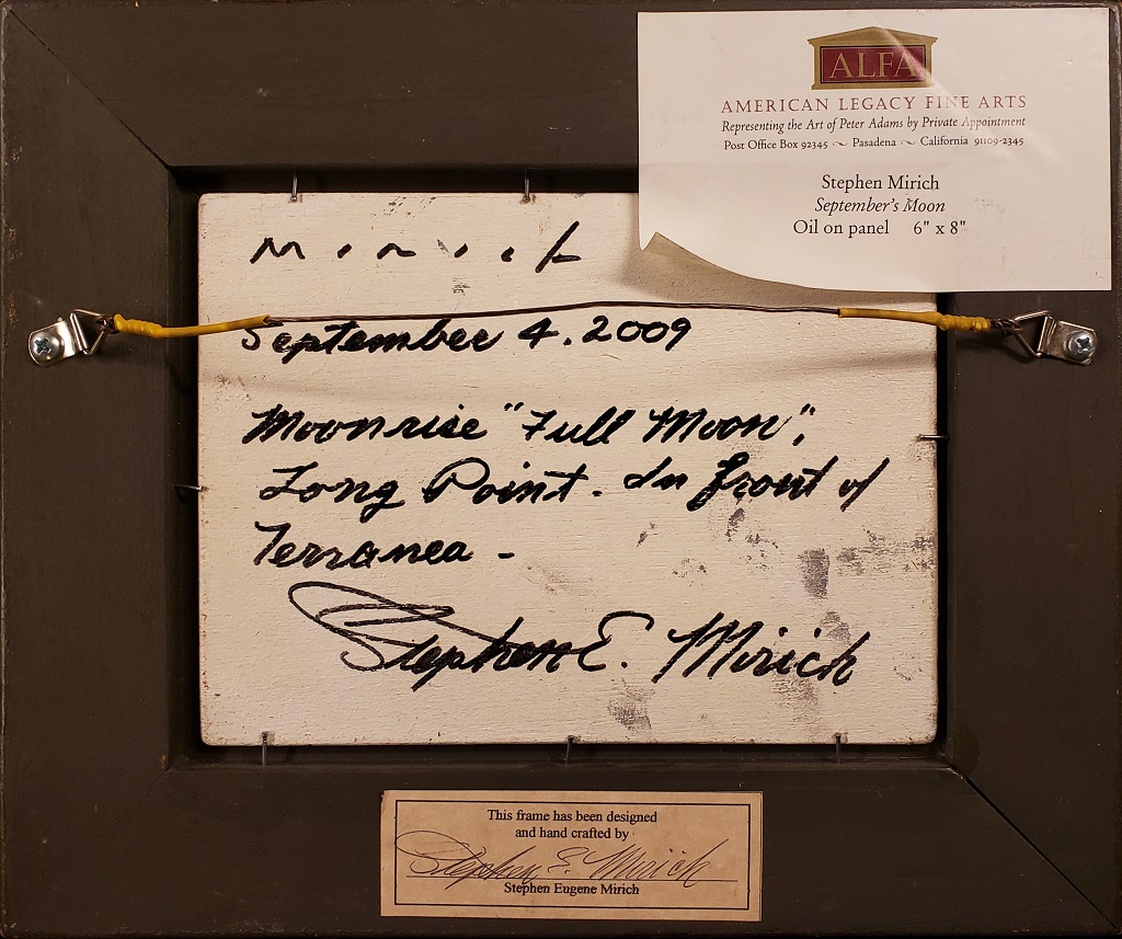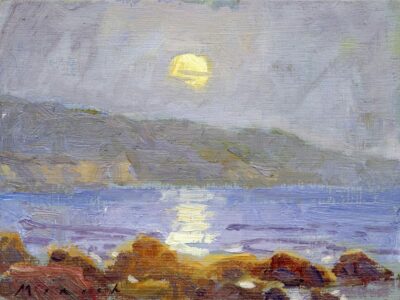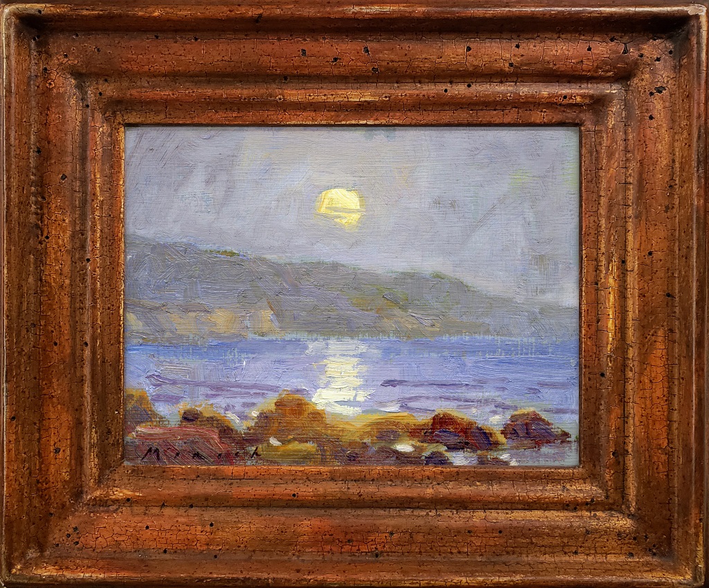 Stephen Mirich's attraction to the great outdoors and the sea is brought together in this intimate and romantic painting. Mirich frequently goes out to paint during full moons and is particularly interested in capturing the effects of moonlight on water.
