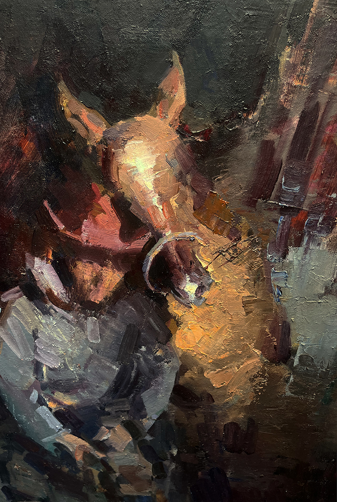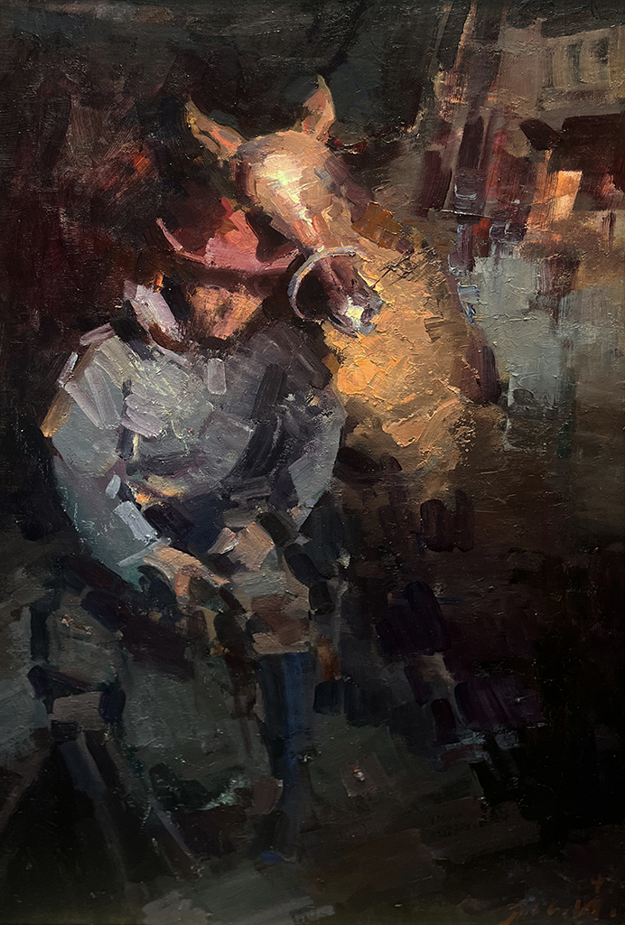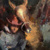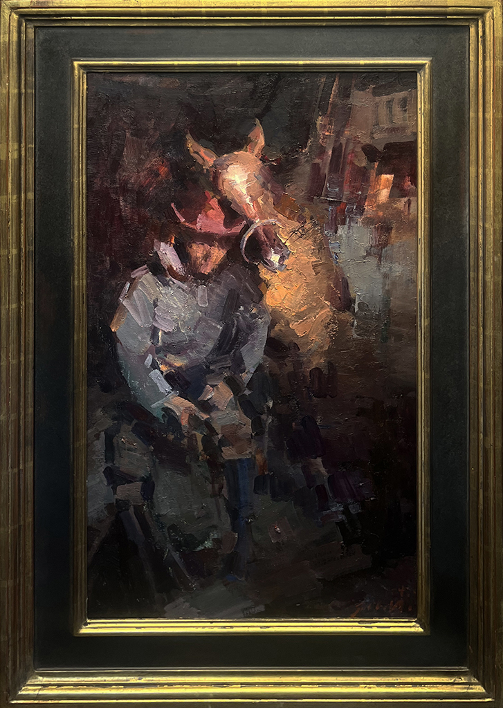 “A cowboy caringly forges a horseshoe for his horse standing beside him. The painting radiates a sense of love, loyalty, and deep friendship, capturing the enduring bond between them as lifelong partners.”