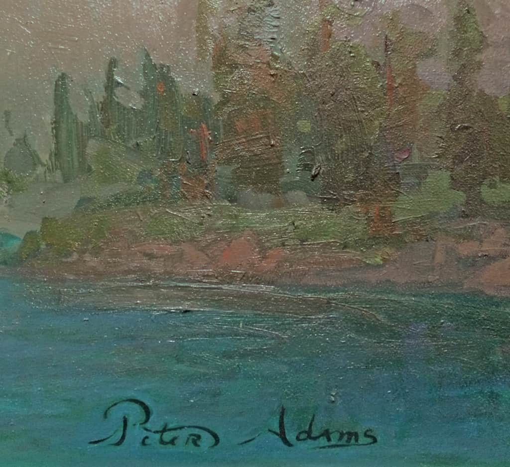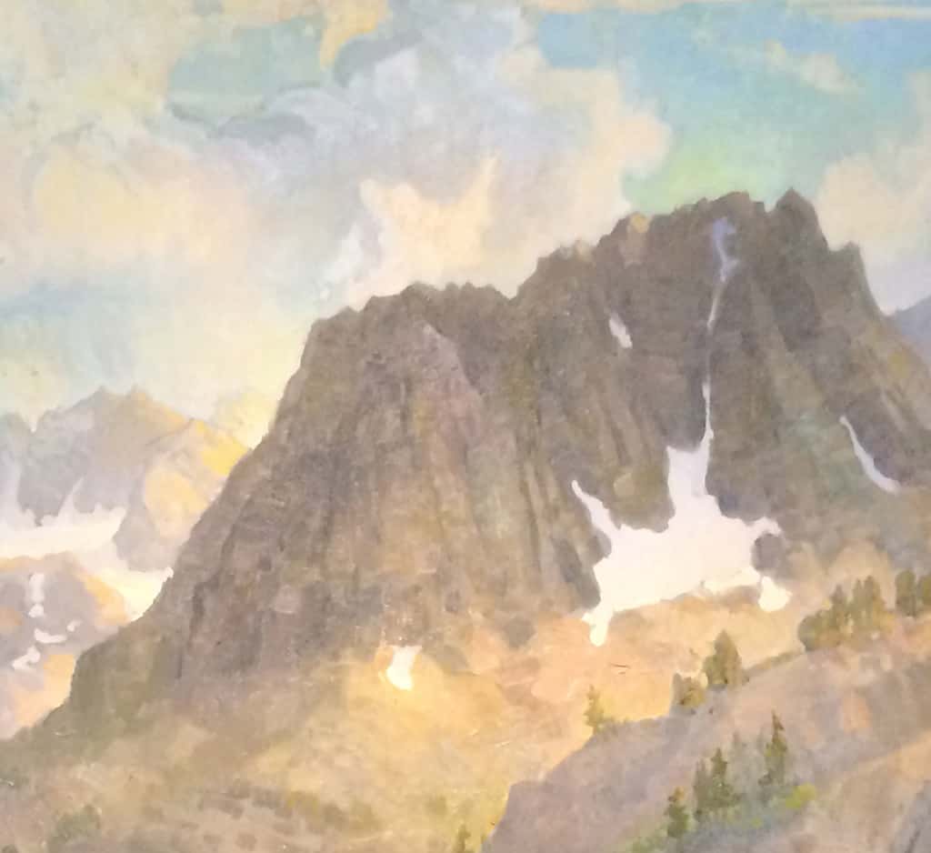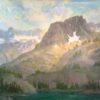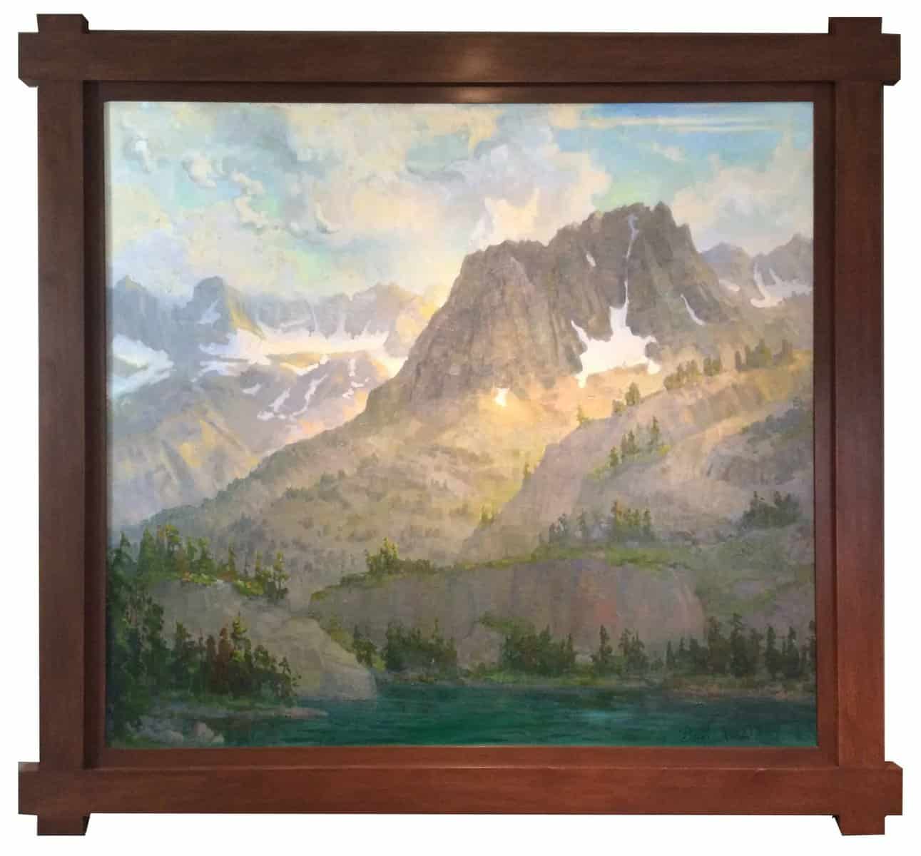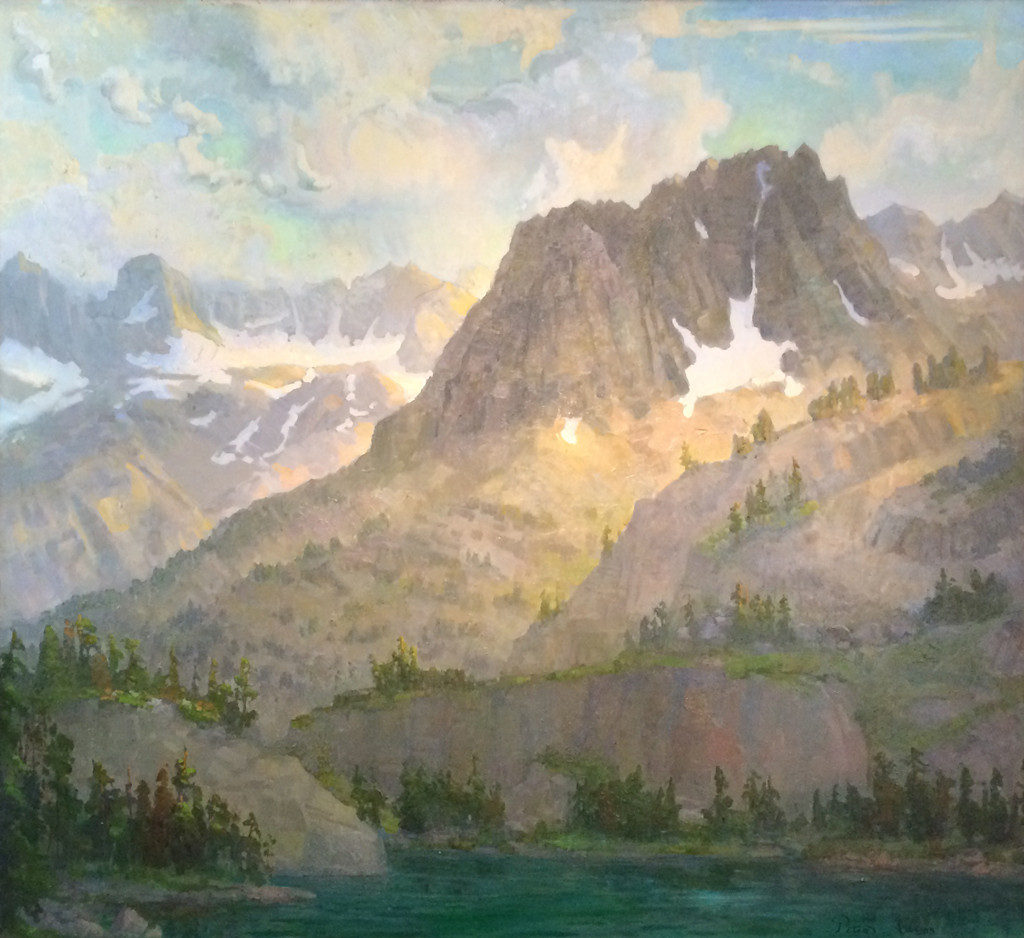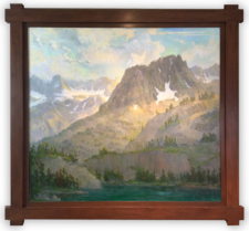 The painting was created from the artist's original plein air study during the early summer of 2004 and depicts a scene in the Big Pine area of the Sierra Nevada. The view is from Fifth Lake looking south. Visible in the middle ground is Mt. Robinson (elev. 12,967 feet) with the Palisade Glacier behind to the left. To access this location, Peter Adams mule-packed for two weeks during which time he created several studies in oil and pastel.