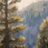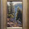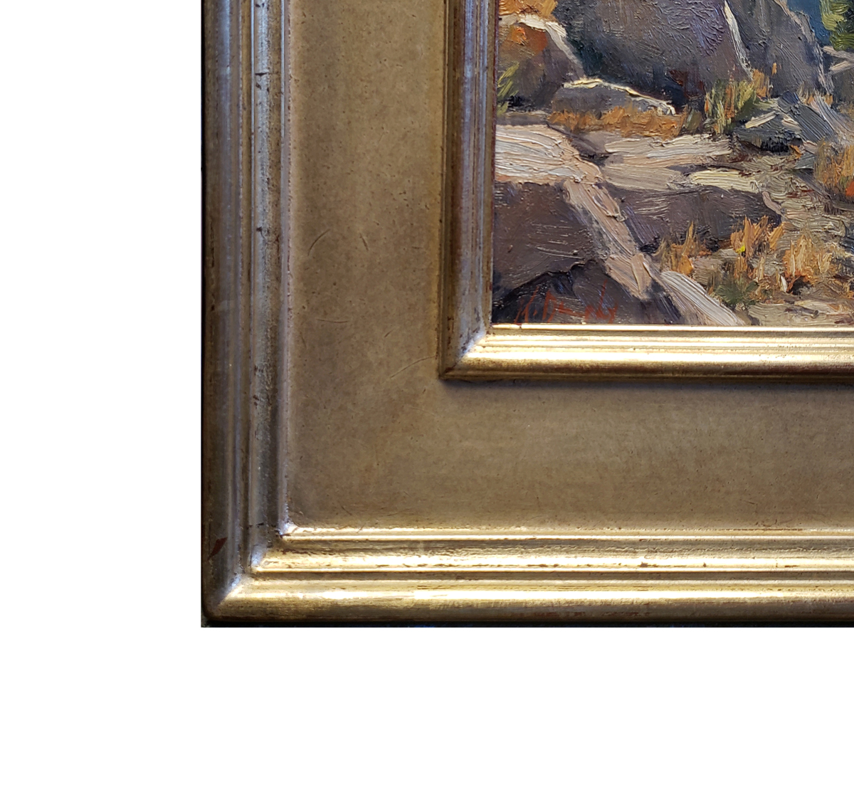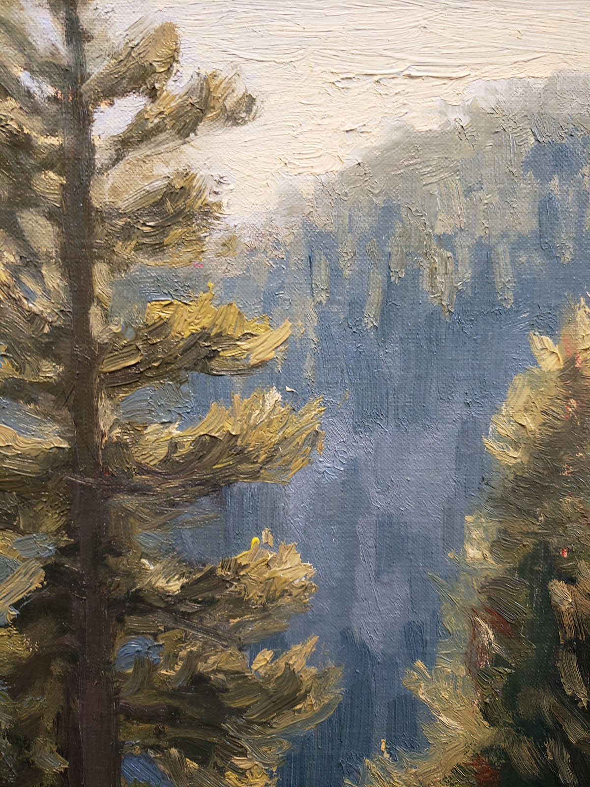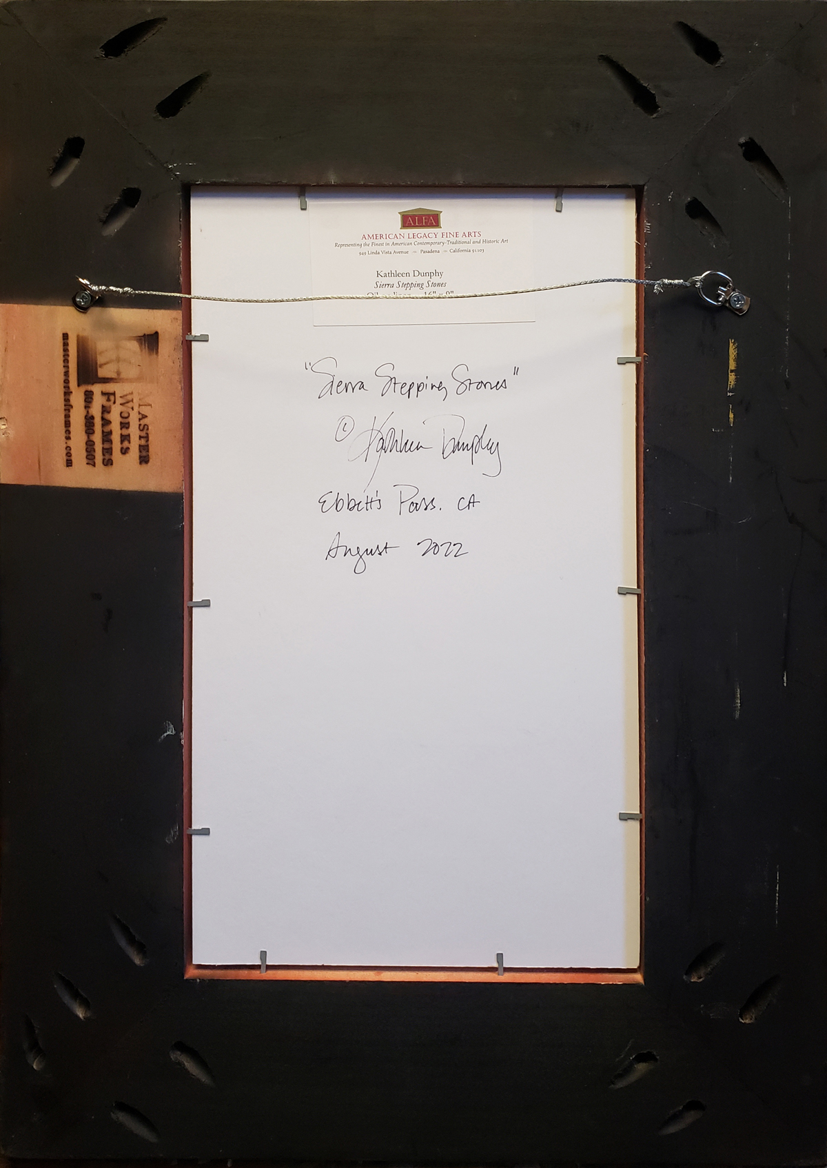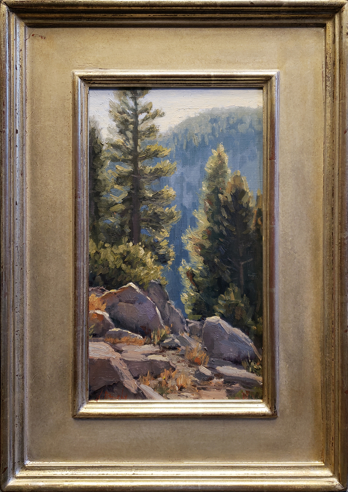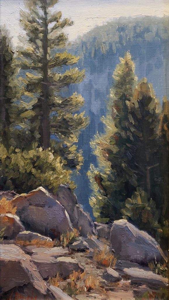 This plein air oil painting created by Kathleen Dunphy represents a subject that is in the artist's immediate surroundings, where she lives at the foothills of the Sierra Nevada. The warm light reflecting off the rocks and the tall pine perched atop a high mound invite the viewer into this rugged scene. Dunphy encourages the viewer to enjoy a hike in nature.
