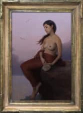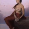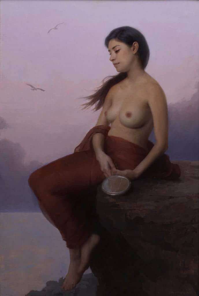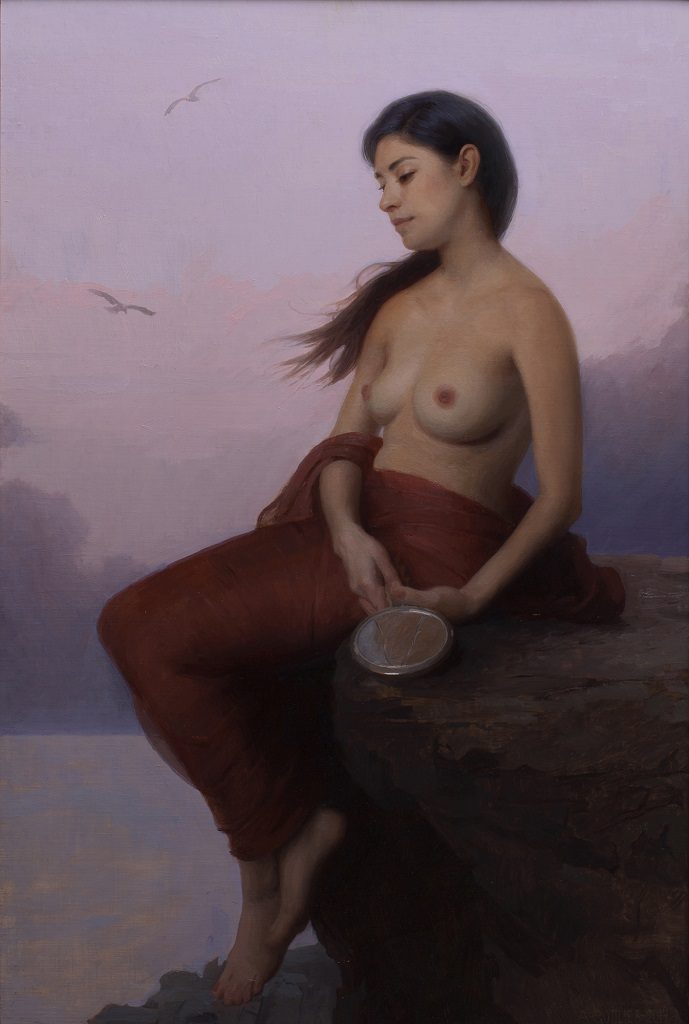 The tales of beautiful women luring men to destruction by leading them with the sound of their sweet voices come from Greek mythology. A Siren was thought to be a half human female and half bird. As described in Homer's Odyssey there were two Sirens living on an island located between Aeaea and the rocks of Scylla in the western sea. The mariners who heard their enchanting songs were compelled to sail toward them, only to meet fatality by crashing their ships on the rocky coast. In Gottlieb's painting, Siren Song, he implies a comparison of the mythological creature to a modern-day temptress who is aware of her beauty and knows how to dominate within her realm. The surrounding soft, tonal purples of the dawn light add to the sense of magic in the scene.