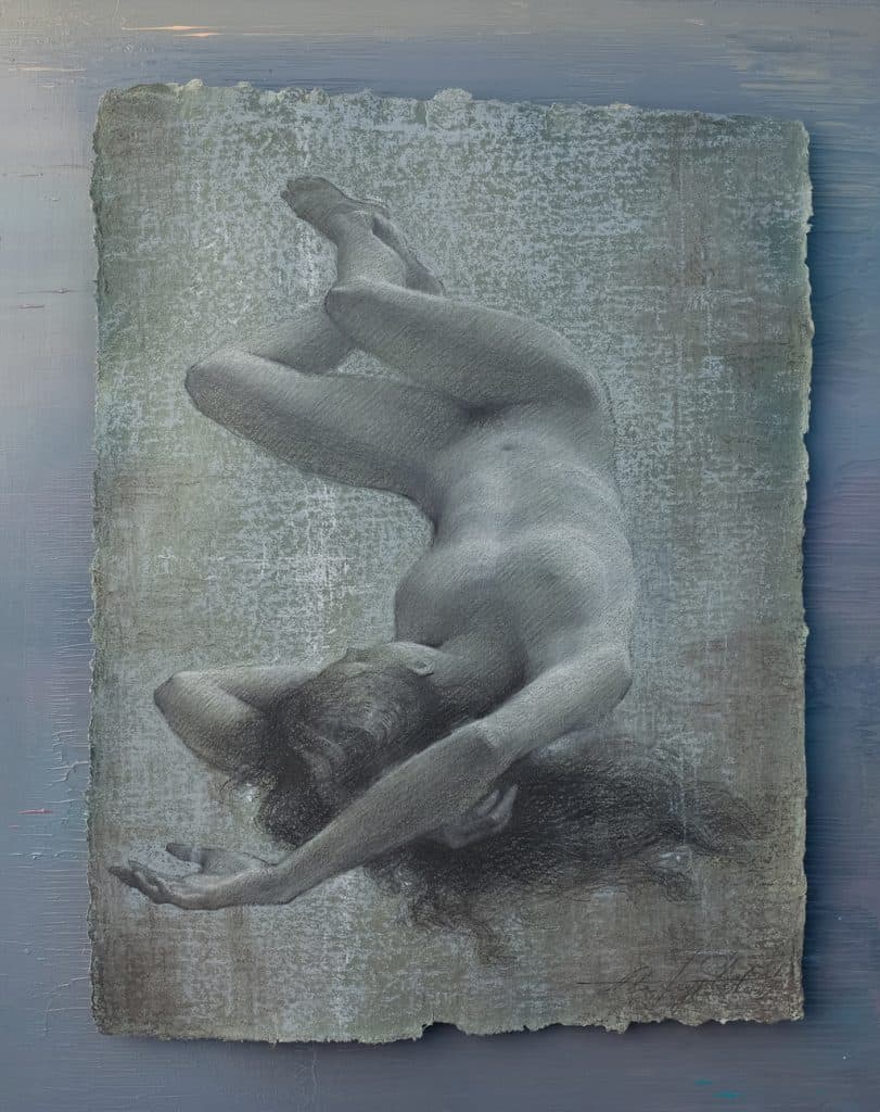 Description This masterful drawing is part of Alexey Steele’s "Torn Beauty" series, a collection of work that marks a milestone in the artist’s lifelong fascination with works on paper. Steele maintains that drawing is the universal foundation of all forms of representational art. His highly-developed tonal depiction of forms, in addition to refined subtleties in value definition, emphasizes Steele’s particular artistic approach to utilizing classical skills. The final result is that we experience the human form as an ethereal sensation.