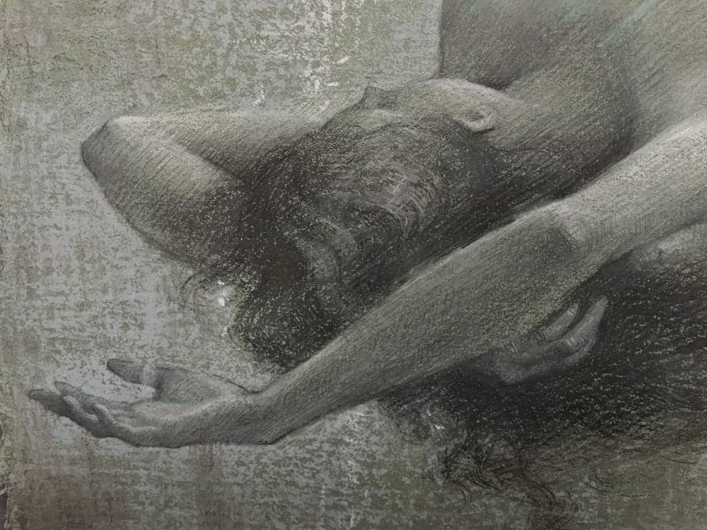 Charcoal and pastel pencil on handmade De Ponte paper mounted on oil on panel