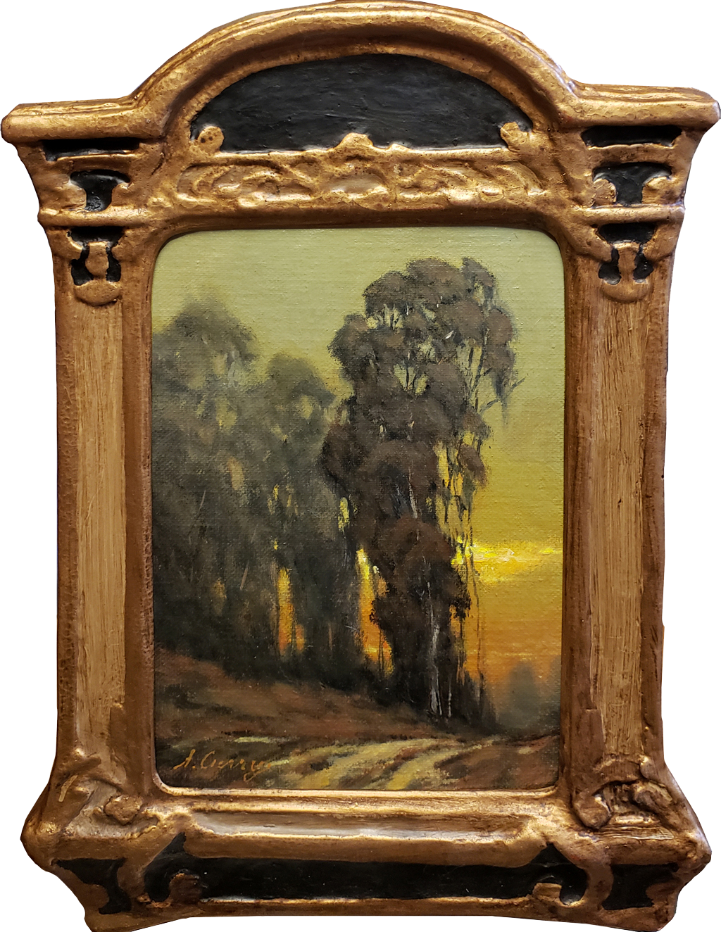 “This scene is from the Ojai meadow preserve and although the groves of Eucalyptus trees are not indigenous to the area, they are my favorite subjects to paint. On certain foggy mornings the early light will break through in dramatic ways, giving an almost stained-glass appearance.”