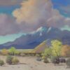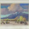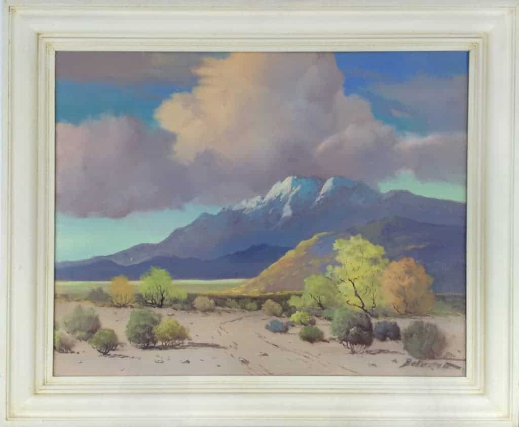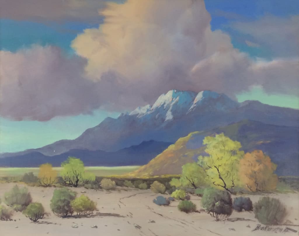 This luminous desert landscape, painted in rich yet delicately modulated tones, depicts California’s Palm Springs Desert with a scattering of smoke trees, low shrubs, and drifting tumbleweeds beneath a grand, cumulus-laden sky. George S. Bickerstaff’s deft handling of light captures the arid clarity of the Coachella Valley, while his composition, anchored by the distant, snow-tipped San Jacinto Mountains, leads the eye gently into the expanse. The combination of warm desert foreground and cool atmospheric distance is characteristic of Bickerstaff’s plein air practice, which sought to preserve California’s unspoiled beauty during the mid-20th century.
