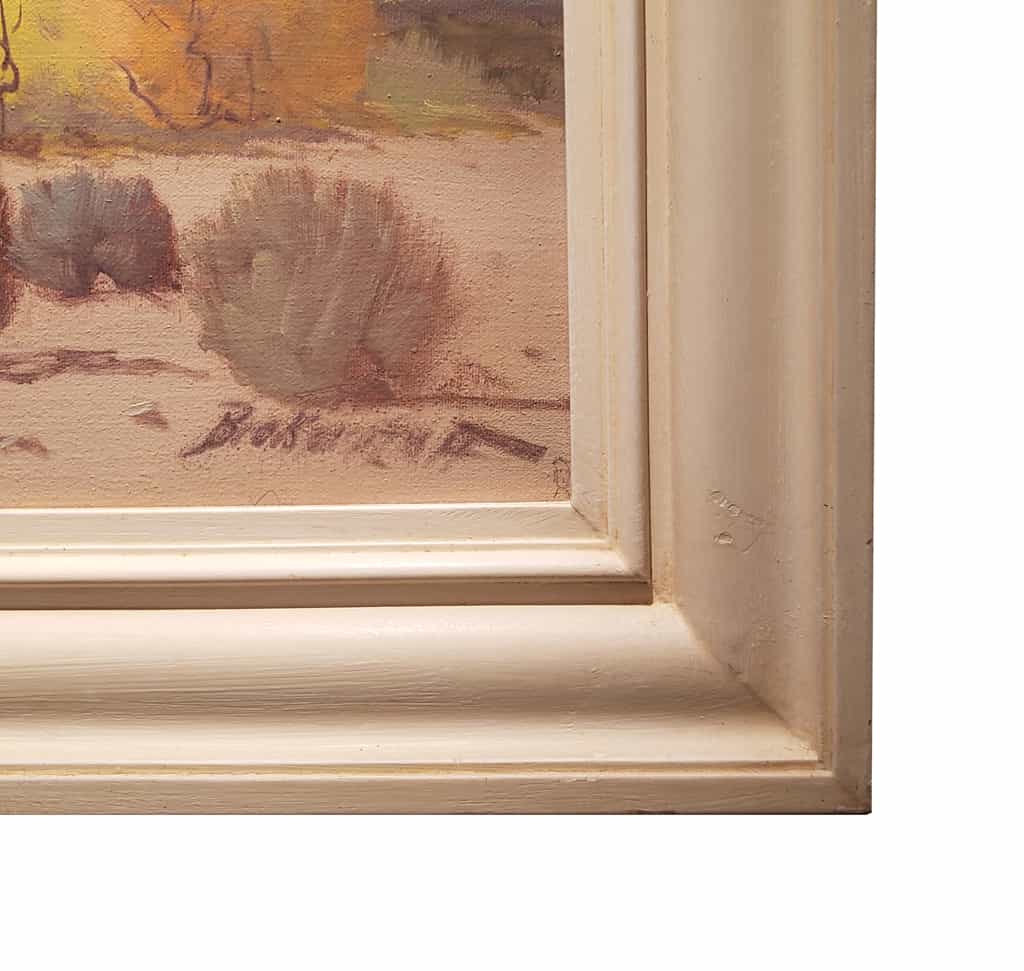 The painting is presented in a period-style, wide-profile wood frame finished in a softly distressed antique white. The molding features gently rounded outer edges and an understated inner fillet, lending a subtle elegance without competing with the composition. The light-toned finish enhances the desert palette of the painting, particularly the luminous sky and foliage, while providing a fresh, airy complement that draws the viewer’s attention directly to the scene.
