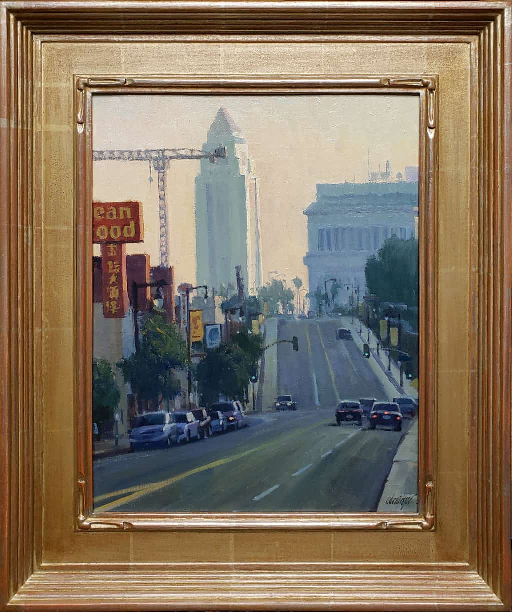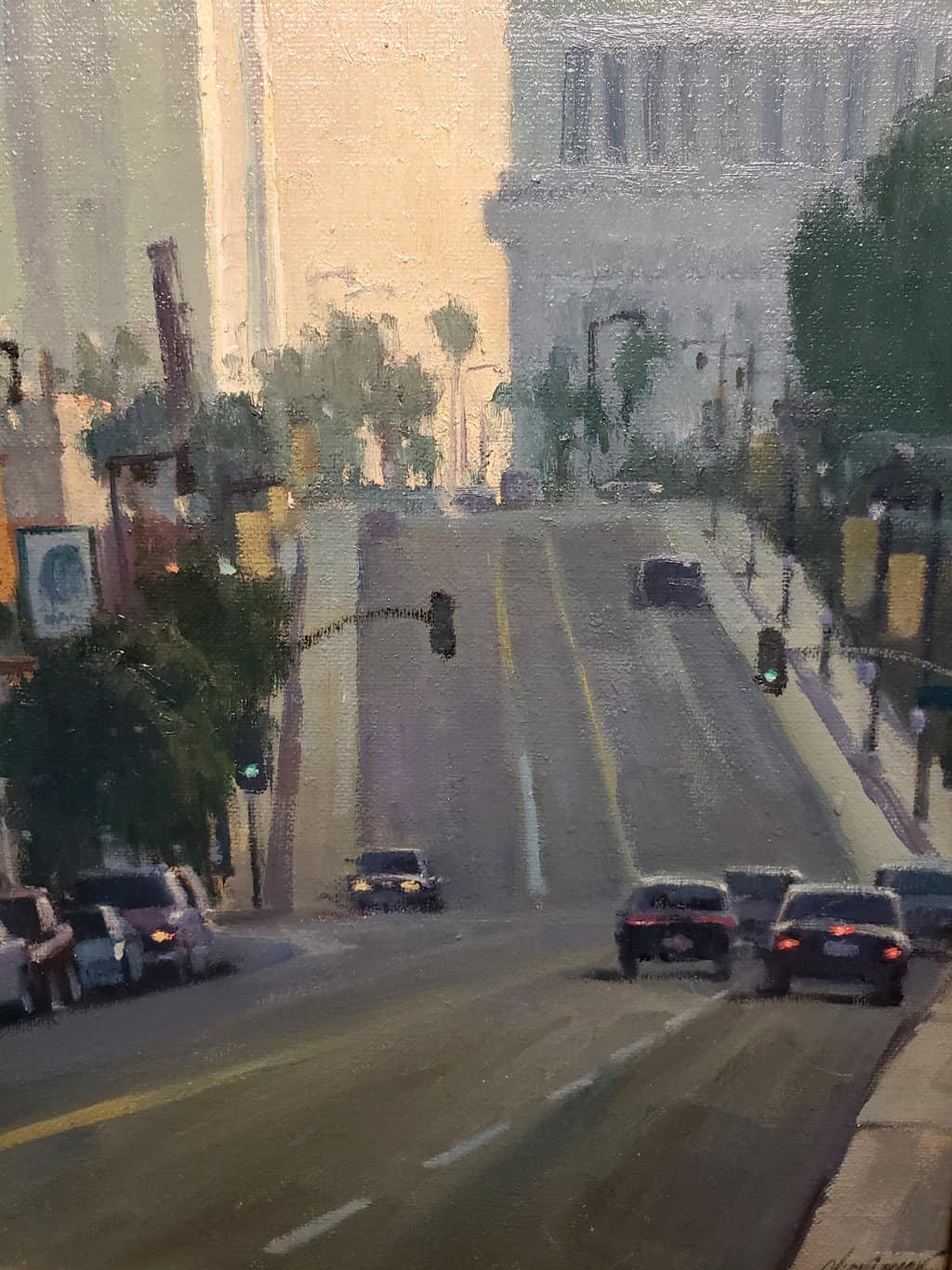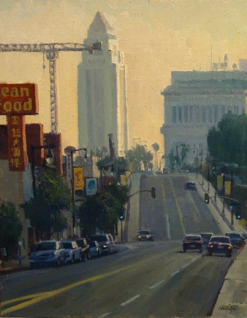 "South on Hill is a view of downtown Los Angeles from Chinatown, looking toward City Hall. I have been painting the downtown area and historic parts of L.A. for a few years now, looking for unique views of a city that I grew up in. There is so much activity and redevelopment going on, and this scene had so many shapes and angles, along with the warm winter light on a quiet weekend afternoon. As soon as I turned the corner and found this scene, I saw a painting. I am always inspired by new views and subjects I've never painted before, and the downtown city life is a never ending source of inspiration for me, a painter from the coast of Laguna Beach."