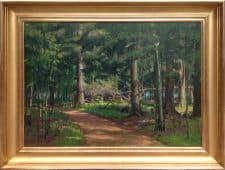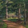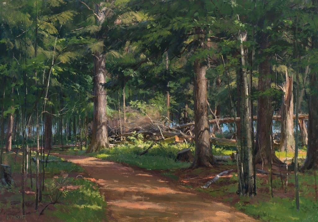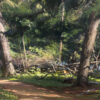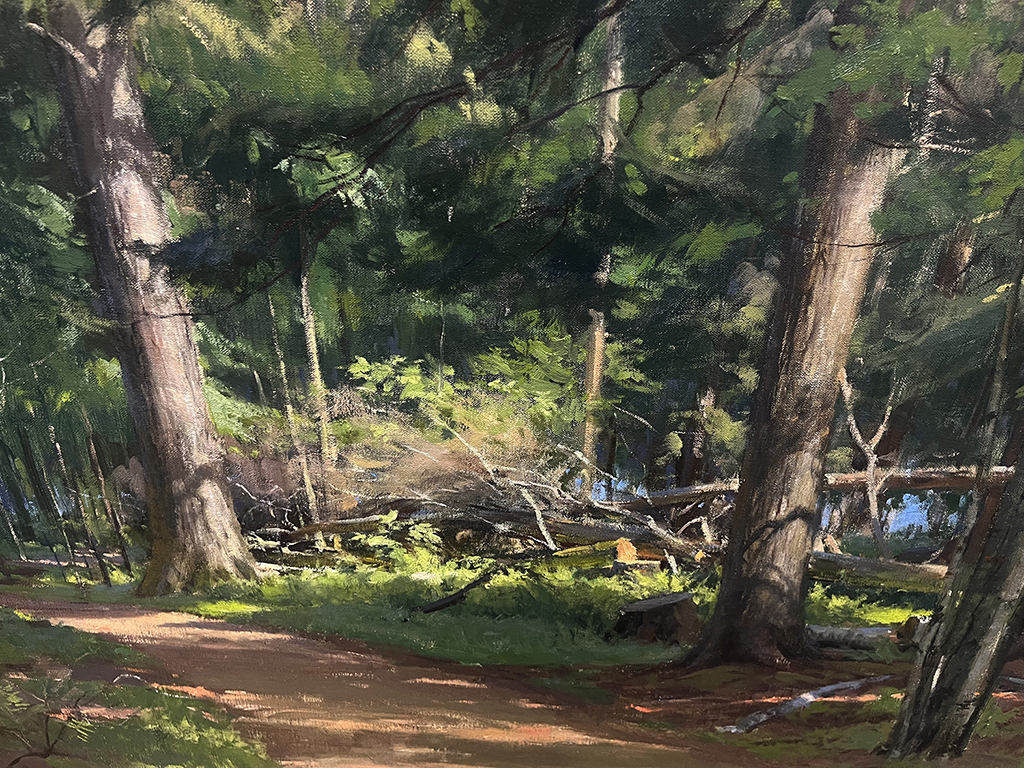 "Both my large field paintings, 'Ojibwe Sunrise' and 'Splintered Hemlock," were created on Madeline Island in Wisconsin over a one-week period and just 20 feet from each other. This particular area is abundant with hemlock and was once Ojibwe tribal land and continues to hold a strong spiritual atmosphere. 'Splintered Hemlock' was painted in afternoon sunlight revealing a recent blow-down after a major storm. Despite the complexity of painting large works en plein air in a forest interior, as well as the scourge of mosquitoes and ticks, it was a peaceful and magical experience."