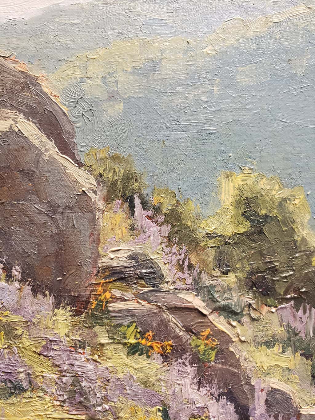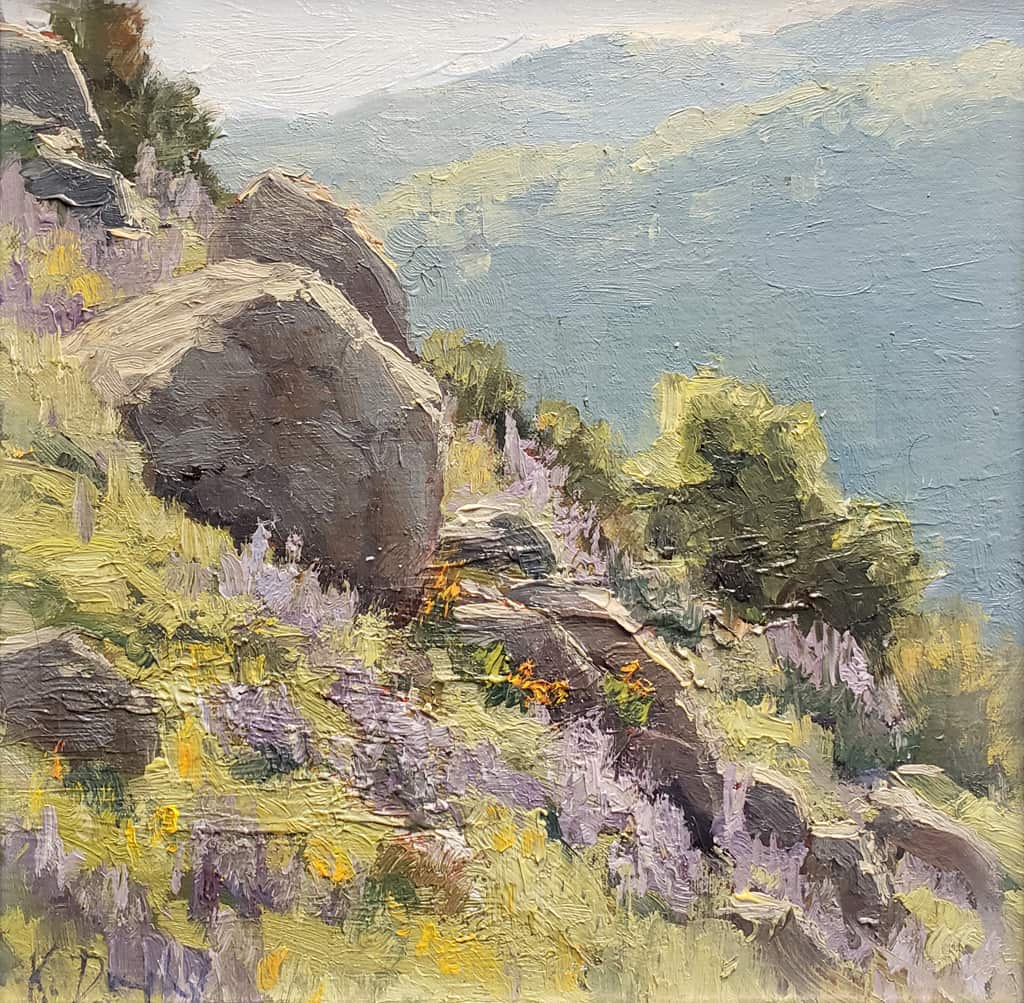 “Spring brought us an abundance of wildflowers this year, turning swaths of the foothills orange with poppies and purple with lupine. The “stay-at-home” order during the early days of the pandemic kept me from plein air painting as often as I would have liked. But, one glorious morning in late April, I slipped out for some socially-distanced painting. The warm sun and bright flowers were just what I needed after days