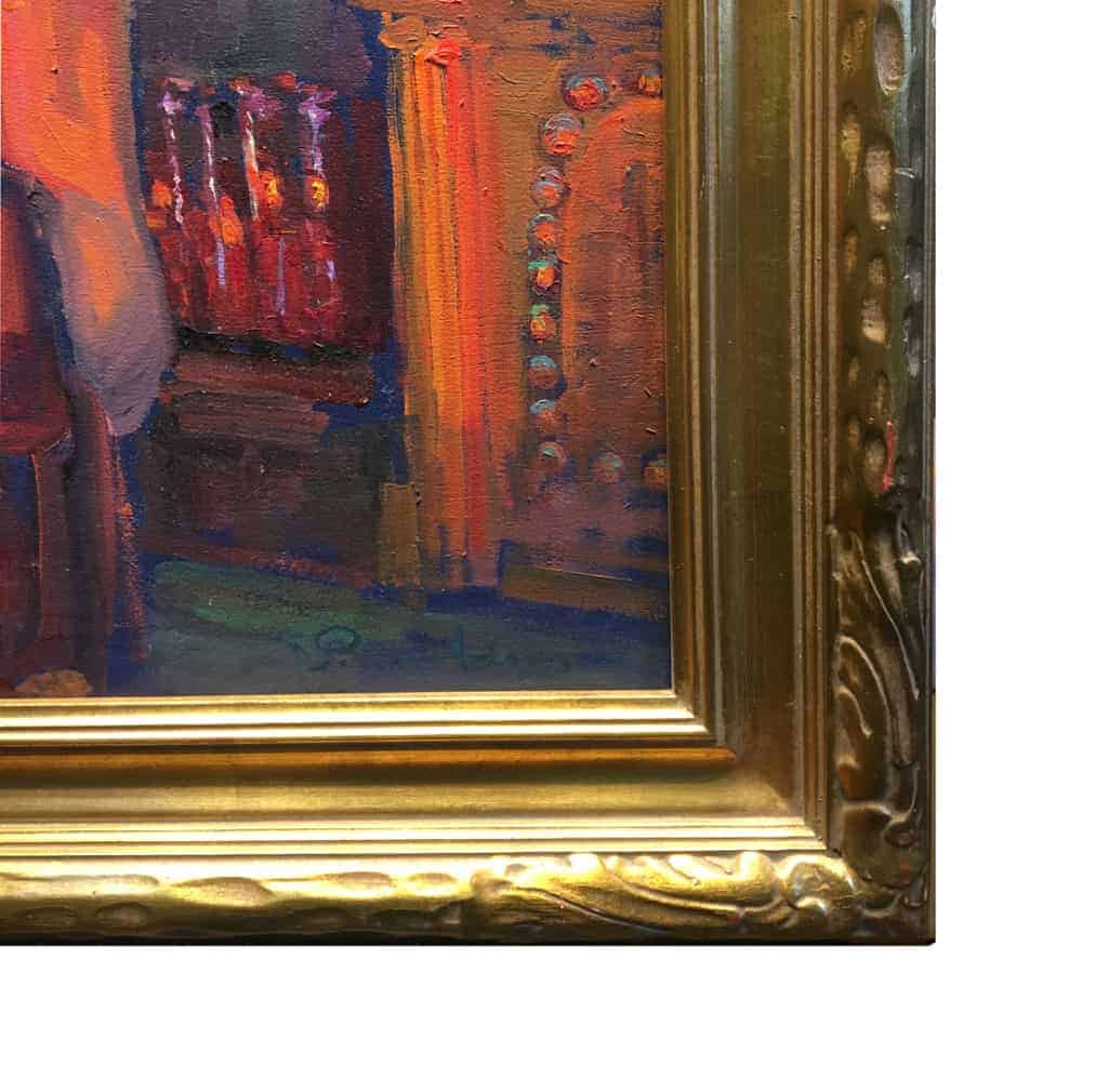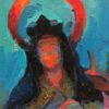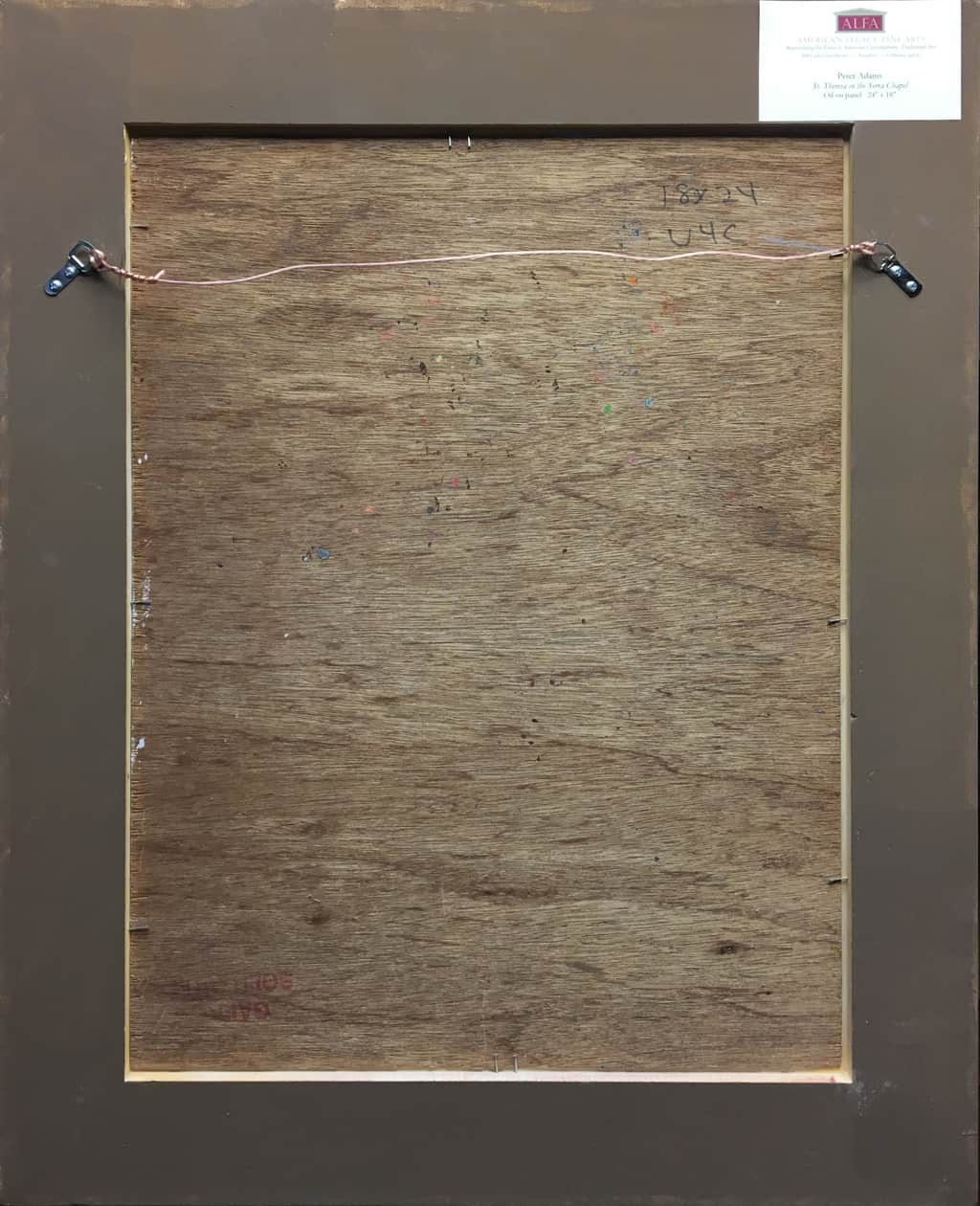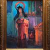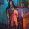 Using a selection of colored lights, the artist Peter Adams illuminated this wooden statue of Saint Teresa of Avila to spontaneously create an aesthetic and contemplative oil painting. The 16th century Spanish Carmelite nun, Saint Teresa, is recognized by the Roman Catholics as one of the thirty-six Doctors of the Church, and the first of four women doctors. The sculpture belongs to the historic Mission San Juan Capistrano in San Juan Capistrano, California, and stands near the altar by the lectern.